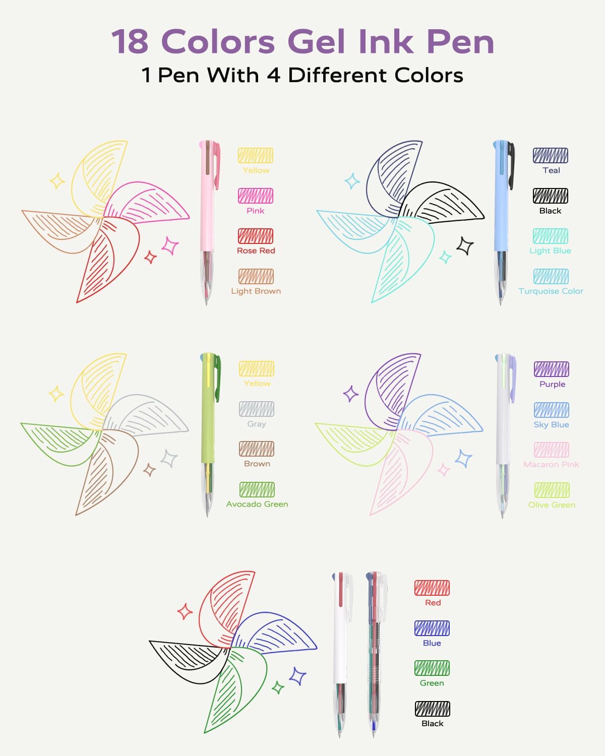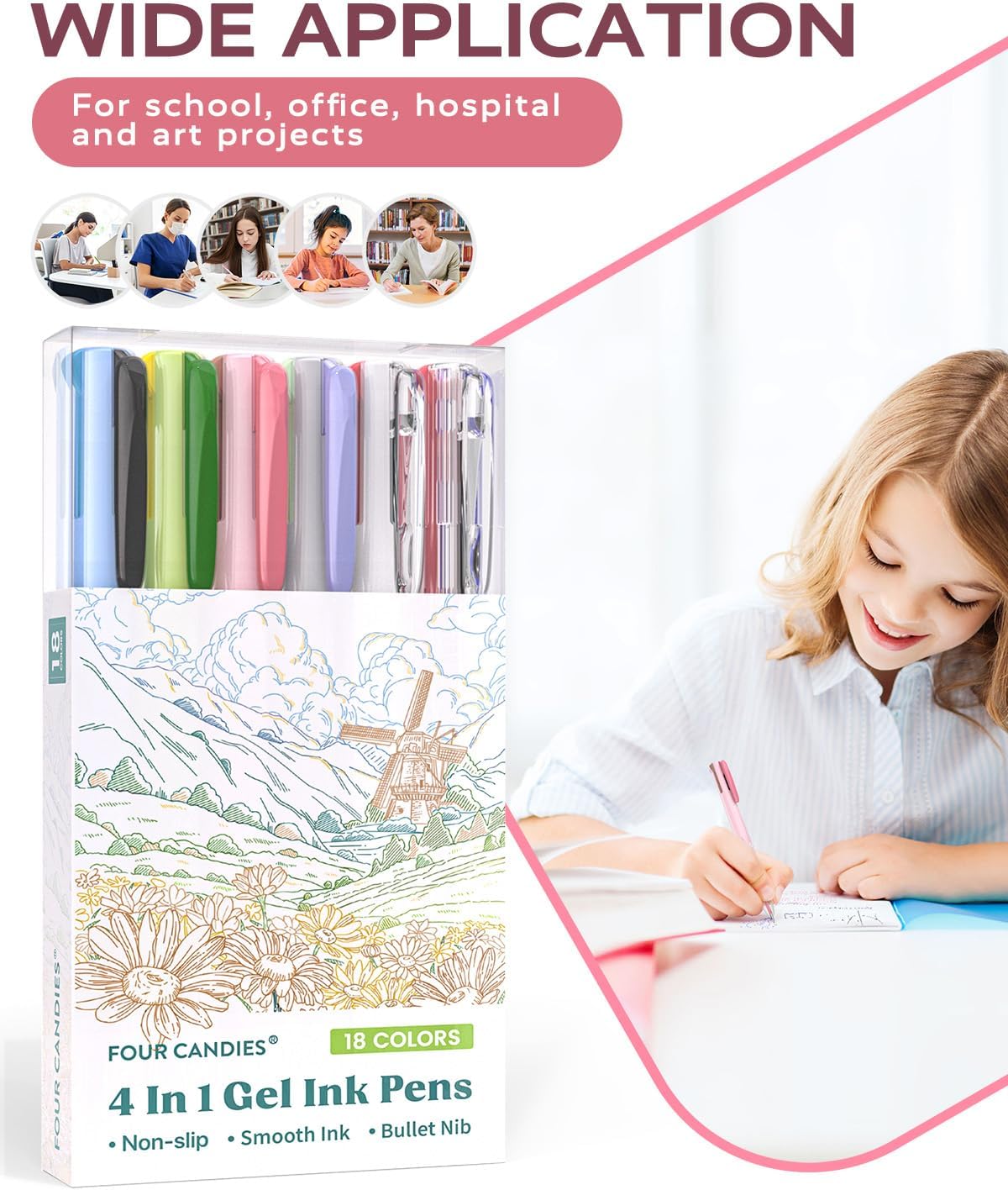 Penna gel colorata 4 in 1: penne multicolore Four Candies con 4 colori di inchiostro diversi, che ti aiutano a cambiare facilmente tra i colori. Queste penne per infermiere sono perfette per prendere appunti, colorare, organizzare e altro ancora, rendendole perfette per la casa, la scuola o l'ufficio. Basta toccare per selezionare il colore preferito Presa sottile e confortevole: la nostra penna multicolore ha un design ergonomico e una presa imbottita, contribuendo a ridurre l'affaticamento della mano anche durante un uso prolungato. Progettato per un controllo e una precisione senza sforzo Inchiostro gel da 0,5 mm: la nostra penna a 4 colori ha una tecnologia di inchiostro ad asciugatura rapida per evitare sbavature o macchie e mantenere la carta pulita. Penne a punta fine da 0,5 mm, perfette per progetti artistici, codifica a colori del testo e scarabocchi. Ogni penna multicolore offre linee chiare e luminose, che rendono facile mantenere il lavoro pulito e organizzato. Ogni punta è sigillata con cera per evitare che l'inchiostro si asciughi. Nota: la cera deve essere rimossa prima di scrivere Varietà di colori: queste penne colorate hanno 18 diversi colori di inchiostro: nero, blu, rosso, verde, viola, rosa macaron, azzurro, verde oliva, verde avocado, marrone, grigio, giallo, rosa, marrone chiaro, rosa rosso, verde acqua, turchese e azzurro Pratica clip: ogni penna da allattamento è progettata con una clip resistente che si attacca saldamente a libri, quaderni o borse facile da trasportare, senza preoccuparsi di perderlo. Ha anche una punta a penna retrattile per una maggiore facilità d'uso, rendendolo una scelta pratica per studenti e insegnanti. Confezione squisita: queste penne per infermieri sono un regalo ideale per studenti, insegnanti, infermieri e chiunque ami scrivere. Con colori vivaci e confezione squisita, delizieranno e daranno un tocco gioioso a qualsiasi compito di scrittura.