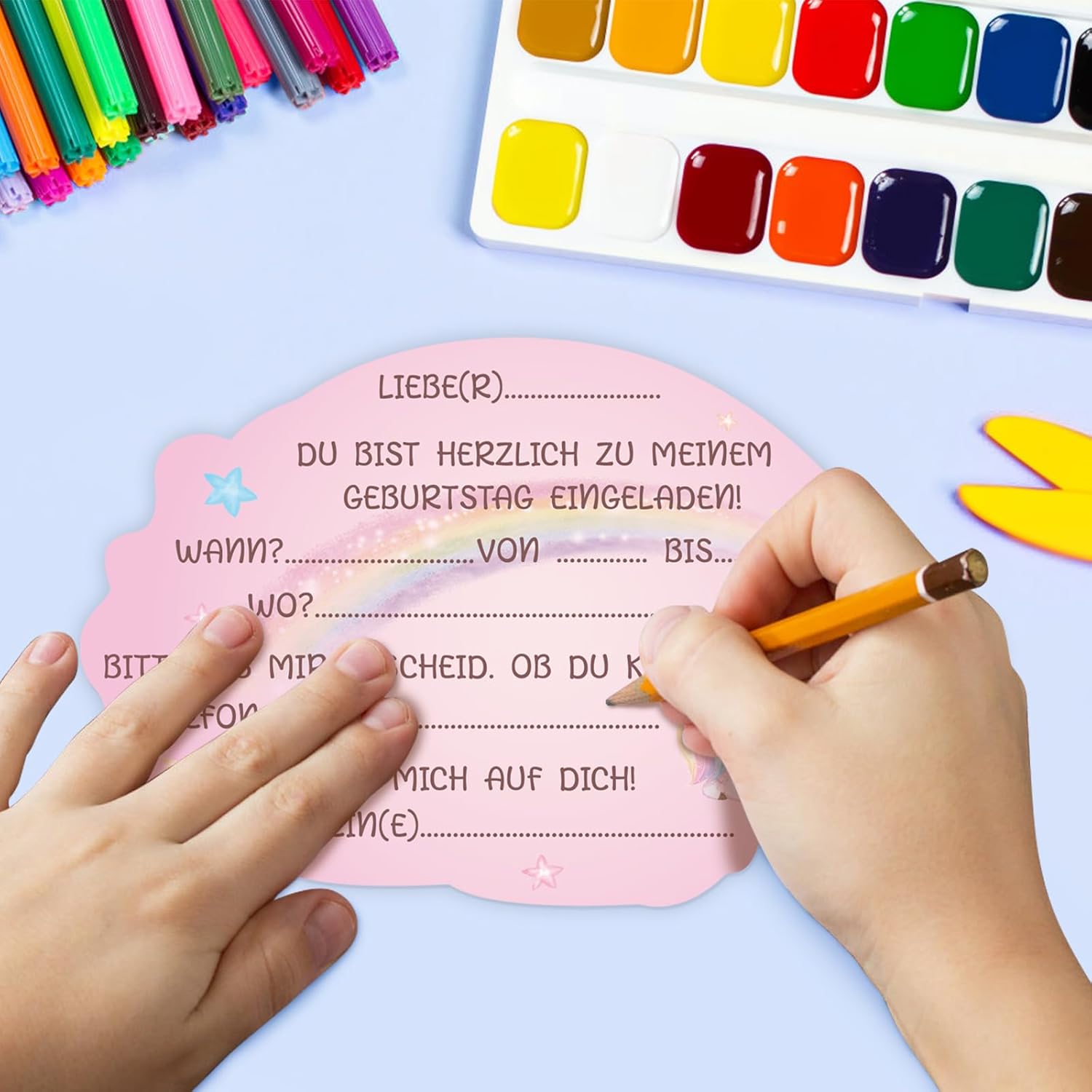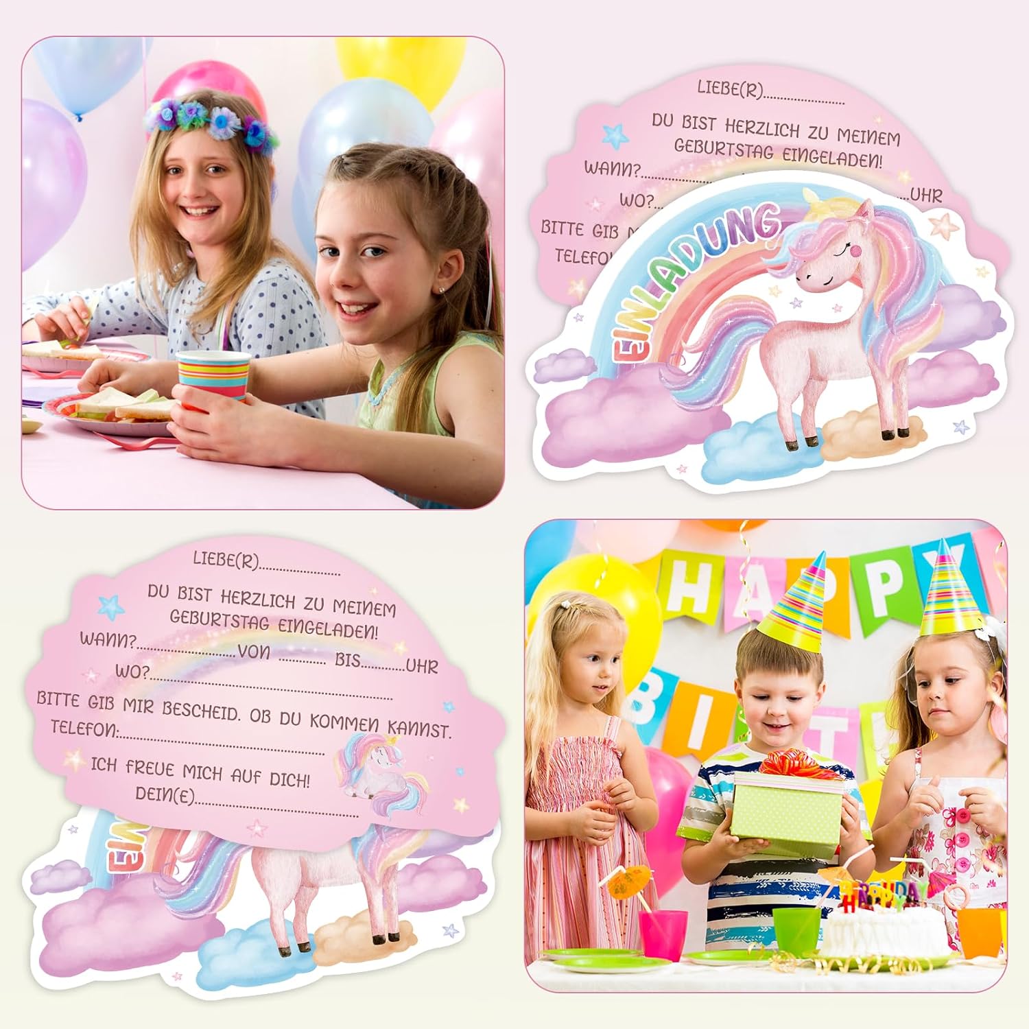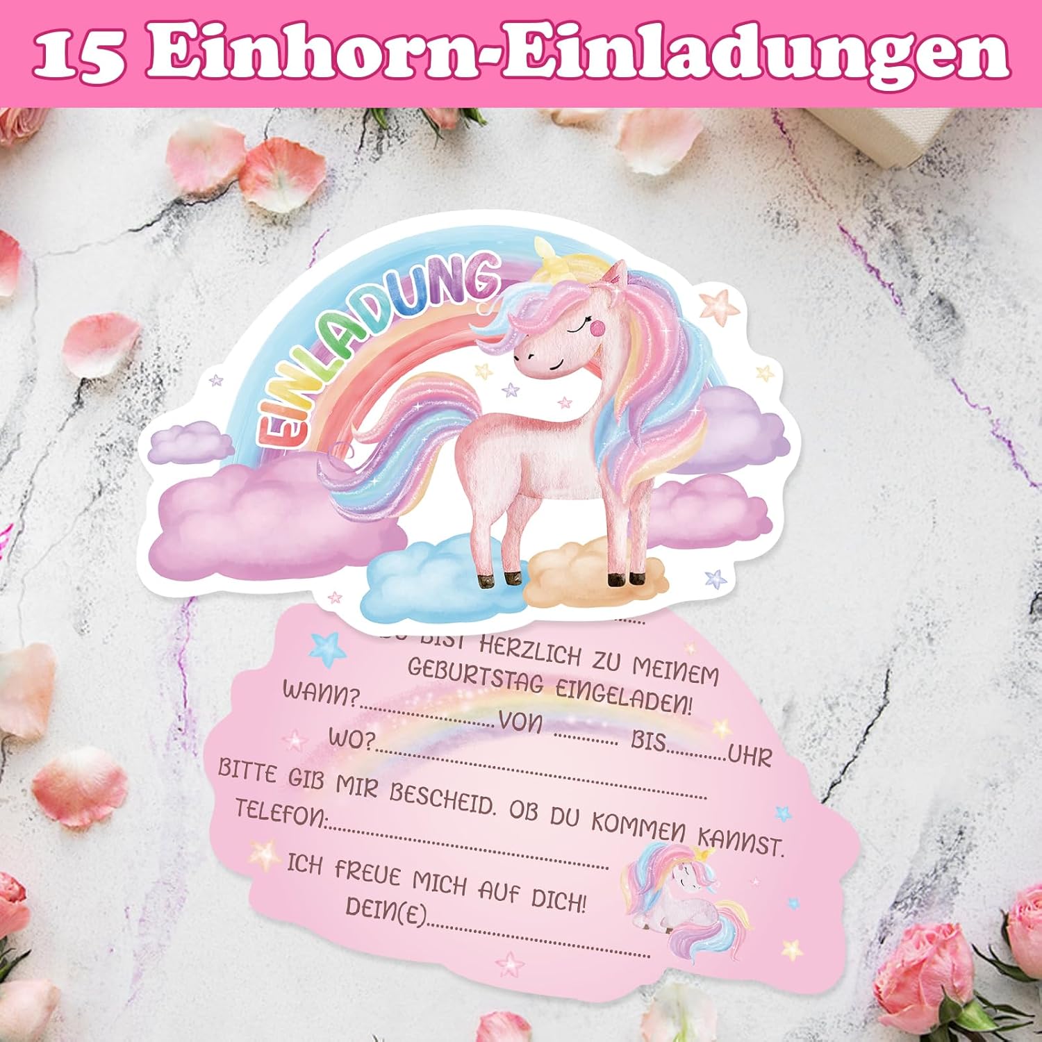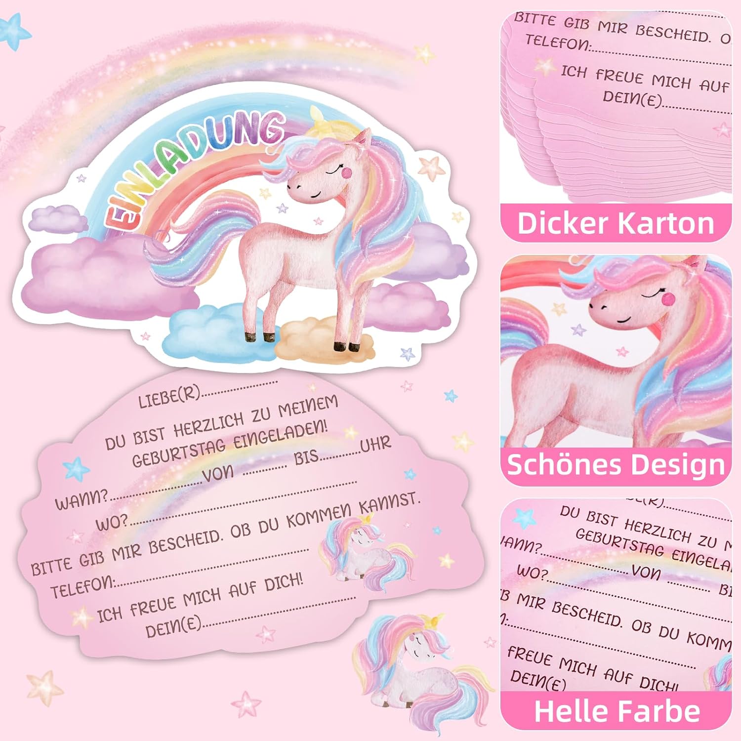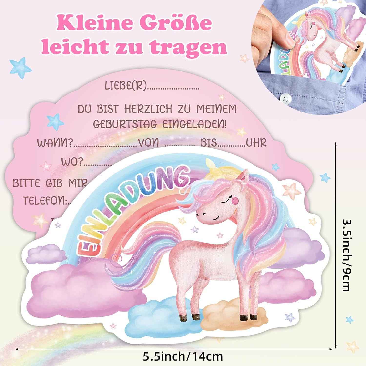 [ Compleanno Unicorno] Riceverai 15 inviti Unicorno, invita tutti i tuoi migliori amici alla tua festa di compleanno Riempimento rapido: il biglietto d'invito con unicorno misura 14 x 9 cm e quindi molto spazio per tutte le informazioni. Il biglietto è formattato in modo da poter scrivere solo i dati chiave più importanti e può essere scritto con tutte le penne comuni [Design unicorno] Gli inviti a unicorno splendidamente stampati con unicorni e arcobaleni sono sicuramente un successo per le bambine e tutti gli ospiti che invitano alla vostra festa di compleanno Materiale: i biglietti d'invito da calcio sono stampati su cartoncino da 300 g/m² e grazie al loro formato compatto si adattano a qualsiasi borsa Per feste di compleanno per bambini, feste in giardino, feste per bambini, feste a tema, feste estive, i biglietti sono l'invito per gli amici