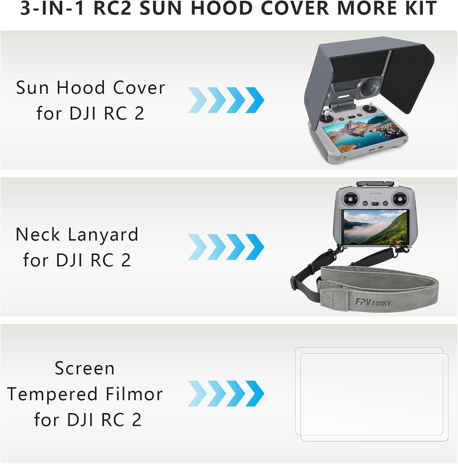 【Kit combinato 3 in 1】 Progettato appositamente per il controller DJI RC 2, si adatta perfettamente come gli accessori originali in termini di vestibilità e facilità d'uso. La confezione include una copertura parasole RC 2, un cordino per il collo RC 2 e una protezione per lo schermo in vetro temperato RC 2. 【Copertura parasole】 Hai bisogno solo di una copertura parasole RC 2 per tutte e tre le funzioni (parasole per DJI RC2, protezione joystick per DJI RC 2, protezione schermo per DJI RC 2). 【Cordino per il collo】 Il corpo principale è realizzato in pelle PU di alta qualità su entrambi i lati e la larghezza del cordino per il collo è di 3,2 cm (1,26 pollici), che è più comodo da indossare. Le viti pieghevoli progettate in modo intelligente non occupano troppo spazio. Una volta piegati sporgono di circa 0,5 cm e possono sostenere più borse e valigie senza dover rimuovere le viti. L'installazione e lo smontaggio possono essere eseguiti manualmente senza strumenti aggiuntivi. 【Pellicola protettiva】Super durezza 9H, HD e alta trasparenza e controllo tattile sensibile, angolo dell'arco 2,5D. La pellicola protettiva utilizza la tecnologia di adsorbimento elettrostatico senza colla, è facile da assorbire e non forma bolle d'aria. 【Protezione completa】Protegge efficacemente lo schermo, i pulsanti e i joystick da polvere e graffi. Con questa protezione solare RC 2 il joystick non deve essere rimosso frequentemente. Puoi riporlo in modo sicuro nella borsa e proteggere completamente il controller DJI RC 2 da eventuali danni. 【Regolazione a 180°】La protezione solare RC 2 utilizza assi di smorzamento di alta qualità che garantiscono un movimento fluido senza strappi. Possono anche rimanere a qualsiasi angolazione, consentendo un utilizzo flessibile e migliorando notevolmente le prestazioni di ombreggiatura. 【Posizionamento preciso】Non influisce sull'uso dei pulsanti. La corda per il collo e le viti dell'ombrellone possono essere serrate a mano senza la necessità di strumenti aggiuntivi. Può essere fissato saldamente al controller DJI Air 3 ed è un ottimo accessorio per il controller DJI Air 3. Contenuto della confezione: 1 copertura parasole per DJI RC 2, 1 cordino per DJI RC 2, 1 pellicola protettiva per DJI RC 2. (Controller non incluso), Offriamo 12 mesi di garanzia/rimborso e un eccellente servizio clienti, se avete domande, non esitate a contattarci.