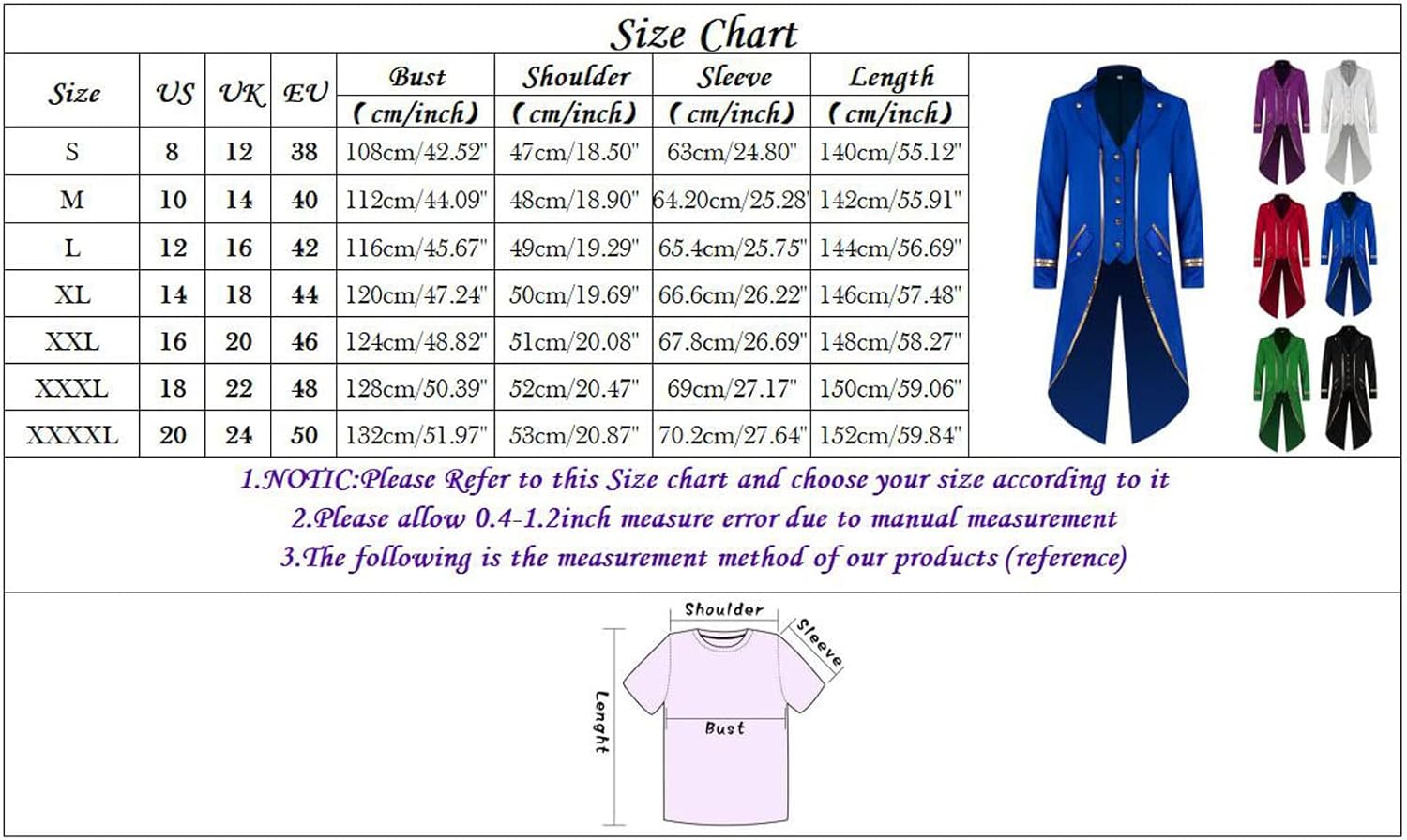Tessuto in poliestere: realizzato con materiali di prima qualità, questo frac medievale Steampunk da uomo garantisce resistenza e uso duraturo pur essendo leggero e confortevole, grazie al suo morbido tessuto in poliestere. Accenti argento stravaganti: questo frac steampunk medievale da uomo vanta splendidi polsini neri risvoltati decorati con intricati motivi di rifiniture argento su entrambi i lati. Migliora il tuo stile: il nostro frac medievale Steampunk da uomo in stile vittorianos aggiungerà un tocco alla moda al tuo guardaroba. Caratterizzato da dettagli intricati come bottoni, polsini e risvolti, è realizzato in tessuto di alta qualità per tutte le stagioni. Ampia applicazione: questo frac steampunk medievale da uomo è un'ottima scelta per costumi di Halloween, cosplay, feste in maschera, riunioni di pianificazione steampunk, spettacoli horror, feste danzanti, sfilate di moda in discoteca e feste a tema rinascimentale e rock. Diverse dimensioni: migliora il tuo guardaroba con questo frac medievale Steampunk da uomo disponibile in colori . regalandoti un look sofisticato e raffinato adatto ad ogni occasione.