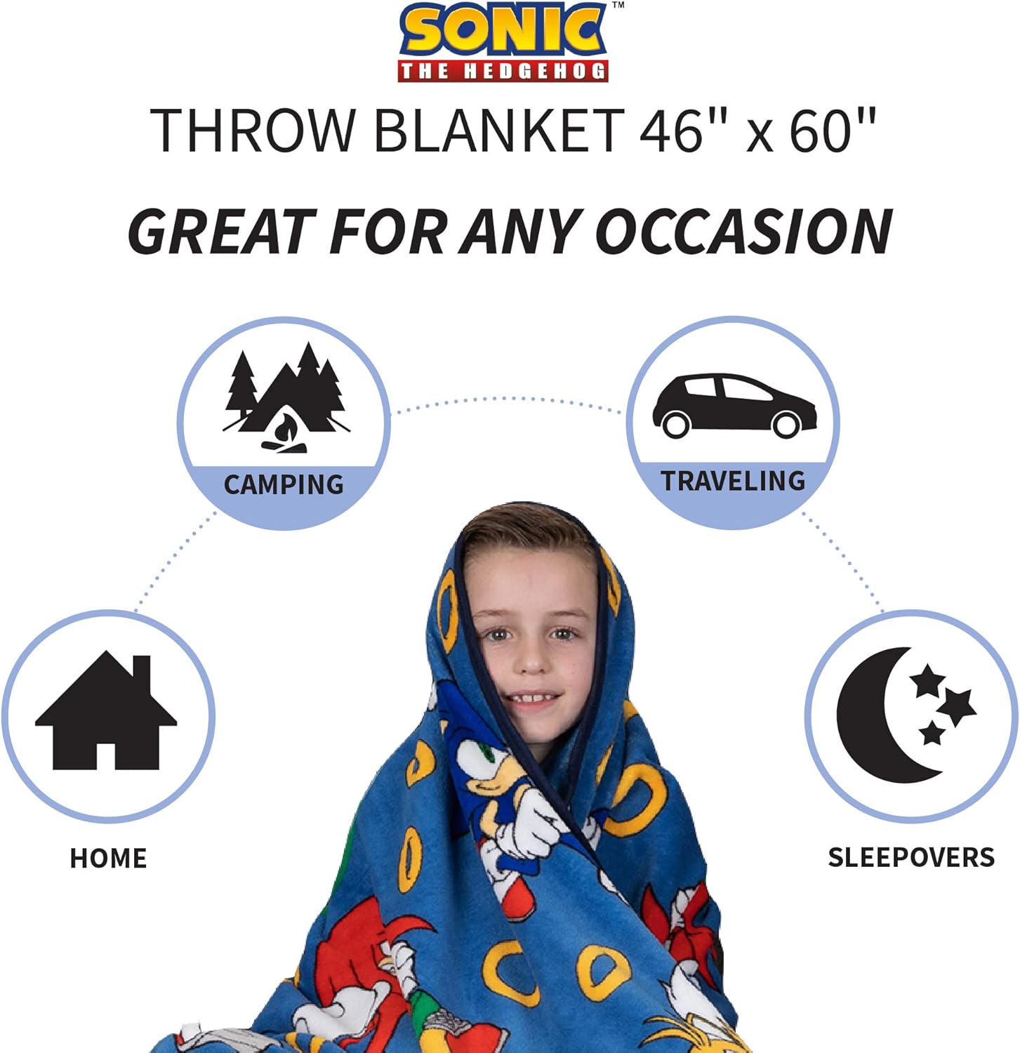 Design sonic The HEDGEHOG: questa fantastica e colorata coperta in peluche con motivo "Rings For All" presenta Sonic, Tails and Knuckles del popolare franchise di videogiochi SEGA. La coperta leggera e facile da trasportare è il compagno perfetto per pigiama party, campeggio, viaggi e giocare. Morbido, morbido e super accogliente: il tuo piccolo giocatore si sentirà al sicuro e avvolto in questa coperta super morbida. Realizzato in peluche Micro Raschel, la consistenza morbida e invitante del materiale di alta qualità aiuta a mantenere i bambini caldi e accoglienti. Facile manutenzione: la coperta può essere gettata nella lavatrice e nell'asciugatrice senza preoccuparsi del motivo a tema colorato e dei personaggi animati dei cartoni animati che svaniscono o della necessità di stirare. Il materiale è resistente alle pieghe che lo rende un'ottima scelta per la camera da letto di ogni bambino, la stanza dei giochi, l'asilo, la scuola o come accessorio per la casa. 116,8 cm x 152,4 cm include: un tiro super morbido e comodo che misura 116,8 cm (larghezza) x 152,4 cm (larghezza). Dimensioni perfette per rannicchiarsi sul divano durante il pisolino per bambini o bambini piccoli durante il viaggio. 157,5 x 228,6 cm La coperta include: una coperta super morbida e comoda che misura 157,5 cm (larghezza) x 228,6 cm (larghezza). Dimensioni perfette per dormire o fare un pisolino e abbastanza grandi da adattarsi a un letto matrimoniale standard o full size o da usare sul divano.