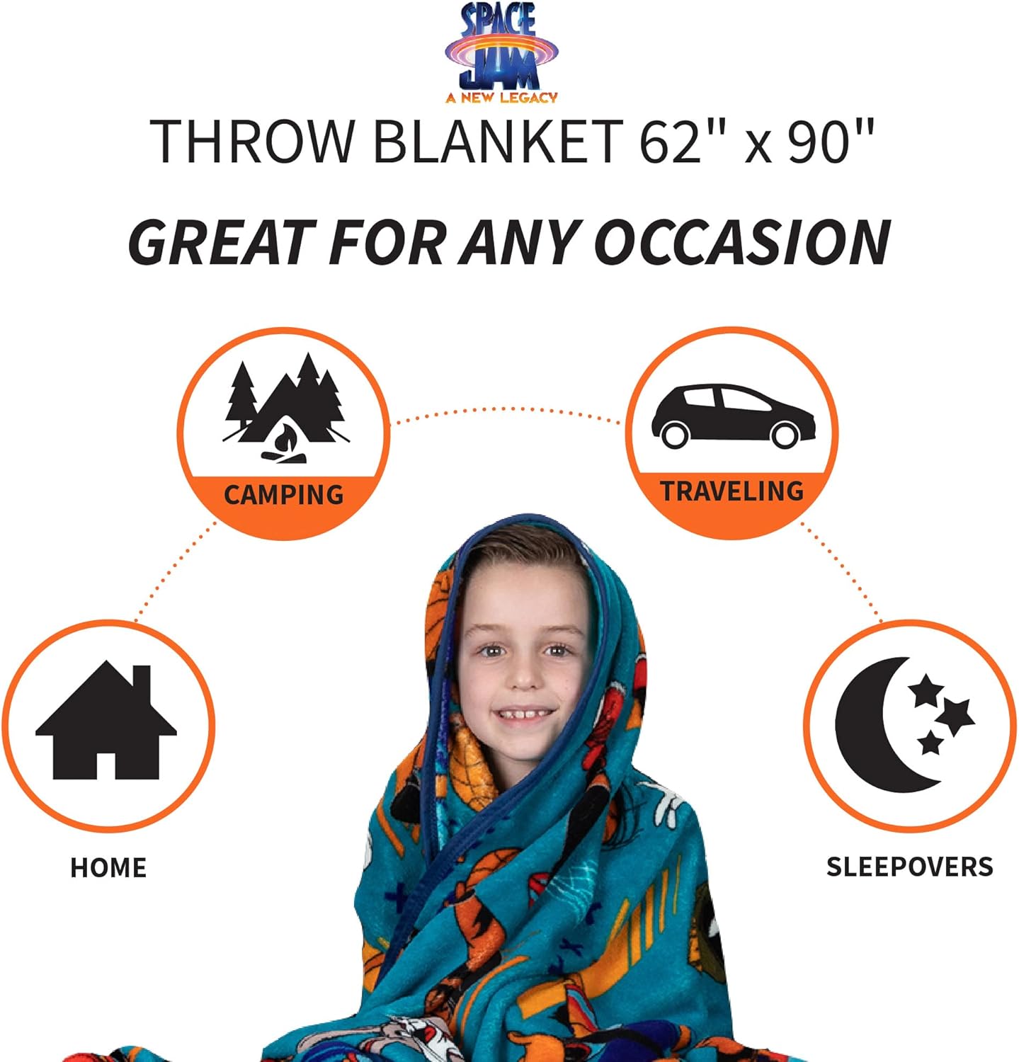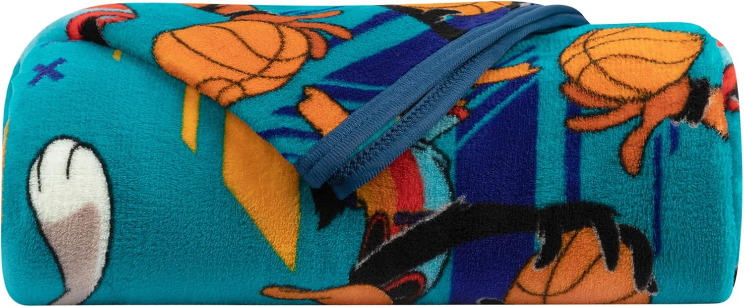 SPACE JAM 2 UN NUOVO DESIGN LEGACY: questa coperta in peluche con motivo "Inbound Pass" presenta la leggenda del basket LeBron James e Looney Tunes leggende Bugs Bunny, Daffy Duck e Marvin il marziano della funzione WB, Space Jam 2. La coperta leggera e facile da trasportare è il compagno di squadra perfetto per pigiama party, campeggio, viaggi e gioco. Morbido, soffice e super accogliente: la tua futura stella del basket si sentirà al sicuro e al sicuro avvolto in questa coperta super morbida. Realizzato in peluche Micro Raschel, la consistenza morbida e invitante del materiale di alta qualità aiuta a mantenere i bambini caldi e accoglienti. Facile manutenzione: la coperta può essere gettata in lavatrice e asciugatrice senza preoccuparsi che il motivo colorato a tema e i personaggi dei cartoni animati sbiadiscano o la necessità di stiratura. Il materiale è resistente alle pieghe, il che lo rende un'ottima scelta per la camera da letto di qualsiasi bambino, asilo nido, scuola o come accessorio decorativo per la casa. 116,8 x 152,4 cm include: un copriletto super morbido e confortevole che misura 116,8 cm (larghezza) x 152,4 cm (lunghezza). Dimensioni perfette per accoccolarsi sul divano durante il pisolino per bambini o bambini durante il viaggio. La coperta da 157,5 x 228,6 cm include: una coperta super morbida e confortevole che misura 157,5 cm (larghezza) x 228,6 cm (lunghezza). Dimensioni perfette per dormire o fare un pisolino e abbastanza grande per adattarsi a un letto matrimoniale standard o matrimoniale o da utilizzare sul divano.