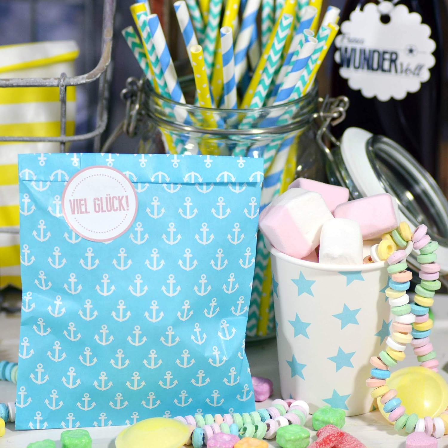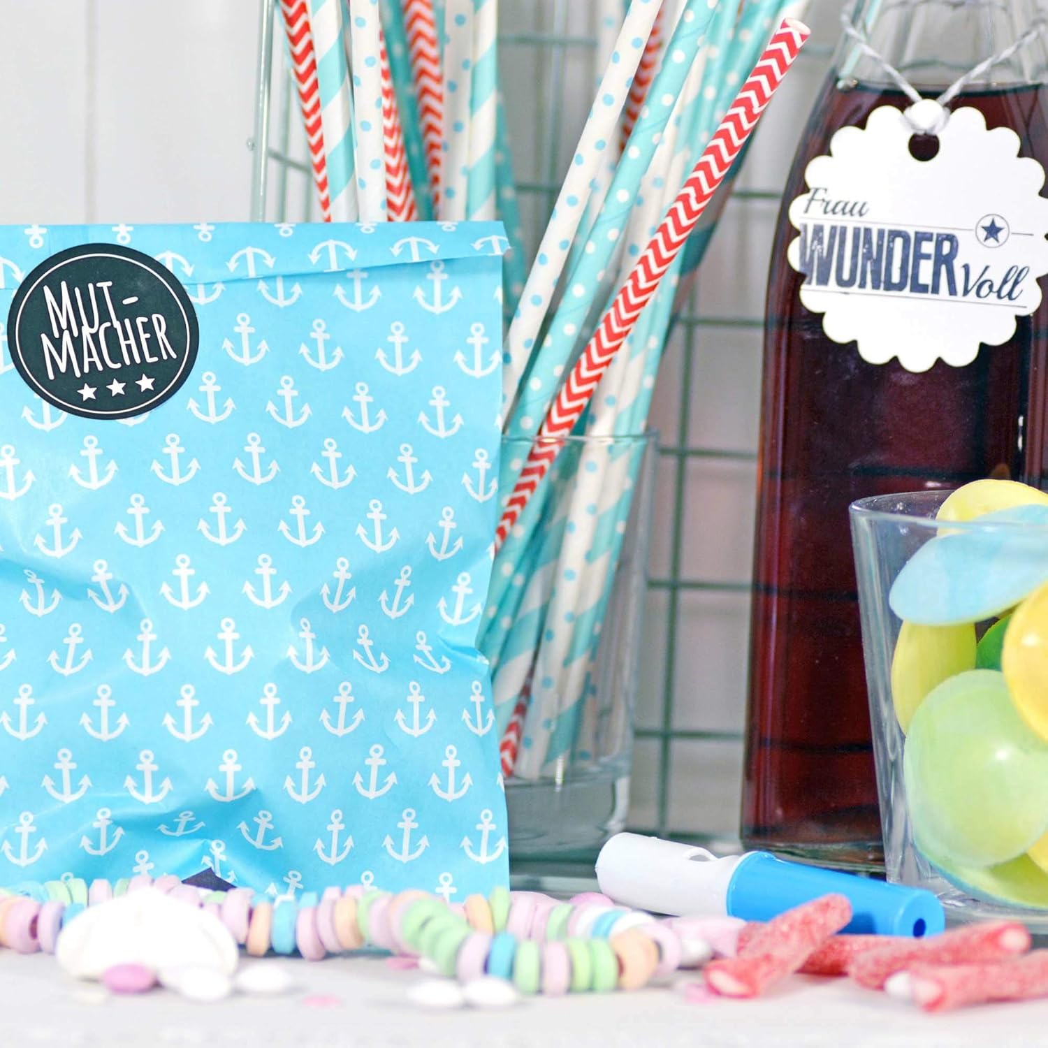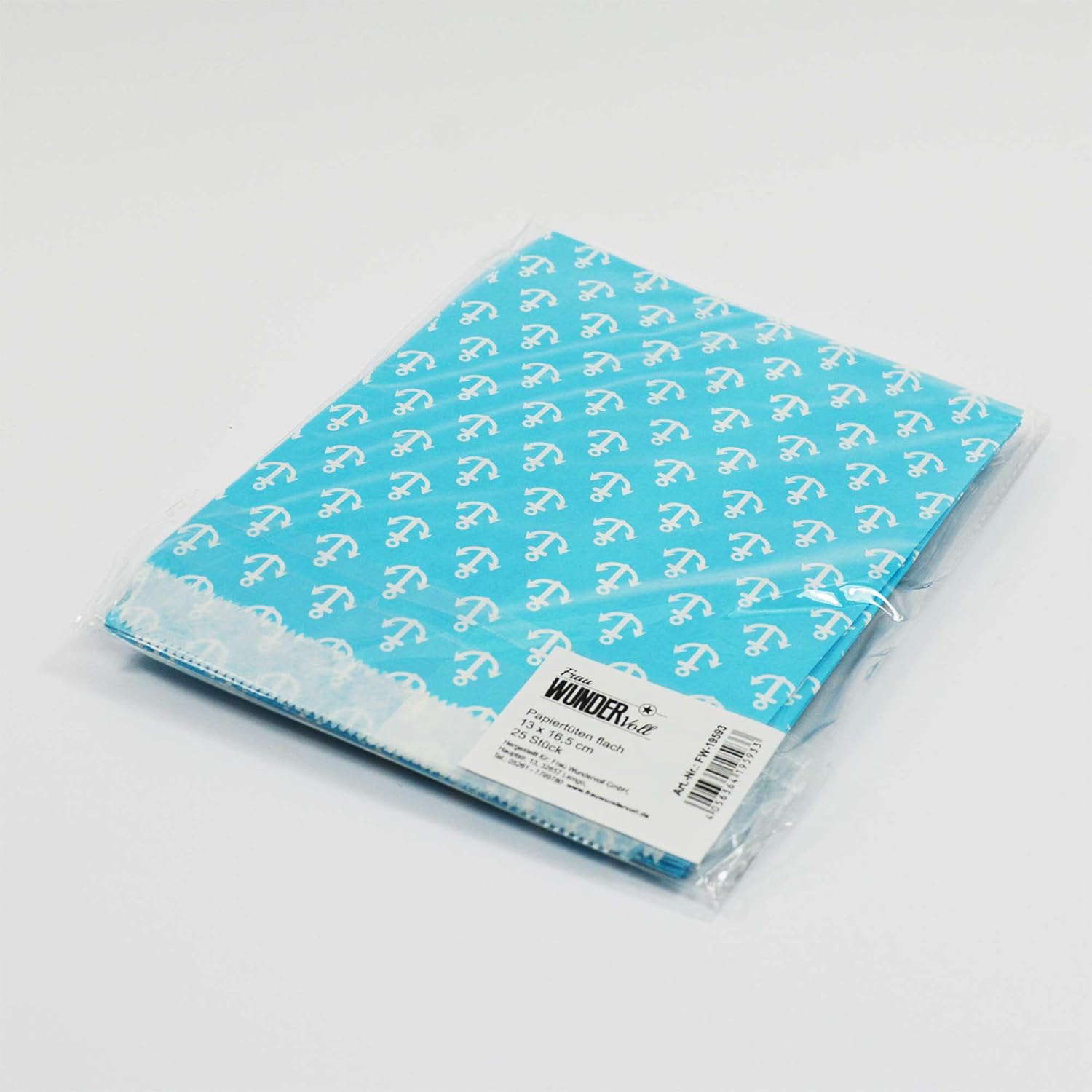 Frau WunderVoll® 25 SACCHETTI DI CARTA BEACH BLUE, ancora 13 x 16,5 cm, 45 grammi di carta, piatti/barrette di caramelle, matrimonio, compleanno di bambini, sacchetti di carta, sacchetti di caramelle, sacchetti, sacchetti per feste