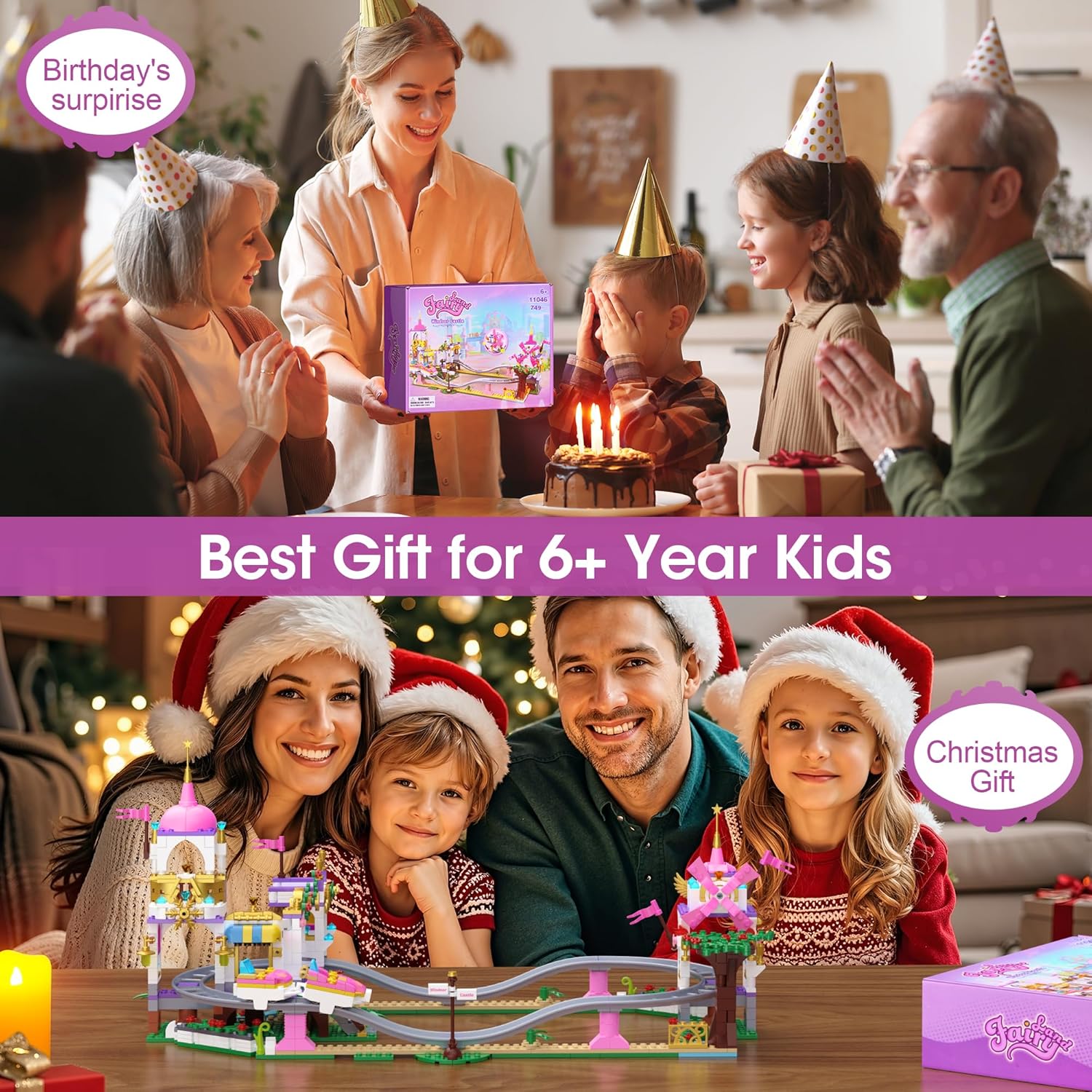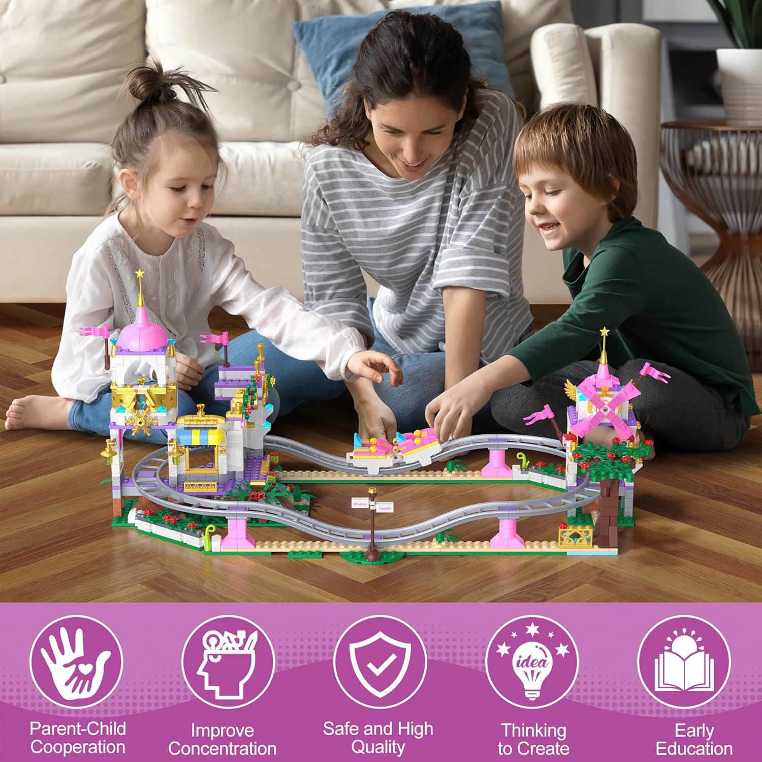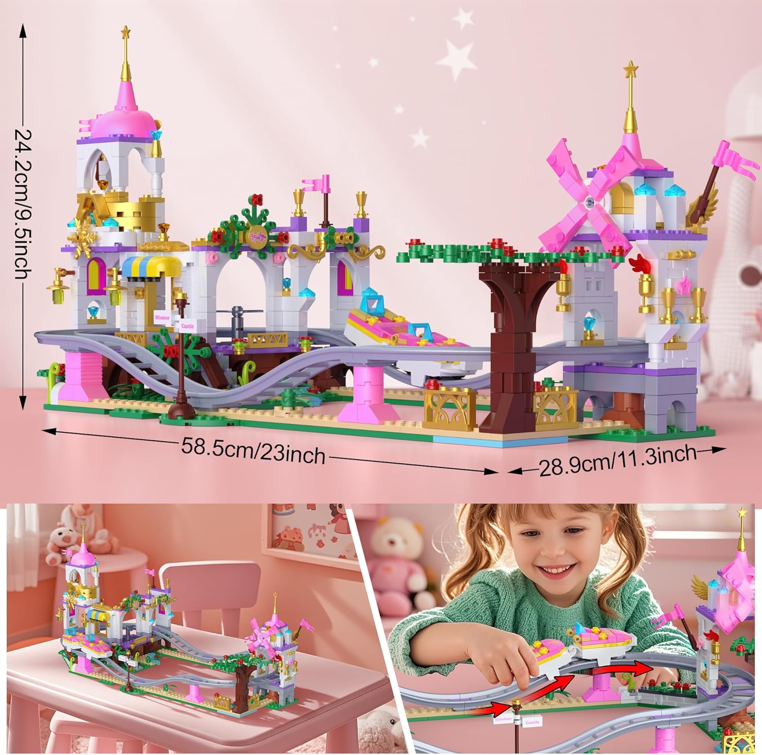 【Avventura nel castello magico】 Questo set da castello fantasy da 749 pezzi con montagne russe combina torri rosa da favola, dettagli dorati scintillanti e una pista tortuosa che dà vita alla scena. I bambini potranno guidare i carretti attorno al castello, vivere infinite avventure e godersi sia la bellezza di un mondo da favola che l'emozione delle montagne russe. Perfetto per i bambini creativi. 【Decorazione e presentazione affascinante】 Una volta completato, il castello con le sue torri rosa, gli archi delicati e gli ornamenti dorati diventa un magnifico pezzo decorativo. Posizionato su una scrivania, su una mensola o nella cameretta dei bambini, porta colore e fantasia. Non è solo un giocattolo, ma anche una decorazione che illumina la stanza e ricorda ai bambini le loro avventure immaginarie. 【Promuove l'interazione genitore-figlio】 Costruire le montagne russe del castello è divertente da fare da soli, ma diventa ancora più significativo con la partecipazione dei genitori. Costruire insieme incoraggia il lavoro di squadra, la comunicazione e la pazienza, trasformando questo giocattolo in un'attività preziosa per rafforzare i legami familiari e stimolare la creatività e il pensiero logico.,Gioco sicuro e durevole: realizzati in plastica ABS atossica di alta qualità con bordi lisci, i mattoncini sono sicuri per i bambini. Il castello tiene saldamente e la pista è progettata per il gioco ripetuto. I bambini possono montare e smontare i pezzi senza preoccupazioni, rendendolo un giocattolo durevole di cui genitori e bambini possono divertirsi.,Regalo ideale: questo set di castelli fantasy da 749 pezzi con montagne russe è una meravigliosa scelta regalo per compleanni, Natale o festa dei bambini. Le sue torri rosa, i dettagli dorati e i binari lisci creano un'atmosfera magica che i bambini adoreranno, fornendo divertimento e valore decorativo duraturo