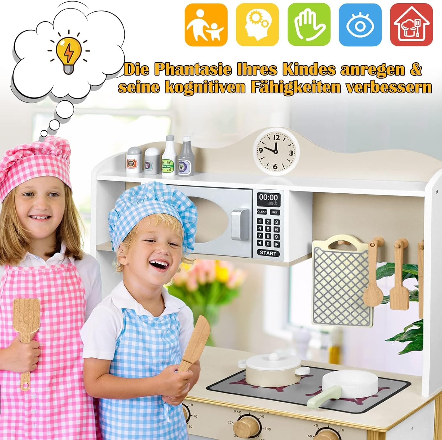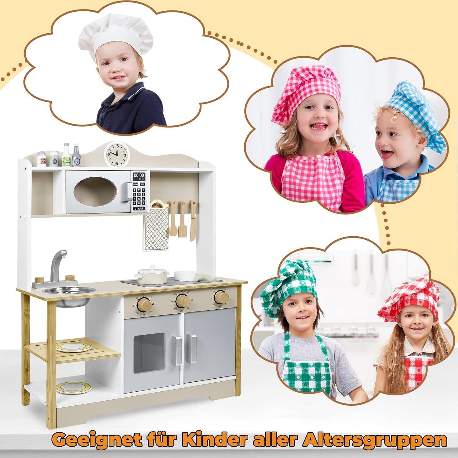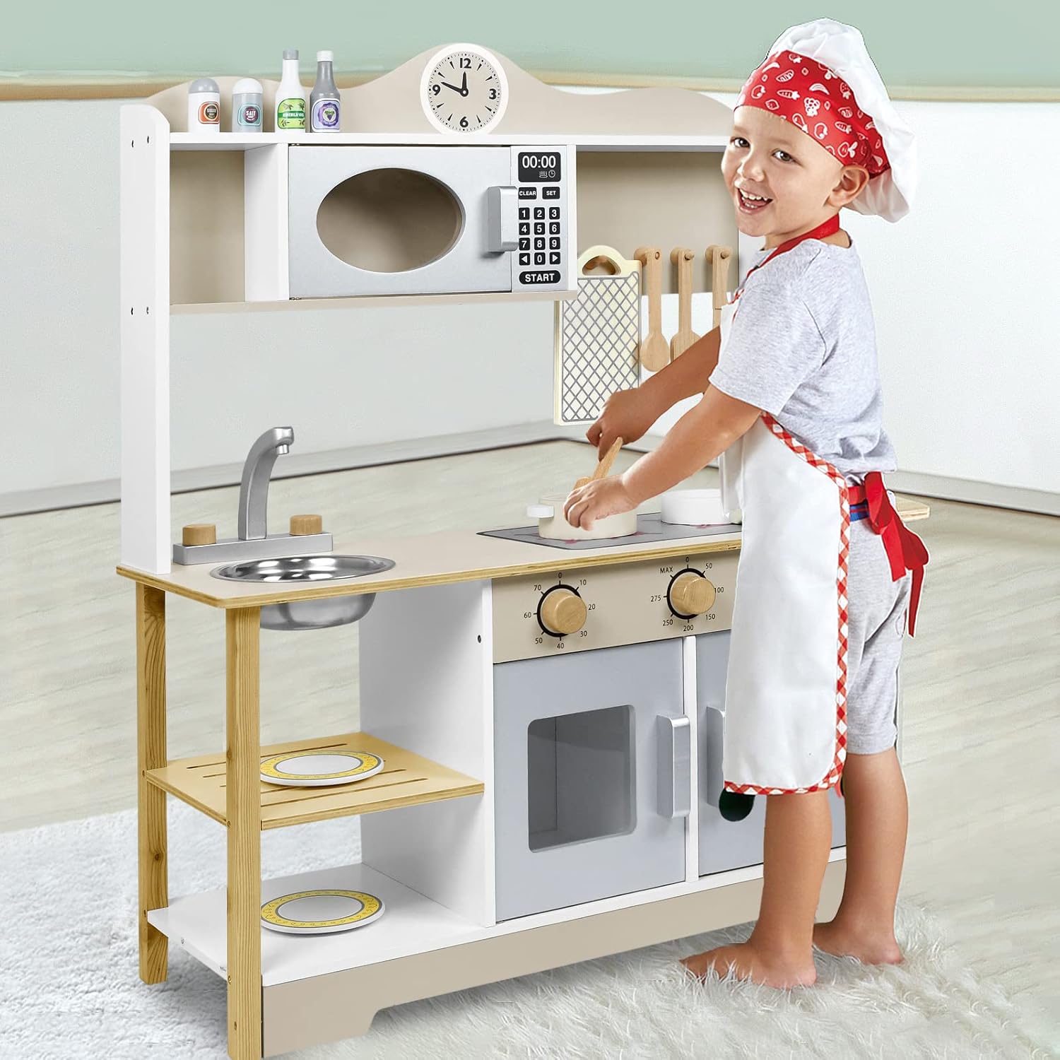 Cucina per bambini, materiale: MDF. Colore principale: colore legno + bianco. Dimensioni: 68 x 26 x 78 cm. Migliora efficacemente la percezione della cucina e del tempo per i bambini e conosci l'uso di utensili da cucina. I bambini presentano i propri modelli di cucina giocattoli a familiari e amici, migliorando così le loro abilità sociali ed espressione Sicuro e durevole: la cucina per bambini è composta da lastre di legno spesse e un rivestimento colorato a base d'acqua ecologico, sicuro e non tossico. I bordi arrotondati sono progettati in modo che i bambini non vengano graffiati durante il gioco. Il bambino si diverte e la madre è più rilassata Facile da montare: questo giocattolo da cucina per bambini Froadp ha una costruzione integrata che è stabile e resistente alla deformazione. Il montaggio è molto comodo e può portare alle abilità pratiche dei bambini. I genitori possono anche riunirsi con i loro figli per divertirsi genitore-figlio insieme Ricchi accessori da cucina: la cucina da gioco viene fornita con vari accessori da cucina: 1 ciotola, 1 coltello, 1 spatola, 1 cucchiaio, 1 tagliere, 1 pentola da minestra, 1 coperchio per padella, 1 piattino e 2 bottiglie di spezie, 2 contenitori per spezie, 2 sacchetti per viti, 1 fissaggi magnetici. Completamente attrezzata, simula una vera cucina e offre ai bambini un'esperienza culinaria coinvolgente Regalo perfetto: una cucina per bambini è il regalo perfetto per un ragazzo o una ragazza. Quindi, i bambini possono trasformarsi in piccoli chef, giocare a giochi di casa allegri, immaginare storie diverse, soddisfare il desiderio dei bambini di imitare la cucina degli adulti e lasciare che i bambini sfruttino appieno la loro immaginazione e creatività