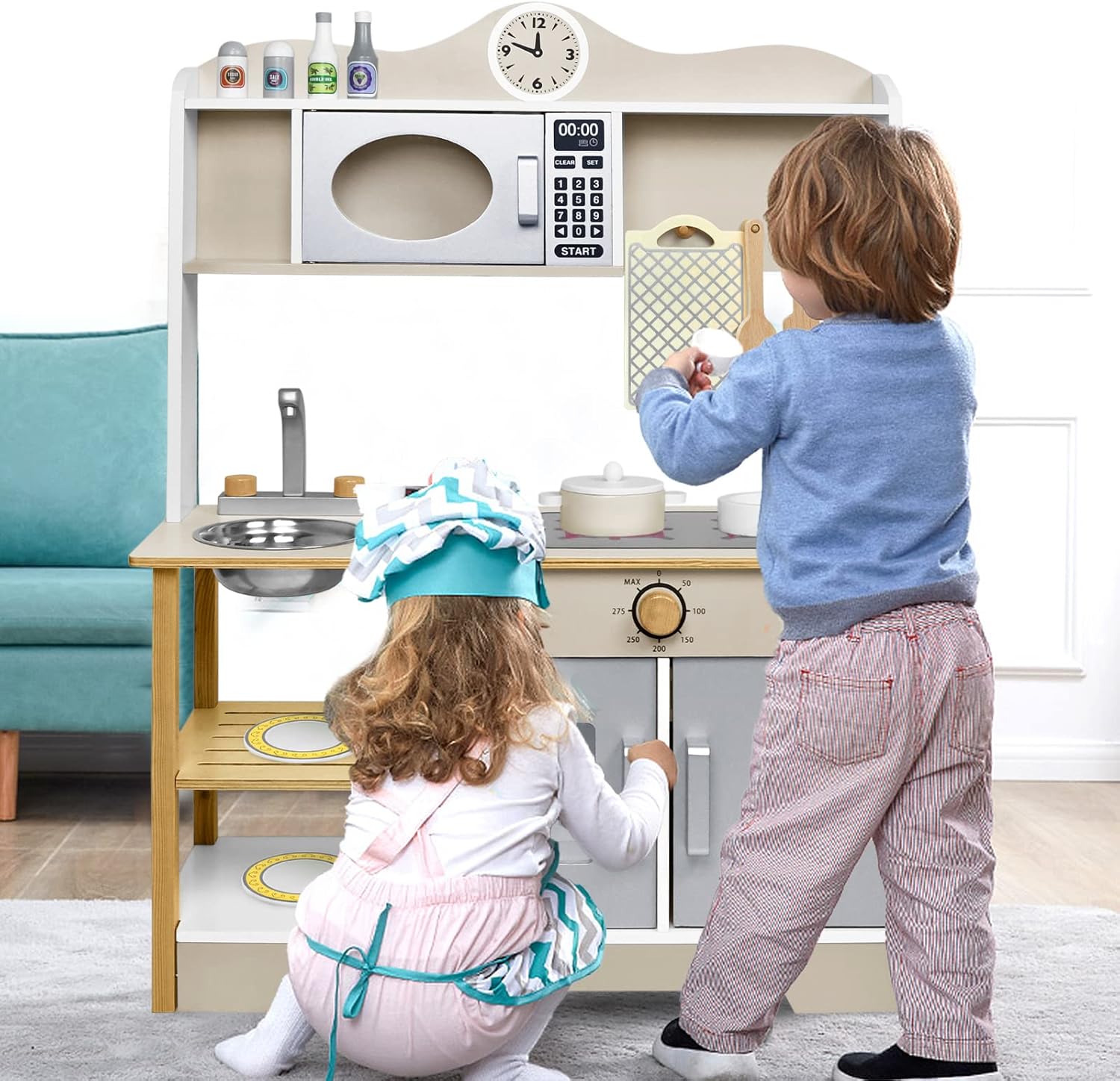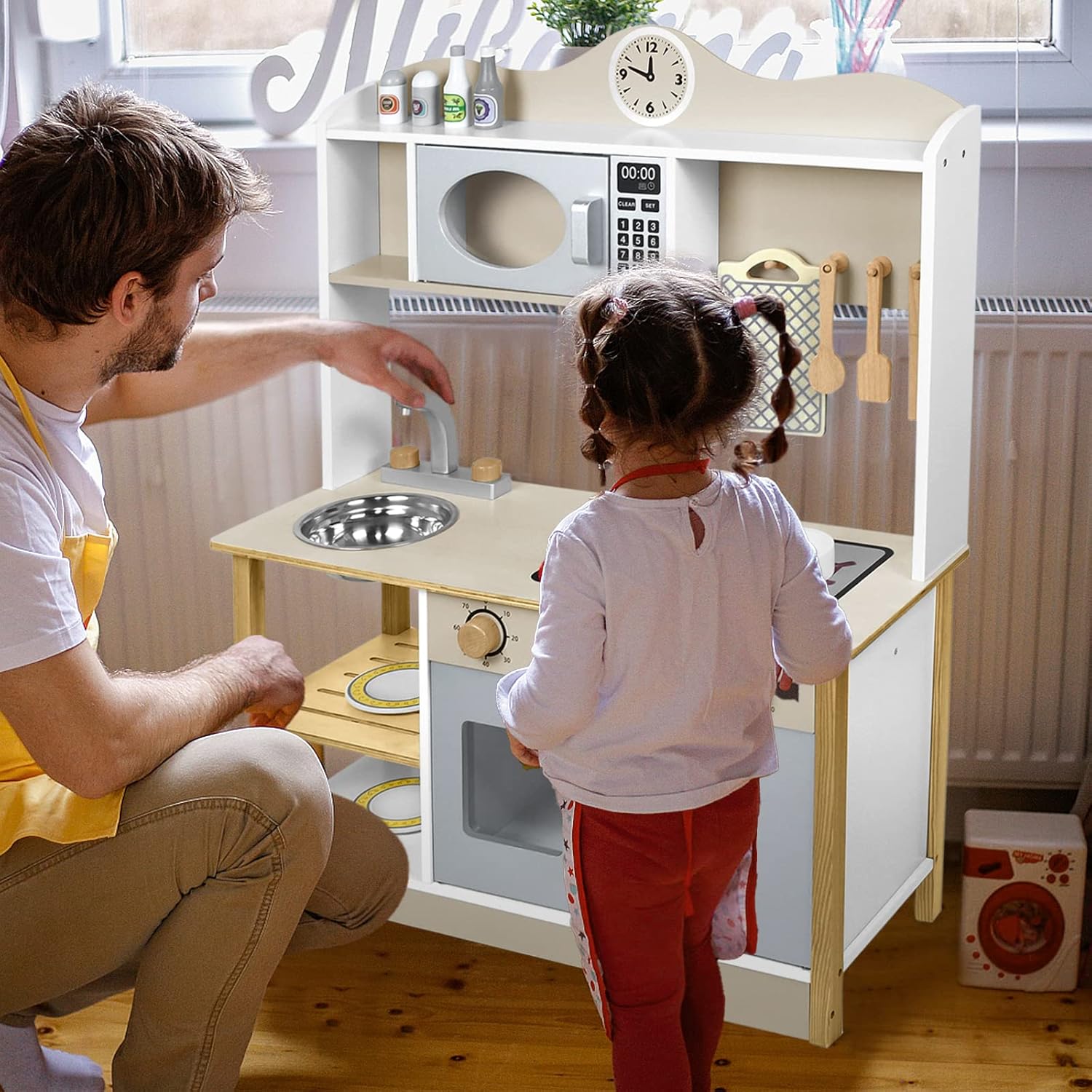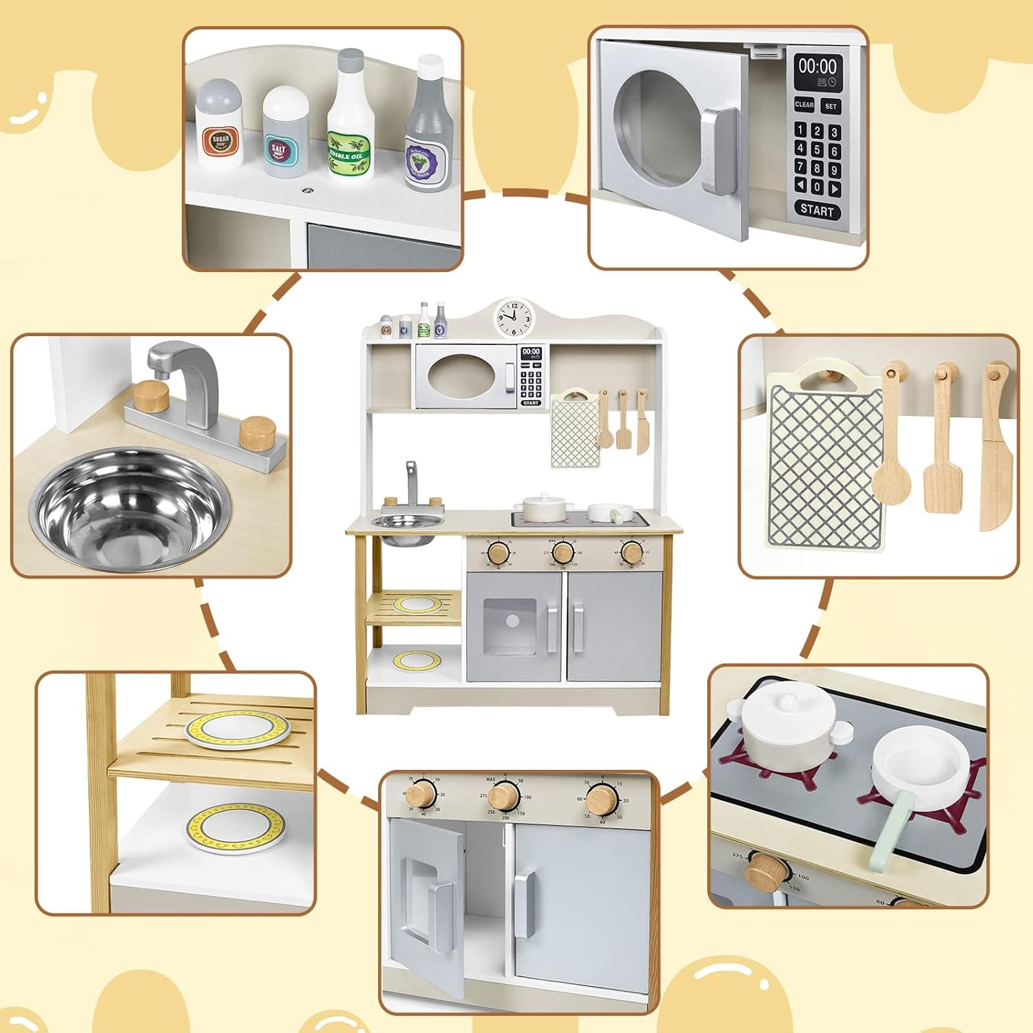 Cucina per bambini, materiale: MDF. Colore principale: colore legno + bianco. Dimensioni: 68 x 26 x 78 cm. Migliora efficacemente la percezione della cucina e del tempo per i bambini e conosci l'uso di utensili da cucina. I bambini presentano i propri modelli di cucina giocattoli a familiari e amici, migliorando così le loro abilità sociali ed espressione Sicuro e durevole: la cucina per bambini è composta da lastre di legno spesse e un rivestimento colorato a base d'acqua ecologico, sicuro e non tossico. I bordi arrotondati sono progettati in modo che i bambini non vengano graffiati durante il gioco. Il bambino si diverte e la madre è più rilassata Facile da montare: questo giocattolo da cucina per bambini Froadp ha una costruzione integrata che è stabile e resistente alla deformazione. Il montaggio è molto comodo e può portare alle abilità pratiche dei bambini. I genitori possono anche riunirsi con i loro figli per divertirsi genitore-figlio insieme Ricchi accessori da cucina: la cucina da gioco viene fornita con vari accessori da cucina: 1 ciotola, 1 coltello, 1 spatola, 1 cucchiaio, 1 tagliere, 1 pentola da minestra, 1 coperchio per padella, 1 piattino e 2 bottiglie di spezie, 2 contenitori per spezie, 2 sacchetti per viti, 1 fissaggi magnetici. Completamente attrezzata, simula una vera cucina e offre ai bambini un'esperienza culinaria coinvolgente Regalo perfetto: una cucina per bambini è il regalo perfetto per un ragazzo o una ragazza. Quindi, i bambini possono trasformarsi in piccoli chef, giocare a giochi di casa allegri, immaginare storie diverse, soddisfare il desiderio dei bambini di imitare la cucina degli adulti e lasciare che i bambini sfruttino appieno la loro immaginazione e creatività