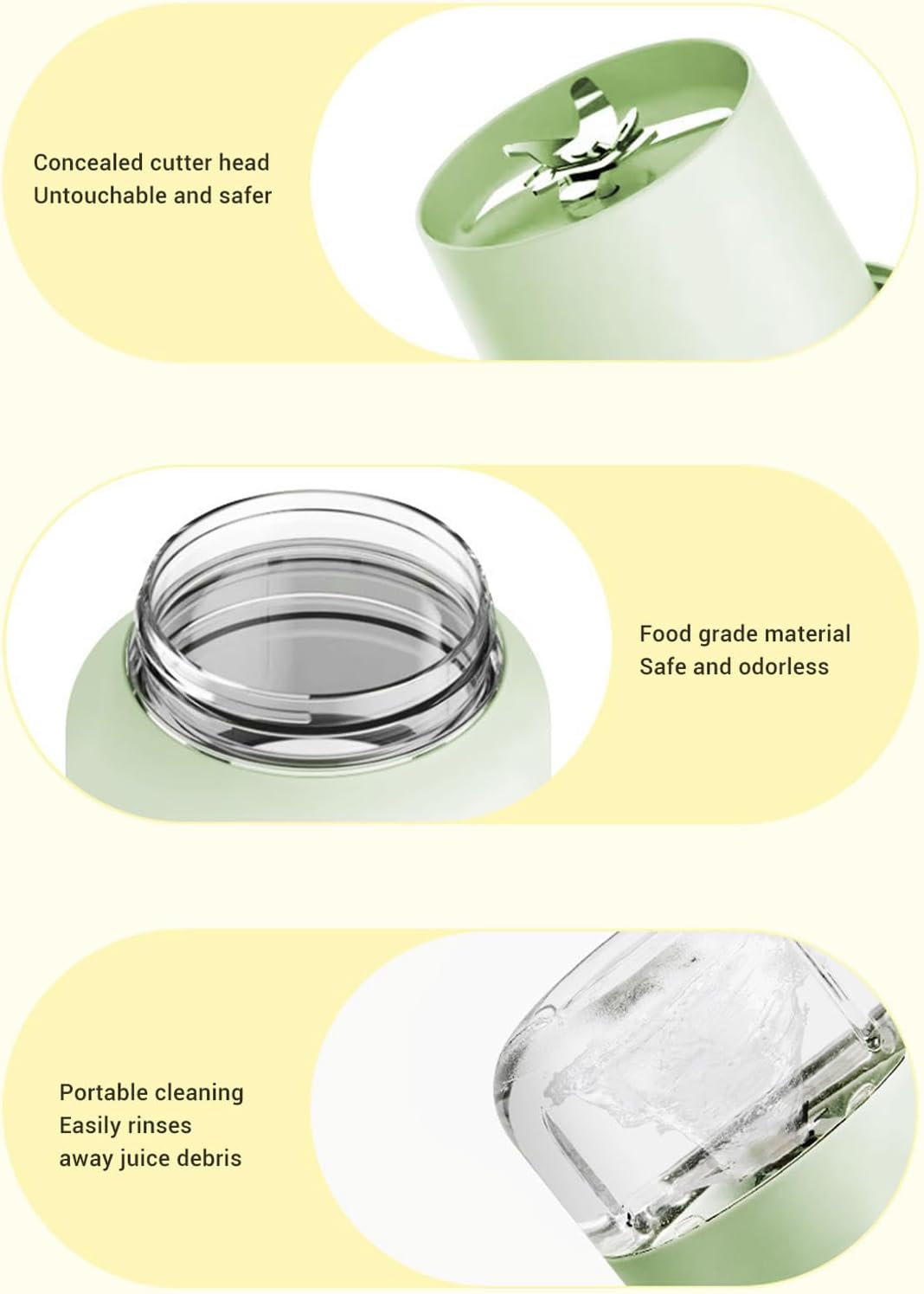 POTENTI PRESTAZIONI DI MISCELAZIONE: Il nostro frullatore portatile vanta una potenza media di 70 W ed è dotato di 2 batterie per un'alimentazione potenziata, con una capacità della batteria di 1500 mAh. La tazza del succo è dotata di canali per creare un vortice per una miscelazione accurata. DESIGN PORTATILE: Dotato di tecnologia di blocco di sicurezza intelligente, il motore del frullatore si fermerà automaticamente se la tazza si inclina o il coperchio non è fissato saldamente. Prima della miscelazione, assicurarsi di aggiungere acqua o altri liquidi per la lubrificazione. Viene fornito con una tracolla per un facile trasporto in movimento. RICARICA USB TIPO C: il frullatore personale viene caricato tramite USB tipo C con una tensione standard di 5 V. Dispone di protezione di sicurezza in caso di tensione superiore a 5 V. La spia di ricarica si accenderà ma il frullatore non si avvierà. FACILE PULIRE: le lame in acciaio inossidabile offrono una rotazione ad alta velocità e sono facilmente rimovibili per la pulizia. Il gruppo lame può essere sciacquato direttamente sotto l'acqua corrente, mentre il contenitore è lavabile in lavastoviglie (non immergere il motore in acqua). BASSO RUMORE: questo frullatore portatile funziona in modo silenzioso per ridurre al minimo i disturbi acustici, rendendolo adatto agli appassionati di fitness, agli impiegati, alle casalinghe, agli studenti e ai bambini per l'uso all'aperto, in ufficio, a casa o in palestra.