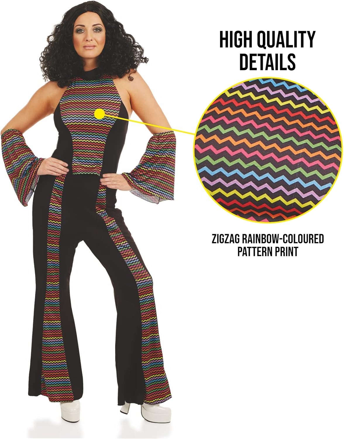 Costume da discoteca da donna include top a righe nere e arcobaleno, pantaloni svasati e copribraccia arcobaleno.Disponibile nelle taglie Small 8-10, Medium 12-14, Large 16-18, X-Large 20-22. Si prega di fare riferimento alla tabella delle taglie per ulteriori dettagli sulle dimensioni. Materiale di alta qualità completo di stampa a zig-zag con motivo a arcobaleno. Confortevole per una varietà di tipi di corpo. Fondata nel 2009 da 3 amici con la passione per i costumi, ora abbiamo 100 disegni tutti realizzati secondo i più alti standard di qualità, vestibilità e design. Abbiamo uffici negli Stati Uniti, nel Regno Unito e in Europa. Perfetto costume da discoteca, costume da donna anni '70, costume da donna, costume da discoteca, costume anni '70, costume da donna, costume da discoteca, costume anni '70 per donna.
