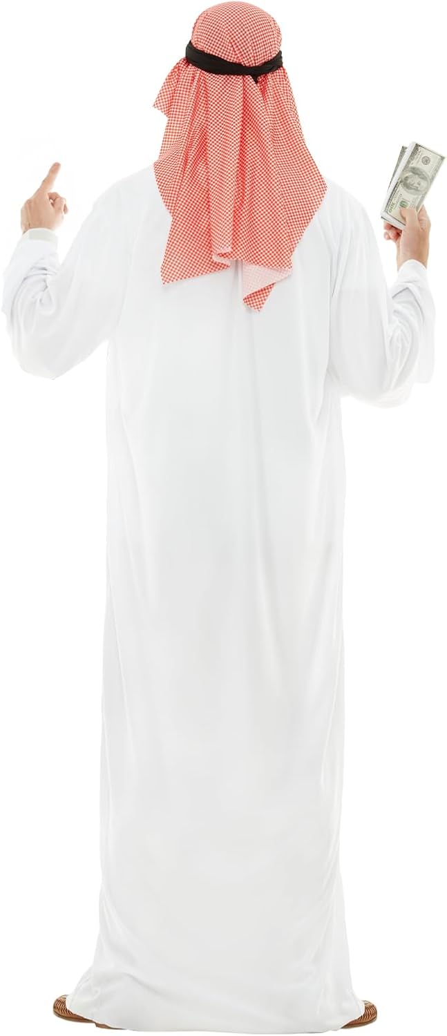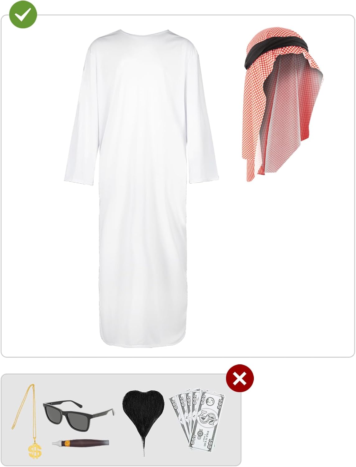 🔴 Include: Costume per Adulto. tunica, foulard per la testa NON INCLUDE: Collana, occhiali, sigaro, pizzetto e banconote . Color: Bianco. Materiale 100% Poliestere 🟠 Taglia: L. Se sei una persona molto alta, corpulenta o hai dubbi tra due taglie, è meglio selezionare la taglia più grande, poiché è normale che vestano larghe. 🟡 In FUNIDELIA designiamo i costumi più originali per le tue feste più divertenti. Il nostro marchio Made By Funidelia è garanzia di esclusività e qualità. Identificare i prodotti più richiesti dai clienti ci permette di realizzarli in modo rapido ed esclusivo, offrendo il miglior rapporto qualità prezzo nei prodotti delle licenze più importanti al mondo. 🟢 Costumi Arabia variegati e unici per Carnevale, Halloween, feste in maschera e compleanni. Vestito n/a per godere al massimo come Sceicco. 🔵 Il costume più originale e divetente: Sceicchi e principi arabi del deserto! VESTITO DA ARABO per uomo per trasformarti nel abitante del deserto!!!. Have Fun!