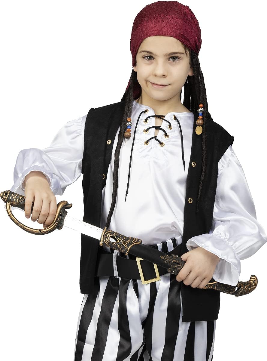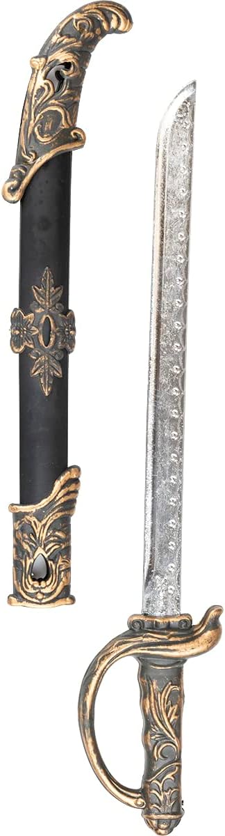 La espada mide, en total, 52 centímetros, tal y como dice en la descripción. Es una espada en miniatura, adecuada para un niño, ridícula para un adulto. No lleva nada para poderla atar a la cintura, de hecho la funda no tiene ni tan siquiera algún tipo de enganche que permita atarla a nada, así que es para llevar en la mano. El aspecto en general es decente, pero venderlo como un accesorio para un disfraz de adulto no tiene sentido.
