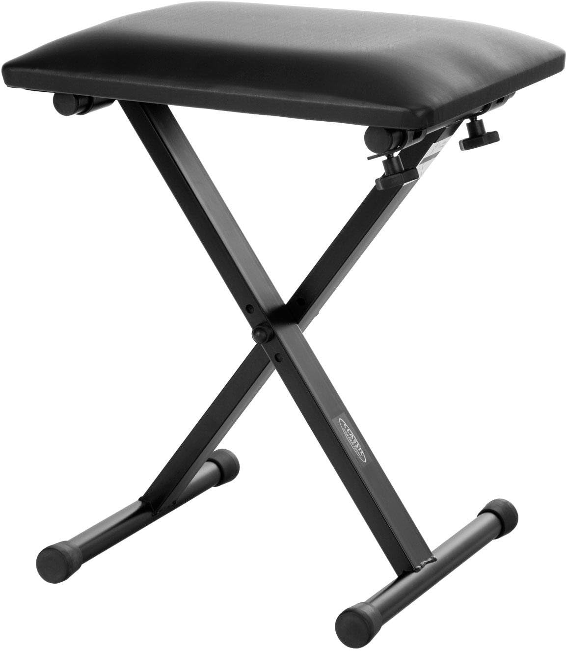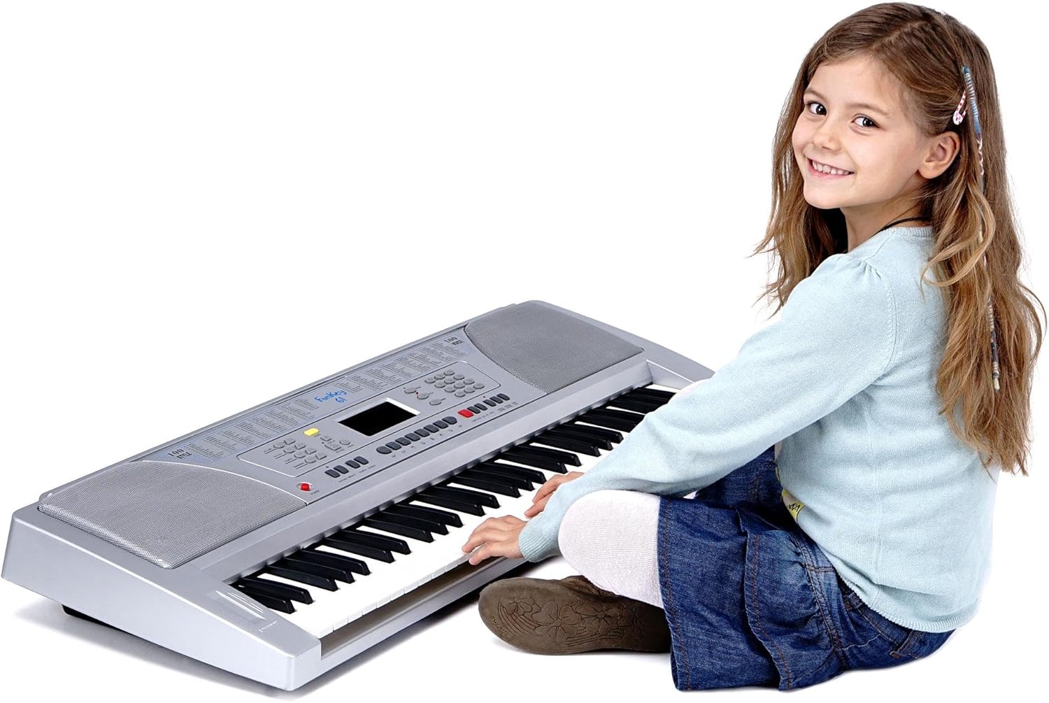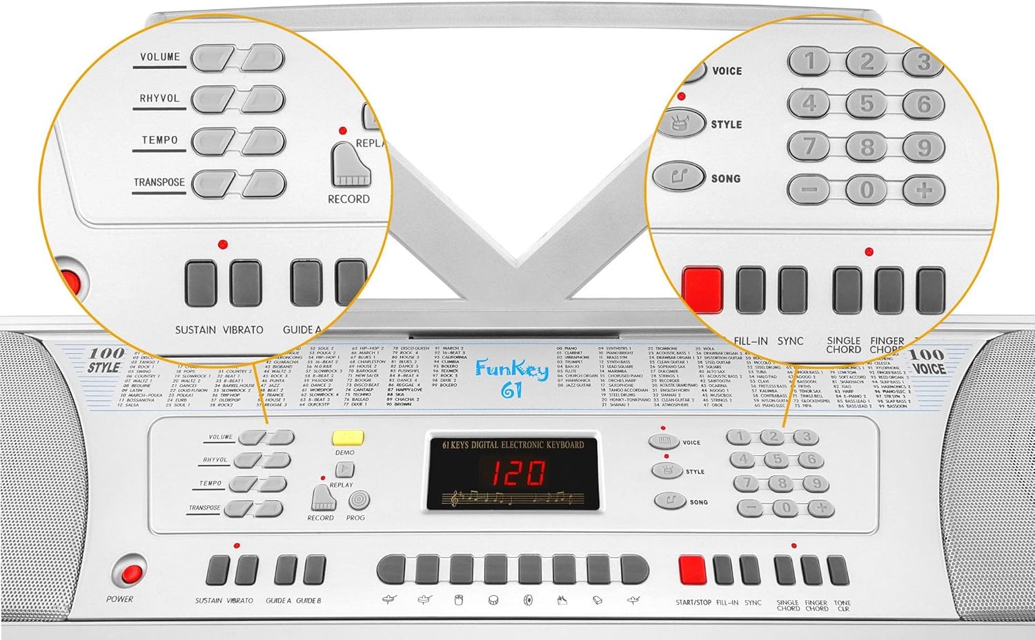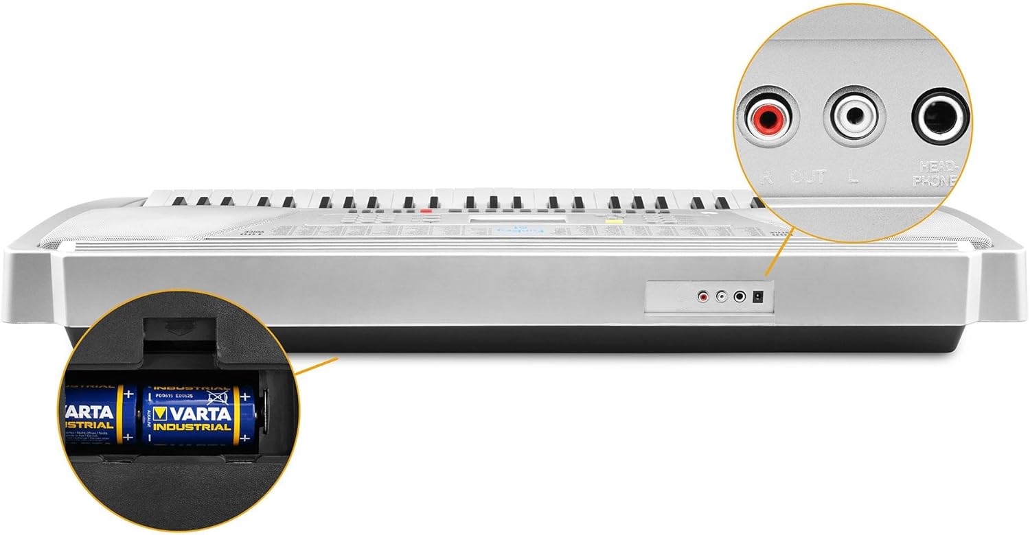 Keyboard per principianti con 61 tasti (C2-C7), display LED, 100 suoni, 100 ritmi, 8 brani demo stereo 8 suoni batteria per programmare i propri ritmi, controlli effetti: vibrato, sustain, trasposizione, Accompagnamento automatico, controllo accordi, guida intelligente, uscita cinch, uscita cuffie, incl. alimentatore Supporto keyboard: regolabile in altezza 5 posizioni da 62 a 100 cm, chiusura rapida, profondità appoggio 33,5 cm Panca keyboard: compatta, facile da piegare, rivestimento in pregiata ecopelle, regolabile in altezza 3 posizioni, portata fino a 100 kg