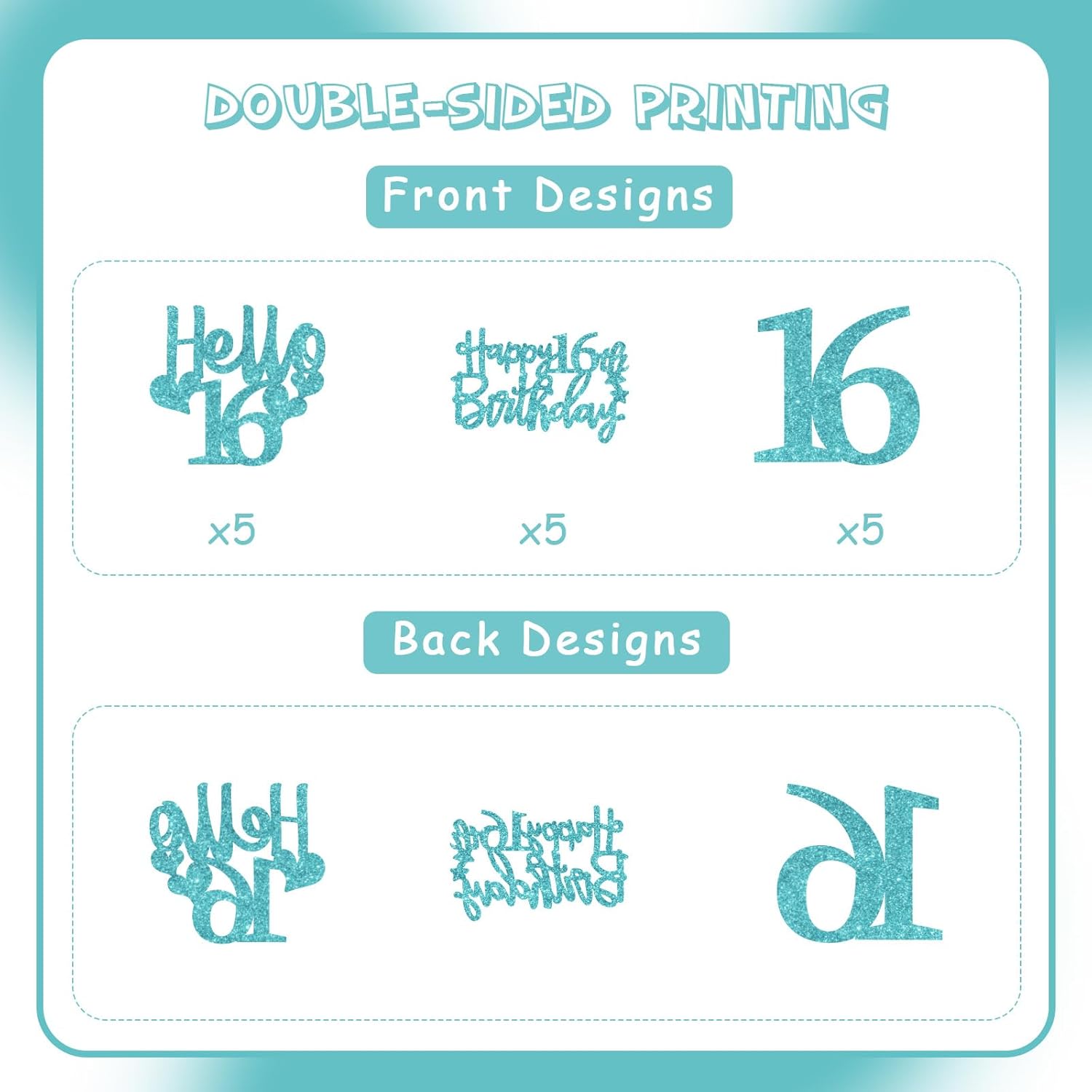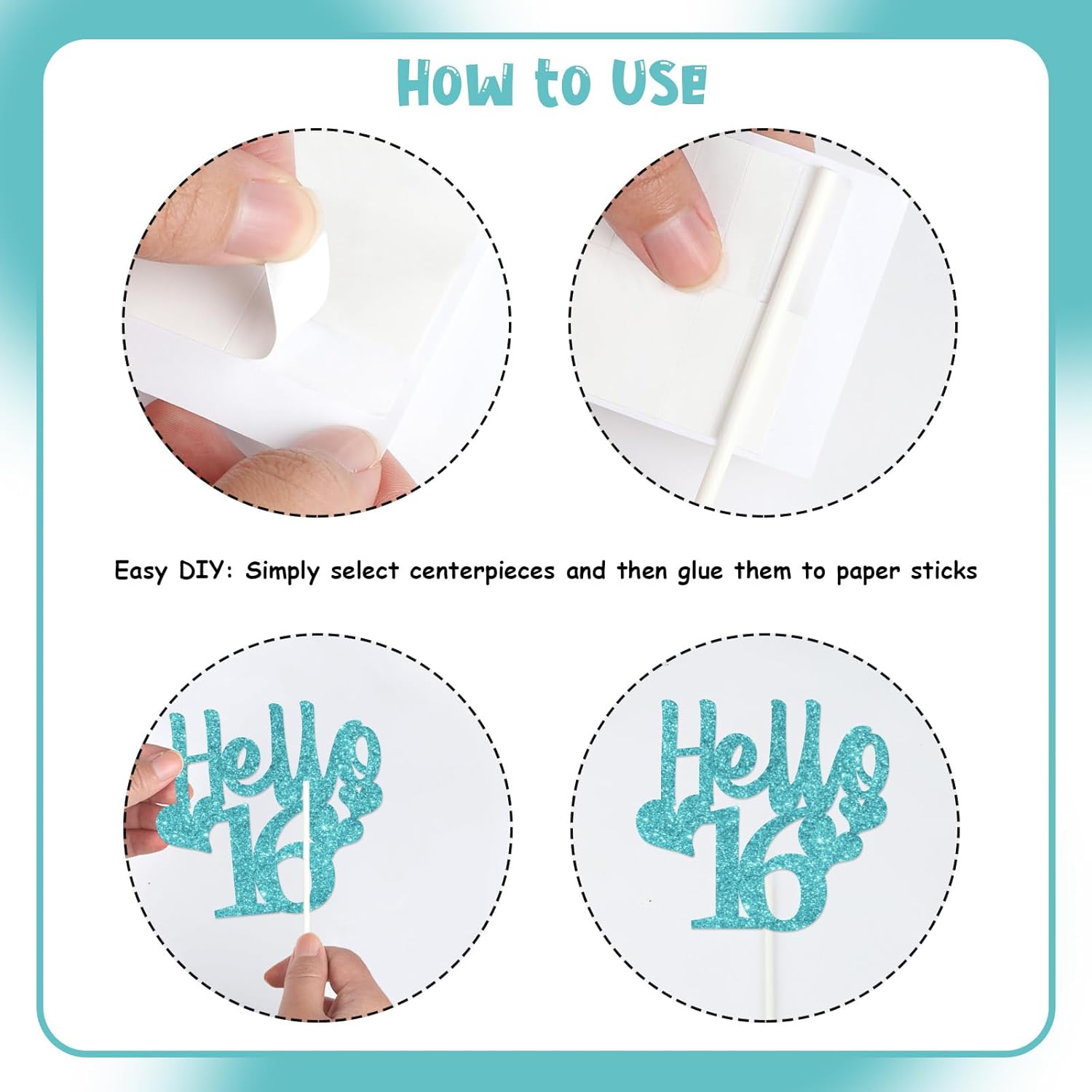 Set di decorazioni per la tavola per 16° compleanno color foglia di tè: questo kit per feste di 16° compleanno include tutto il necessario per vestire i tavoli delle feste: 15 topper centrotavola blu acqua glitter (3 disegni), 15 bastoncini di carta e punti adesivi per un facile montaggio. Ideale per creare un tavolo coordinato "Cheers to 16 Years" Elegante combinazione di colori foglia di tè: i disegni turchesi scintillanti presentano "Hello 16", "Happy 16th Birthday" e frasi celebrative che catturano l'emozione di questo 16° compleanno. La lussuosa combinazione di colori funziona con palloncini, striscioni e altre decorazioni per feste color foglia di tè Opzioni versatili per centrotavola: utilizza i topper glitterati per il 16° compleanno come bastoncini per ghiaccioli per torte, topper per cupcake o segnaposti. I bastoncini di carta consentono di posizionarli in composizioni floreali, vasi centrotavola o direttamente nei dessert per un look lucido Montaggio facile e veloce: basta attaccare i punti adesivi pretagliati per fissare i topper decorativi ai bastoncini inclusi. Non sono necessari attrezzi, l'intero set può essere preparato in pochi minuti, risparmiando tempo prezioso per la preparazione delle feste Materiale: i bastoncini centrotavola per 16° compleanno blu acqua sono realizzati in carta di cartone, motivo chiaro e squisito, robusti e riutilizzabili