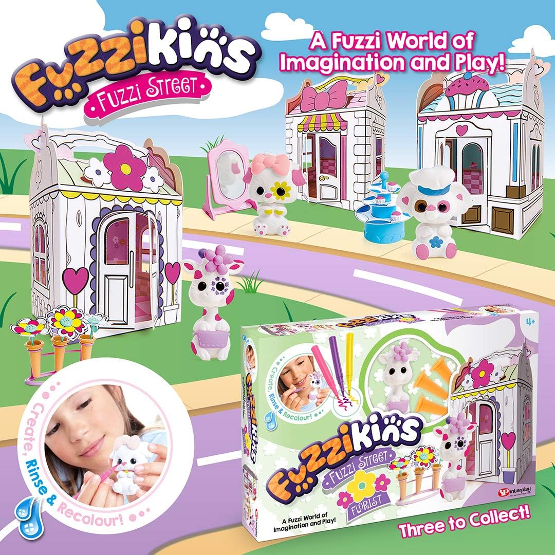Crea una fantastica Fuzzi Street con i negozi, i personaggi e gli accessori di Fuzzi Street. Il kit per fiorista Fuzzi Street include il proprietario della giraffa, un fioraio e tanti accessori da realizzare, colorare e personalizzare. Decora la tua giraffa, il suo negozio e crea bellissimi fiori che i clienti adoreranno. Crea, risciacqua e ricolora. Crea e interpreta la tua storia in un mondo Fuzzi pieno di immaginazione e giochi.
