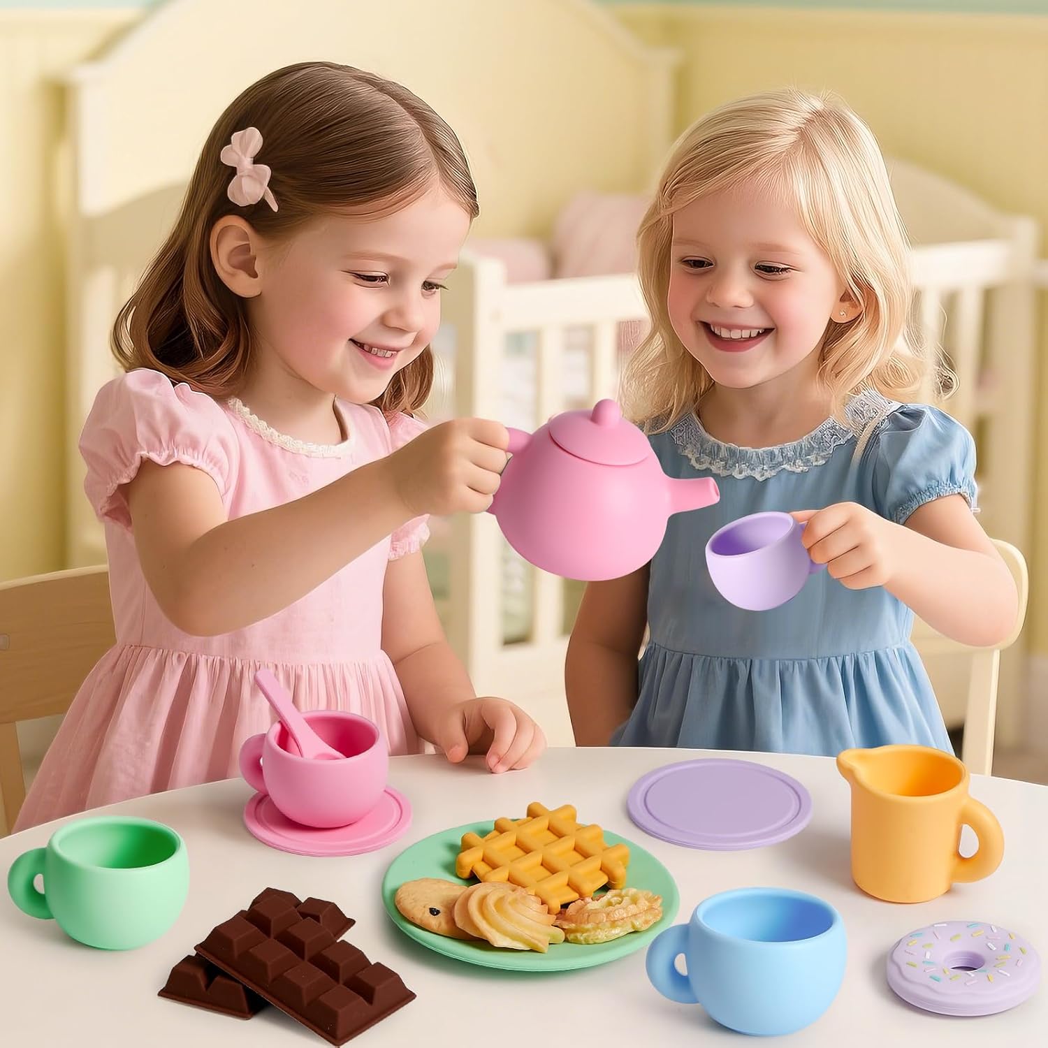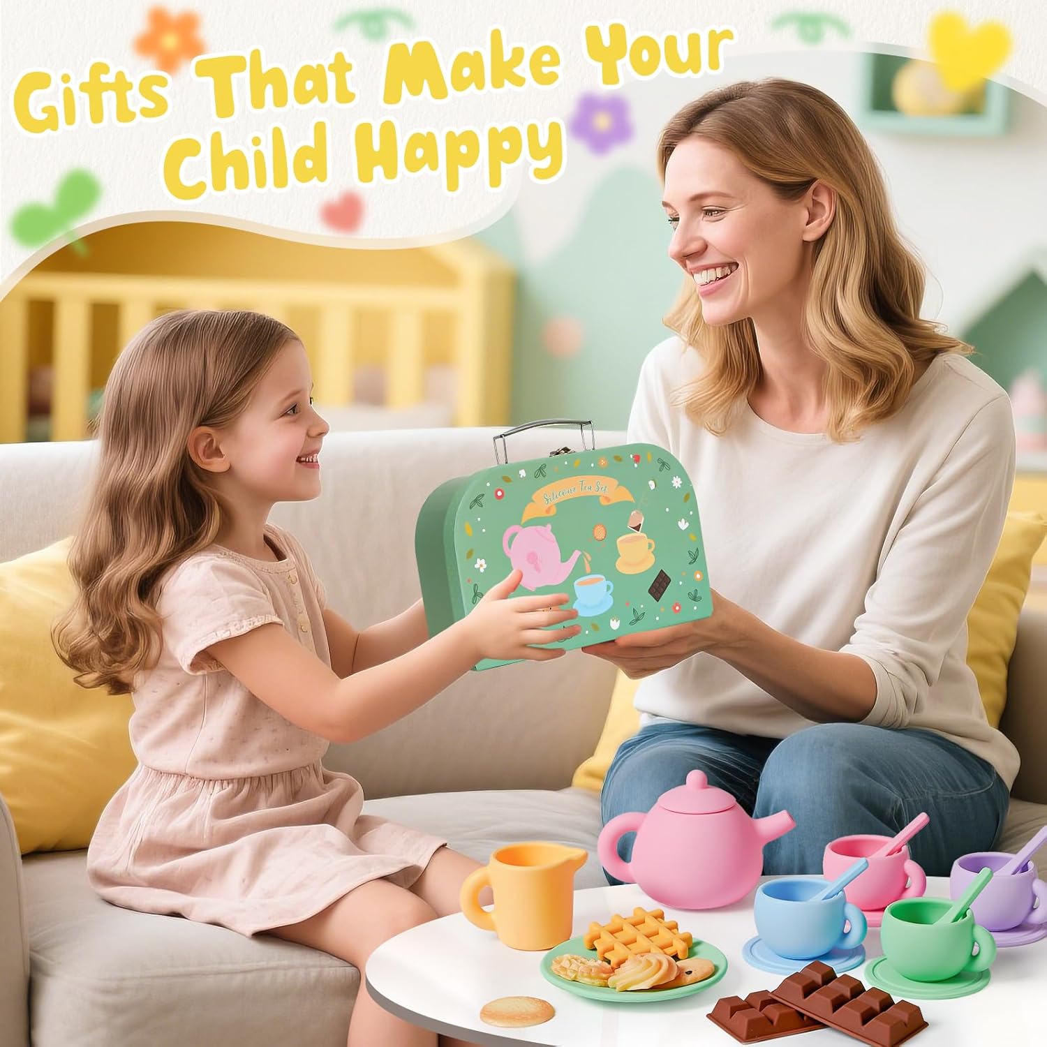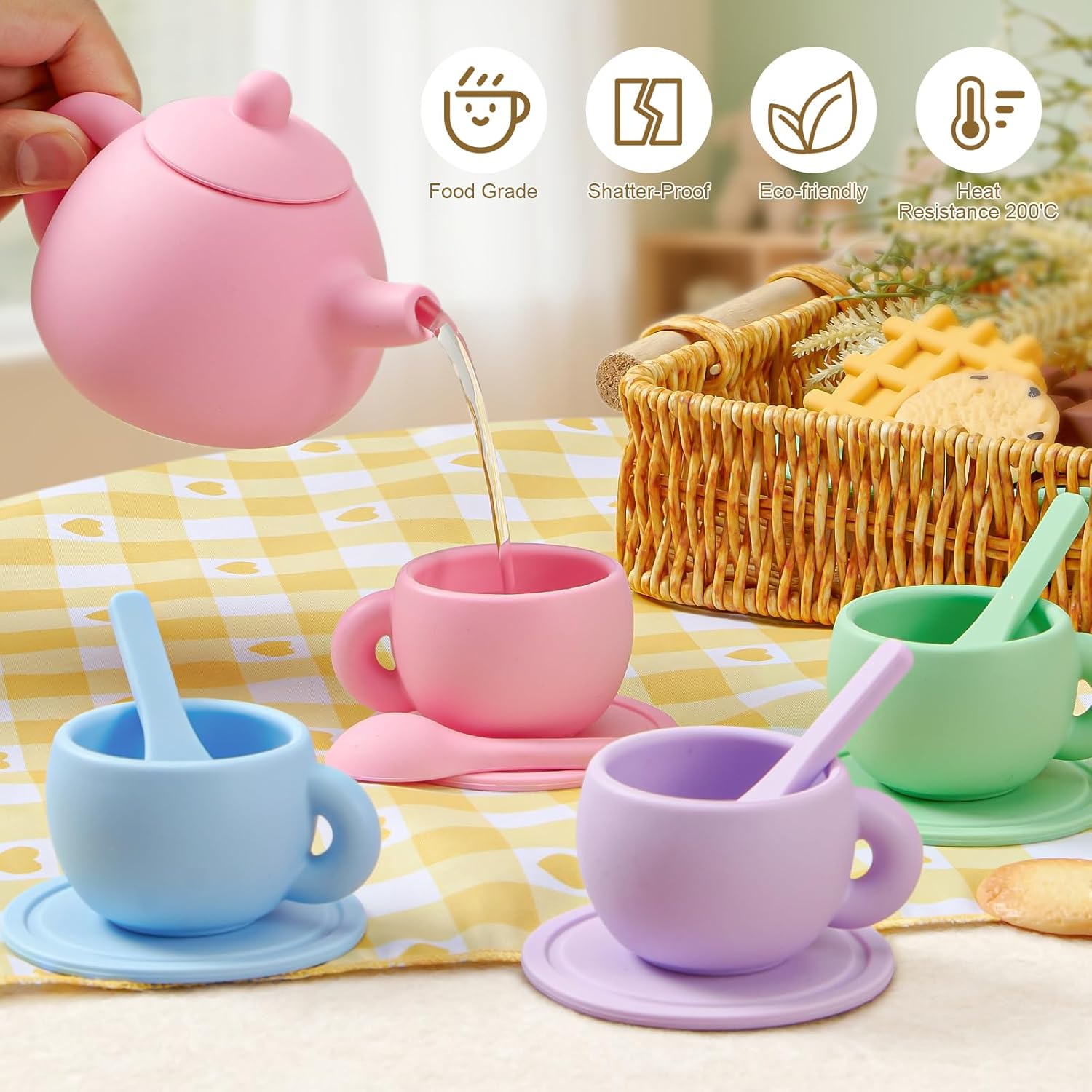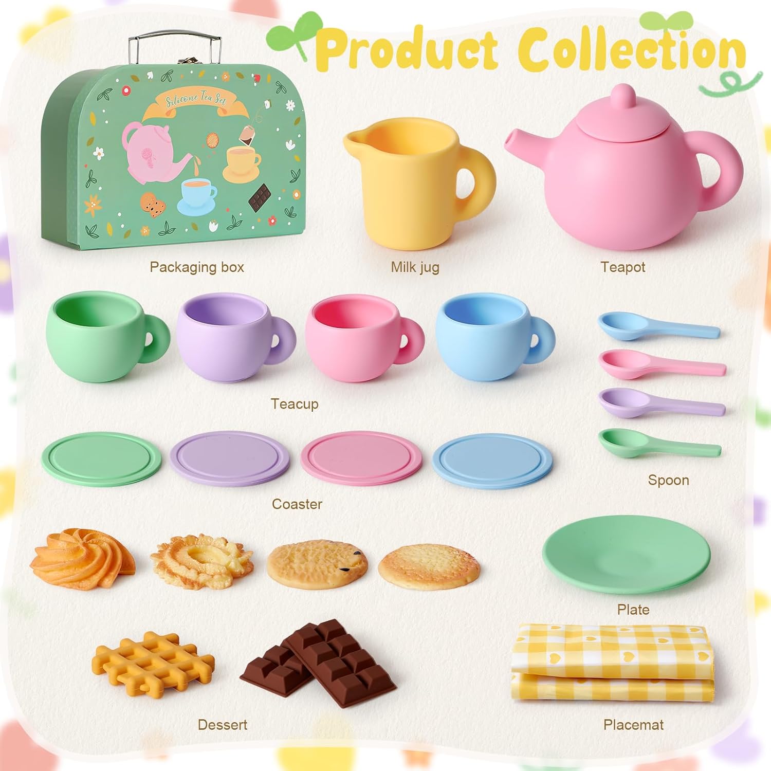 【Set da Tè per Bambini in Silicone】: Questo set da tè per bambini contiene 22 articoli, tra cui 1 teiera, 1 lattiera, 4 tazze da tè, 4 cucchiaini, 4 sottobicchieri, 2 piatti e alcuni dessert. Viene fornito anche con una tovaglia a rete. I ricchi accessori permettono ai bambini di immergersi nel gioco di ruolo e di trascorrere momenti felici. 【Set da Tè per Bambini in Silicone】: Questo set da tè per bambini è realizzato in silicone alimentare, più pratico dei giocattoli in plastica, metallo e legno: non perde, non si corrode, non arrugginisce e non si crepa. È inodore, facile da pulire e i bambini possono masticarlo o toccarlo. Questo set da tè può contenere anche liquidi veri come acqua, latte, ecc. 【Istruttivo E Divertente】: Questo set da tè giocattolo è un giocattolo Montessori, progettato per il divertimento educativo dei bambini, che simula realisticamente una vera scena del tè. Giocando, i bambini migliorano la percezione dei colori e la coordinazione occhio-mano. Inoltre, può incoraggiare notevolmente i bambini a interagire e comunicare con amici e familiari, il che contribuisce al loro sviluppo sotto tutti gli aspetti. 【Set Cucina Bambini Dai 3 Ai 5 Anni】: Colori intensi, elementi naturali, aspetto unico. Che si tratti di trascorrere del tempo in famiglia, di festeggiare il compleanno di un bambino o di fare un picnic, questo set da tè garantirà sicuramente un divertimento senza fine. Il design portatile della valigia ne facilita lo stoccaggio e il trasporto, consentendo ai bambini di divertirsi giocando sempre e ovunque. 【Regalo Ideale per I Bambini】: Questo set da tè in silicone per bambini è sicuramente un regalo ideale per le feste di compleanno dei bambini dai 3 ai 5 anni e per varie festività (Festa dei bambini, Natale, Halloween, Ringraziamento e Capodanno, ecc.). Lasciate che i vostri bambini si godano la merenda e vivano emozionanti giochi di ruolo. Lasciate che si allontanino dagli schermi elettronici e godano della pura felicità.