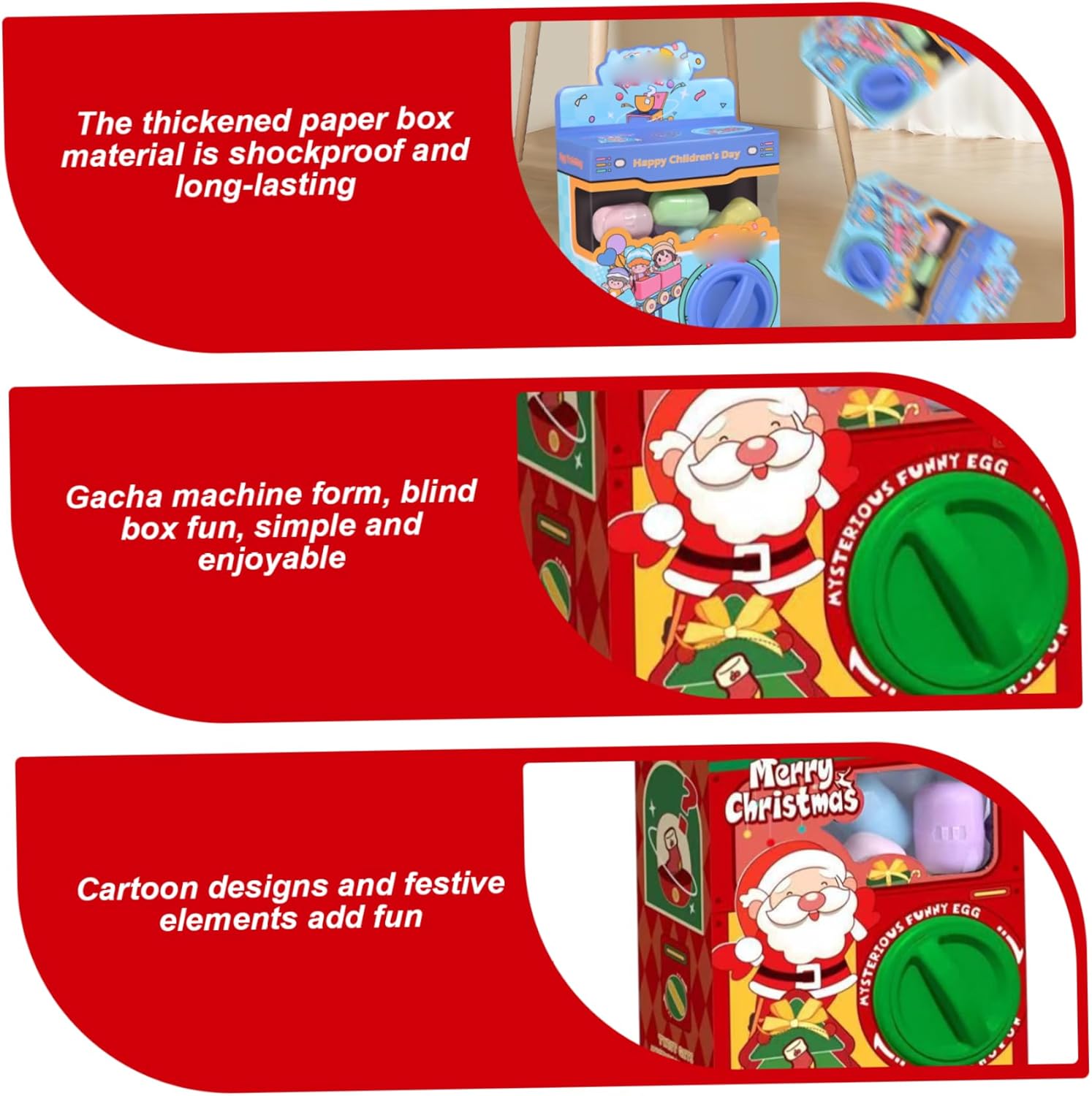 Design riutilizzabile e affidabile: realizzato con materiali di qualità, questo mini distributore automatico può essere riempito con piccoli giocattoli o caramelle, consentendo ai bambini di goderne ripetutamente tranne le festività natalizie. Favo di festa interattivo: perfetto per feste natalizie, celebrazioni di Pasqua o incontri di compleanno, questo distributore automatico di capsule fa divertire i bambini mentre funge anche da decorazione creativa per eventi festivi. Include 6 bambole casuali: ogni set viene fornito con sei bambole a sorpresa nascoste all'interno delle capsule, creando eccitazione e anticipazione mentre i bambini girano la manopola per rivelare il loro giocattolo misterioso. Regali ideali per bambini: combinare sorpresa, gioco e decorazione, questa macchina Gacha è un'ottima scelta di regali per i bambini, incoraggiando l'interazione divertente, l'immaginazione e lo spirito festivo durante le celebrazioni speciali. Tema natalizio festivo: progettato con un look allegro, questa macchina Gacha fa regali stagionali o attività di festa, portando eccitazione natalizia e gioia a bambini e famiglie.