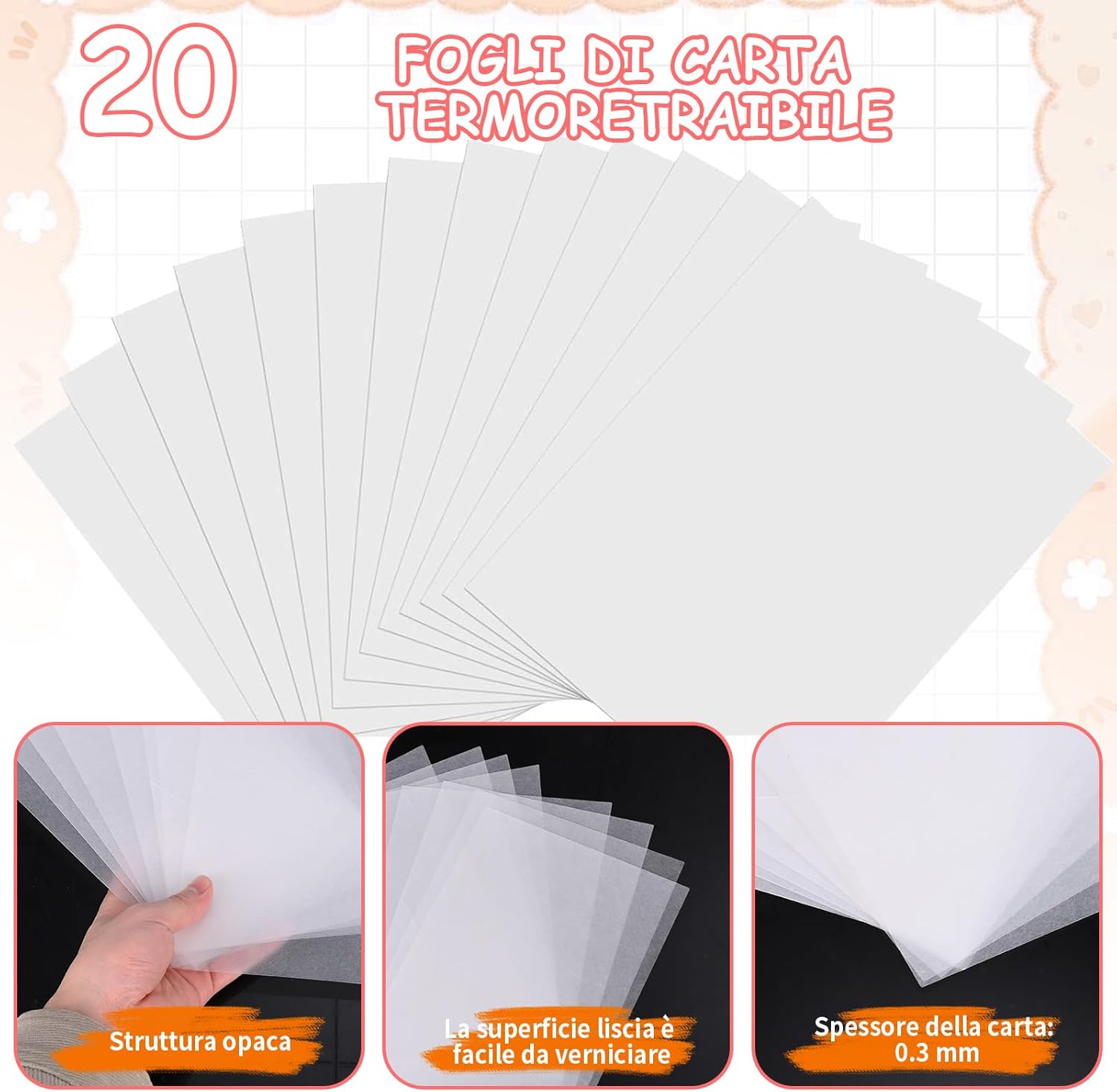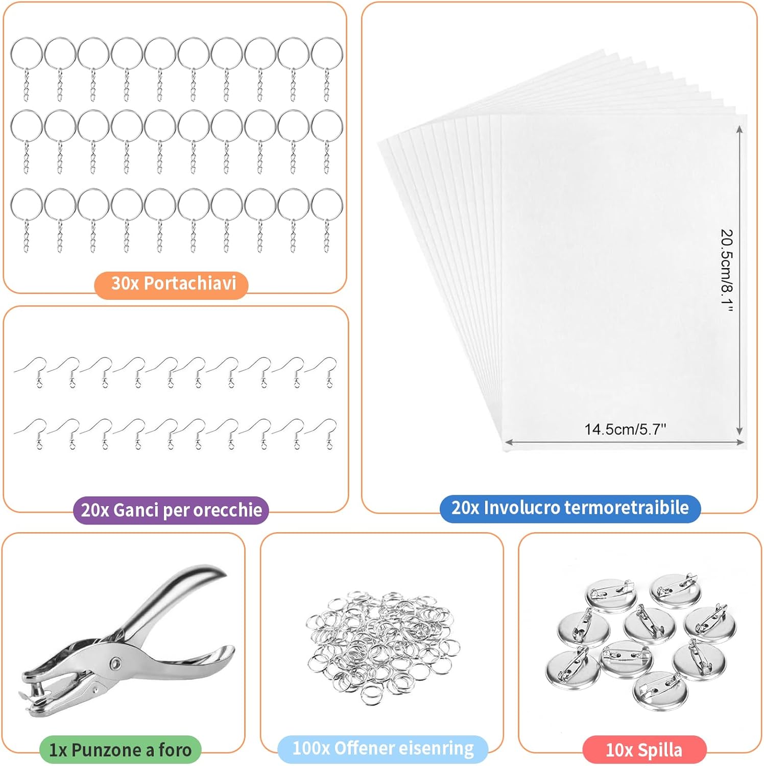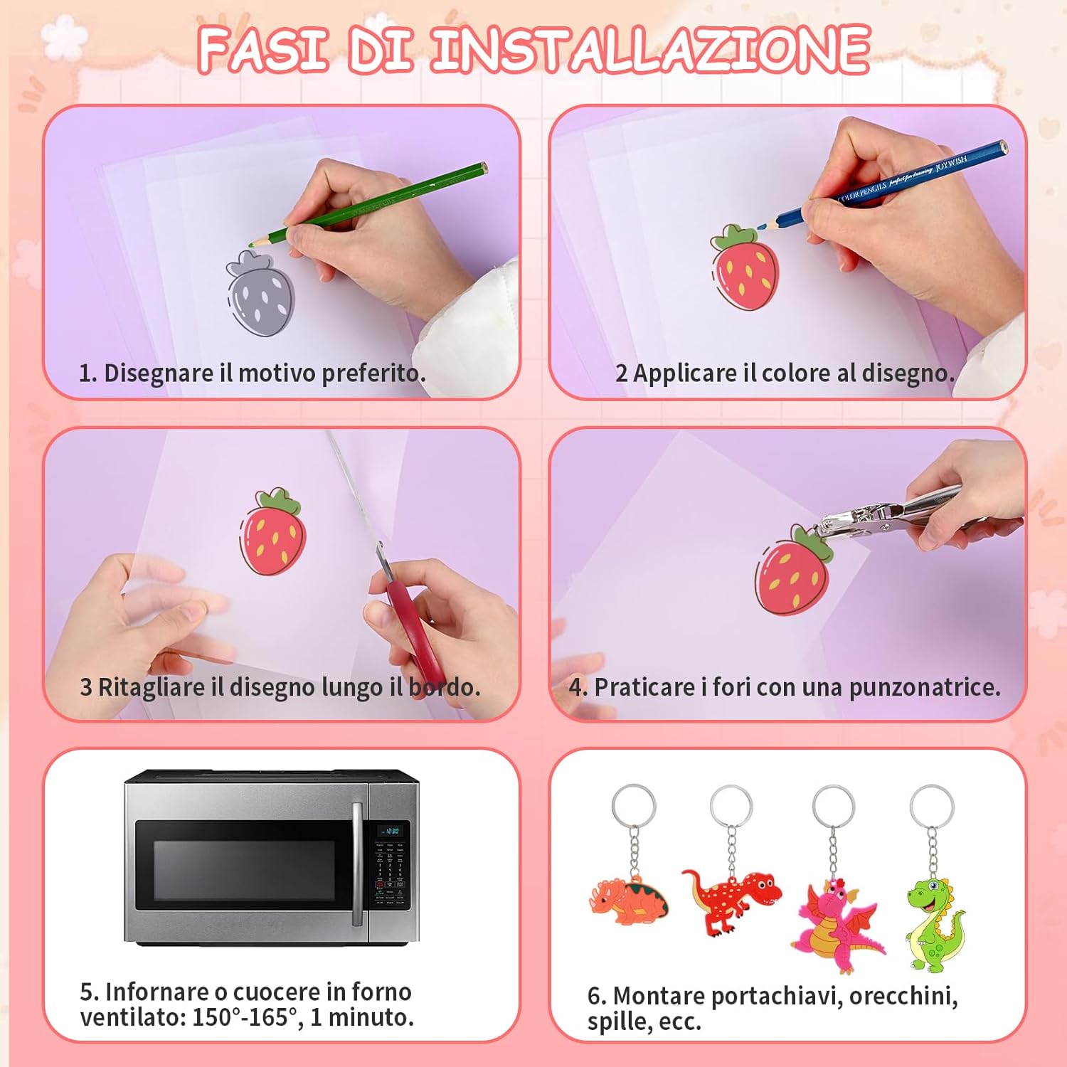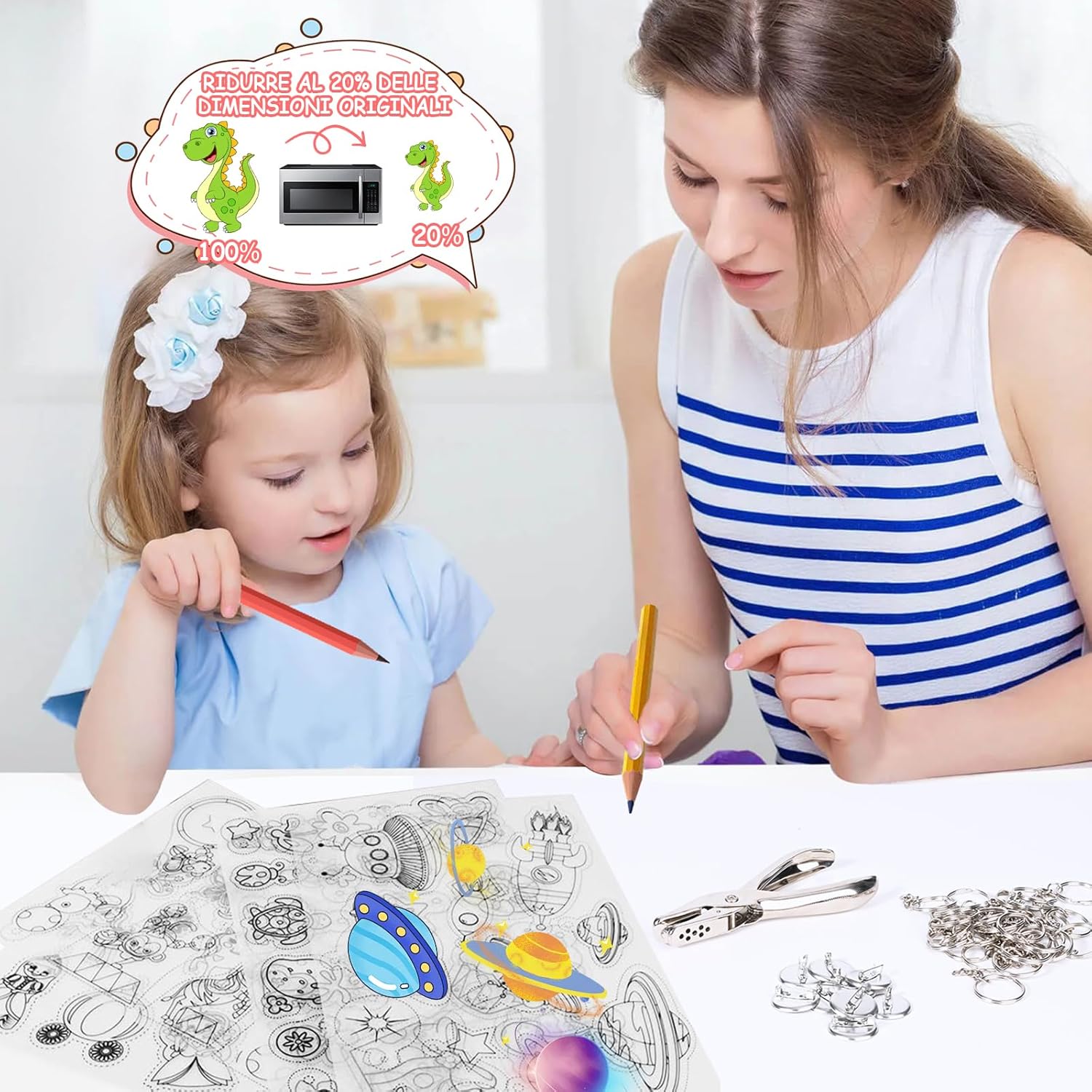 FACILE DA USARE: Questo Fogli Termoretraibili è molto adatto ai principianti e il processo è semplice e chiaro. Basta disegnare la forma desiderata sulla pellicola termoretraibile e dipingerla, ritagliarla, fare dei buchi con una perforatrice e poi cuocerla nel microonde. Nota: se non hai un microonde, ti preghiamo di non usare il forno, puoi anche usare una pistola termica KIT DI FILM RETRATTILE: Il nostro pacchetto shrink plastic contiene 20 pezzi di pellicola termoretraibile, 30 portachiavi, 1 perforatrice, 100 anelli di ferro aperti, 20 ganci per le orecchie e 10 spille. Soddisfa le esigenze fai da te dei bambini e crea portachiavi e orecchini unici, ecc DIVERTENTE FAI DA TE: Questo Kit di Carta Termoretraibile Fogli può dare pieno sfogo all'immaginazione dei bambini per creare una varietà di portachiavi, spille, orecchini, ecc.; i genitori possono partecipare. È un'attività genitore-figlio molto buona. Vieni e unisciti a noi MATERIALE PLASTICO: pellicola termoretraibile è realizzato in materiale plastico resistente, impermeabile e non facile da rompere. Le dimensioni del foglio di plastica termoretraibile sono 20,5 cm*14,5 cm e le dimensioni sono adatte per il taglio fai da te. Nota che quando si praticano i fori, la distanza dal bordo deve essere di almeno 2 cm per evitare che il bordo si rompa REGALO PERFETTO: il nostro kit di fogli di plastica termoretraibile è perfetto per realizzare regali e lavori artigianali. Adatto come regalo di compleanno per bambini, regali per la festa della mamma, regali per San Valentino, festa dei bambini, regali per la festa del papà, ecc. È una scelta regalo molto interessante e significativa