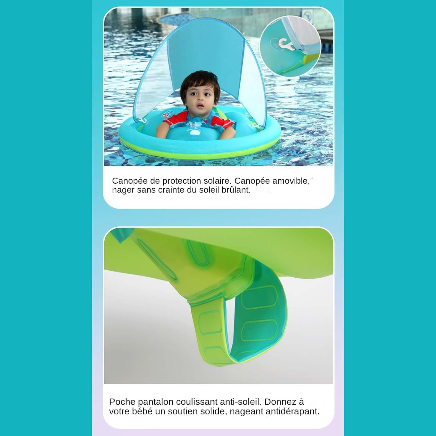 Supporto per acqua: sedile antiscivolo con struttura avvolgente e imbracatura robusta che impedisce lo spostamento dell'acqua per un supporto affidabile del bambino durante il nuoto Design sicuro: due camere d'aria indipendenti garantiscono un galleggiamento stabile e una protezione anti-ribaltamento efficace, con un facile gonfiaggio per una maggiore praticità Sicurezza rinforzata: design sicuro e dimensioni studiate facilitano i movimenti naturali in acqua, fornendo un supporto adeguato alle esigenze dei bambini durante i giochi acquatici. Seduta sicura: design innovativo a doppio anello ottimizza la stabilità e l'equilibrio con un sedile ergonomico integrato che dà priorità al comfort e alla sicurezza acquatica. Sicurezza e comfort: parasole staccabile con protezione UPF per i momenti acquatici estivi in tutto. Velo traspirante un'ampia copertura anti-UV.