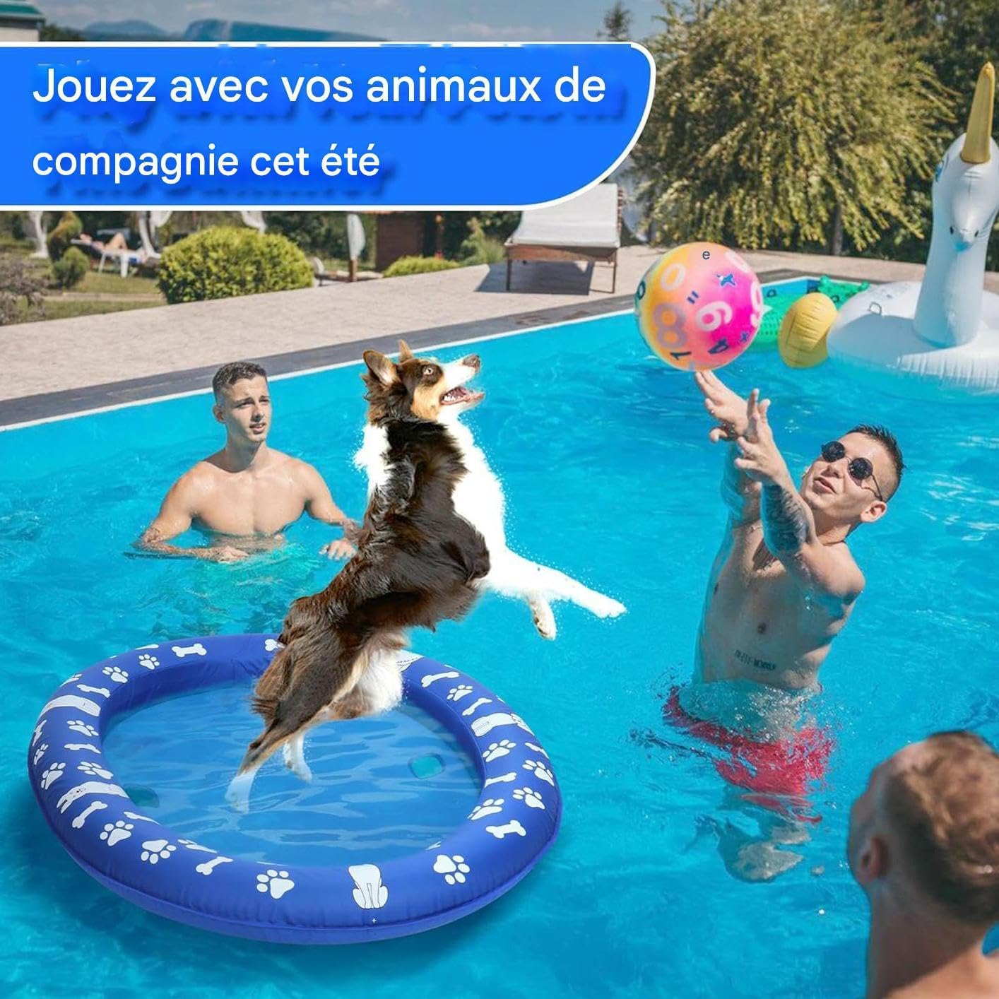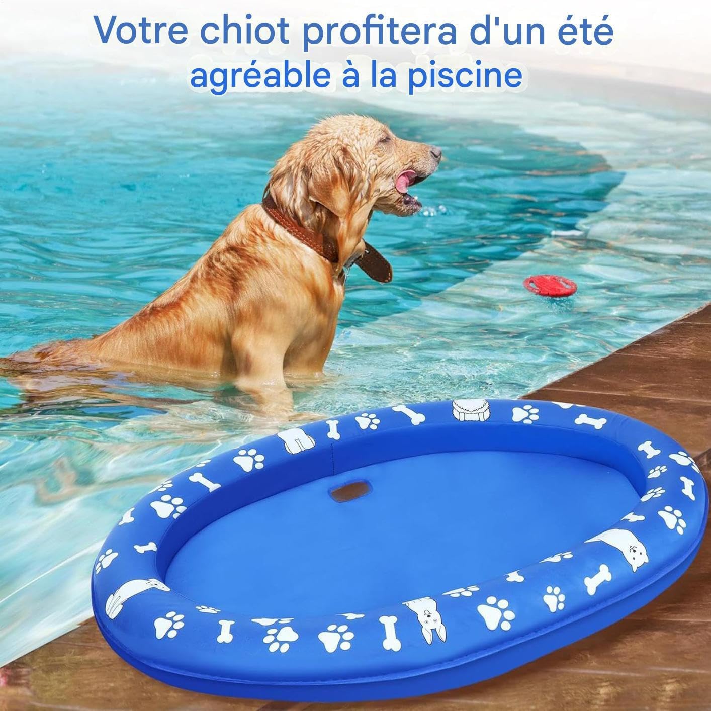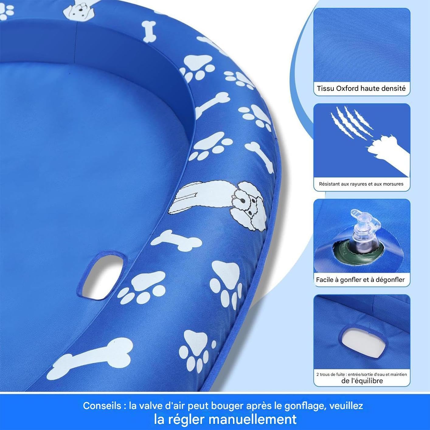 Design idrodinamico: galleggiante con 4 fori di flusso che ottimizzano la stabilità sull'acqua. Il sistema di circolazione dell'acqua raffredda efficacemente il tuo animale domestico fornendo il massimo comfort durante l'uso. Comfort spazioso: dimensioni generose con galleggiabilità affidabile e ampia, può ospitare 2 cani fino a 29,5 kg per giochi acquatici di piccola e media razza. Risparmia tempo: sistema di gonfiaggio-sgonfiaggio senza sforzo per un utilizzo immediato e uno stoccaggio compatto, galleggiante affidabile per giochi acquatici all'aperto con il tuo cane. Stile notevole: la delicata miscela di toni blu e bianchi, il retro carino e i design stampati garantiscono presenza visiva, scelta eccellente per attività acquatiche e interazioni gioiose con il tuo animale domestico. Materiali durevoli: PVC rinforzato e Oxford ad alta densità garantiscono una lunga durata. Resistente ai graffi per avventure acquatiche sicure e riutilizzabili.