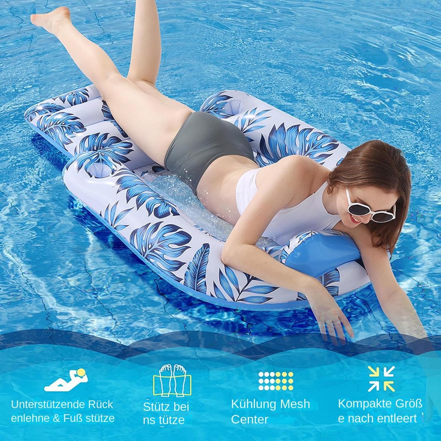 Materiale eccellente: il nostro lettino galleggiante da piscina è realizzato in materiale PVC di alta qualità, offrendo più ore di comfort e tranquillità sull'acqua. DESIGN SPECIALE DEL CUSCINO: siediti con stile e prendi il sole con il nostro lettino galleggiante da piscina. L'innovativo design del cuscino sostiene la testa e il collo, mantenendoti pieno e comodo e consentendo un'esperienza fluttuante senza sforzo, un modo davvero sereno per rilassarti. Tempo libero a bordo piscina: sperimenta il massimo relax con il nostro lettino galleggiante a bordo piscina, progettato per creare un ambiente rilassante. I sedili e lo schienale in rete rinfrescante garantiscono comfort nelle giornate soleggiate. Utile area poggiapiedi: immergi i piedi e le gambe nell'acqua con l'area poggiapiedi dal design unico del nostro lettino galleggiante da piscina. Sperimenta un relax senza precedenti mentre l'acqua fresca ti bagna mentre leggi, ti rilassi o prendi il sole nel massimo comfort. Comodo da trasportare: porta con te il nostro lettino da piscina ovunque tu vada grazie alla sua facile portabilità. Una volta sgonfio, si ripiega comodamente fino a raggiungere dimensioni compatte, facilitando lo stoccaggio e il trasporto.