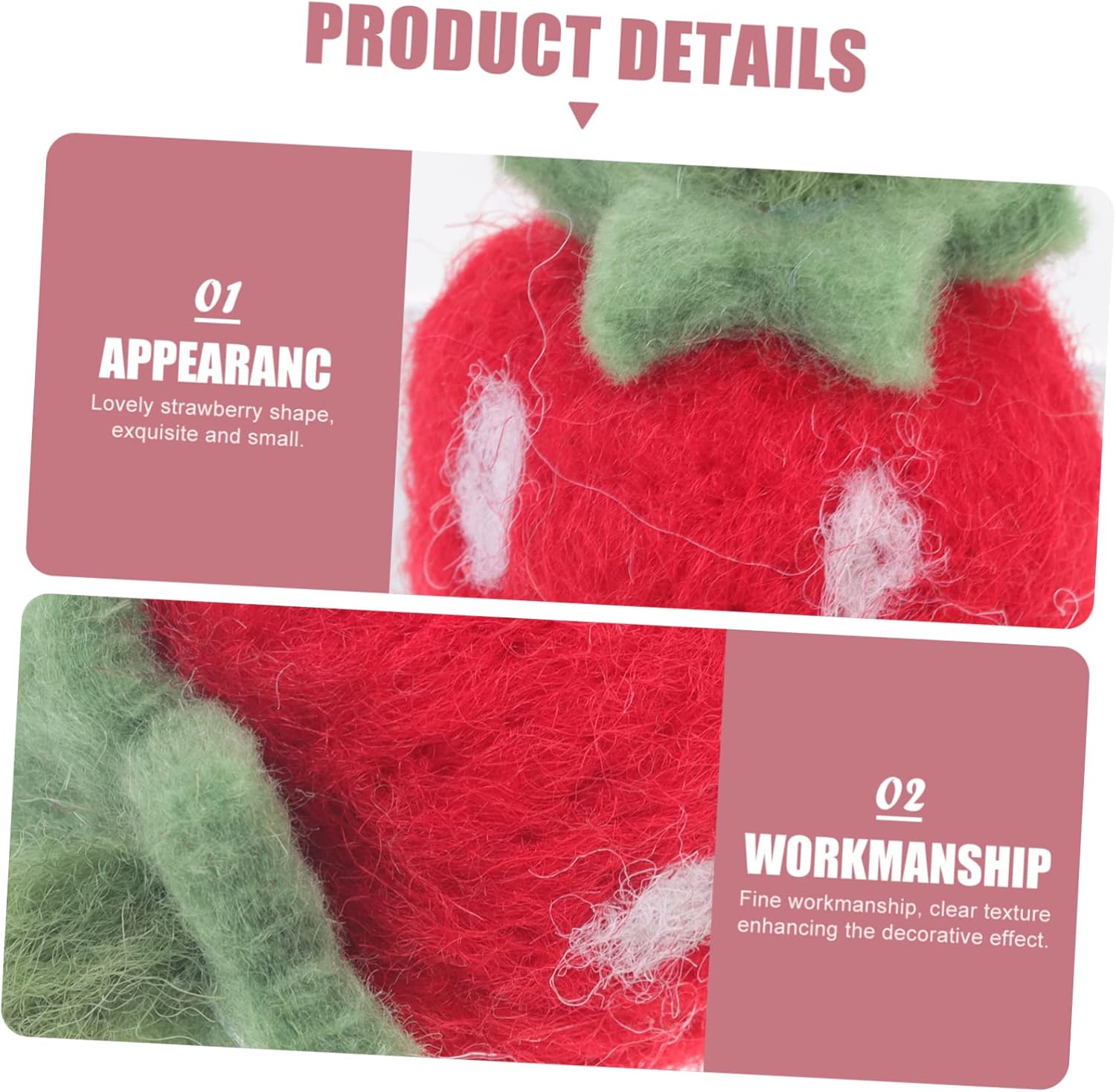 Fragola: le fragole morbide in feltro incollano facilmente a fili, bastoncini, scatole di imballaggio o cuciono su borse o vestiti per creare oggetti artigianali o decorazioni, oggetti decorativi a forma di fragola Mini creazione di fragole: lavorazione raffinata, consistenza chiara che esalta l'effetto decorativo, sembra davvero squisito, fragola in feltro ad ago Giocattolo di fragole in feltro: la nostra fragola in feltro è realizzata in lana, di piccole dimensioni, leggera, piccola decorazione a fragola Fragole in feltro per lavoretti: dimensioni compatte, facili da riporre, senza occupare troppo spazio, decorazioni in feltro con fragole Fragole ripiene di feltro: possono essere appese all'albero di natale o in altri luoghi che necessitano di essere decorati, come , porte d'ingresso, pareti, ecc., fragole in feltro di lana