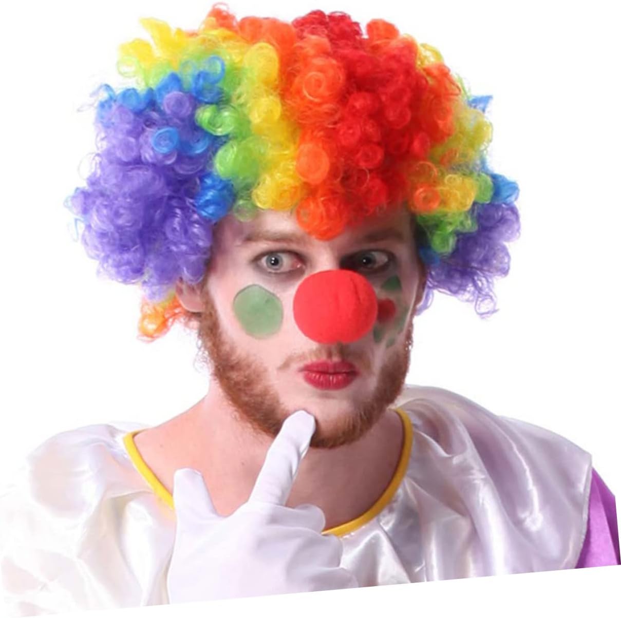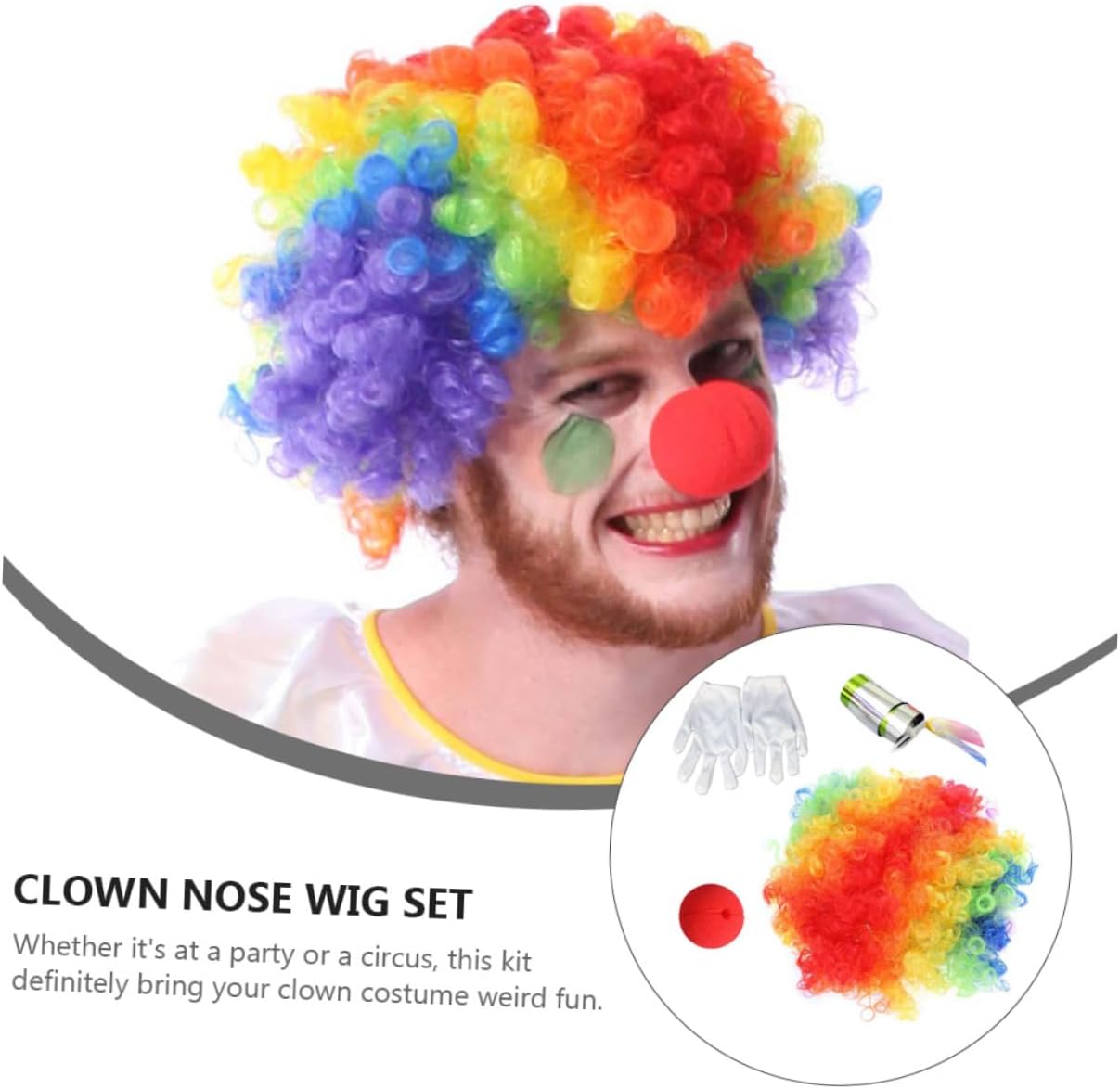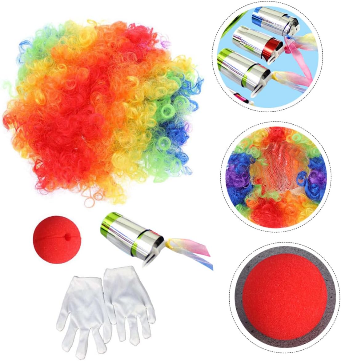 Il pacchetto include 1 parrucca colorata 1 naso da clown 1 paio di guanti 1 da clown Caratteristiche - Dimensioni: circa 25,00X20,00X5,00 cm/9,82X7,86X1,97 pollici, oggetti di scena per cosplay da clown. - Materiale: guanti bianchi da clown in stoffa. - Accessori adatti per il ballo in maschera e Halloween. Set di costumi da clown - parrucca da pagliaccio - Per ingannare i tuoi amici con questo set di accessori per costumi da clown. Set parrucca naso da clown - Con una fessura, puoi metterlo sul naso senza alcun adesivo. accessori per cosplay da clown - con parrucche drammatiche, crea un effetto scenico emozionante. accessori da clown - Adatto ad adulti, ragazzi, chiunque voglia fare il pagliaccio. pagliaccio naso rosso Descrizione della merce accessori per cosplay da clown Ogni clown deve avere il suo accessorio speciale da clown! Divertiti con un po' di circo quando ti vesti da pagliaccio ! Usa questi accessori per cosplay da clown e sarai pronto a fare il pagliaccio! Facile da indossare e da togliere. accessori per cosplay da clown Nota: il tipo di naso da clown è casuale