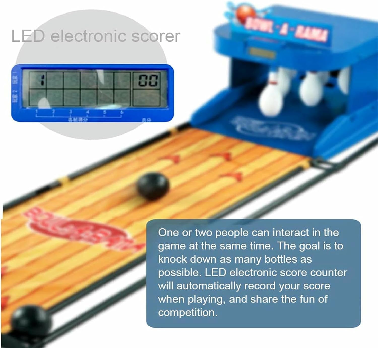 Dispositivo di punteggio elettronico a LED: durante il gioco, il marcatore elettronico a LED registrerà automaticamente il tuo punteggio e condividerà il divertimento della competizione. Supportare una o due persone possono interagire con il gioco allo stesso tempo.L'obiettivo è abbattere il maggior numero possibile di spille Arco di ritorno a sfera automatico: la bottiglia si ripristinerà automaticamente quando colpisce la bottiglia dopo aver lanciato la palla in mano e emetterà un suono di ripristino simulato per rendere il gioco più reale e conveniente Electronic Bowling Alley Game: il set di giochi di bowling è dotato di 6 spille full di plastica e 2 palline da bowling, spille e palline da arco sono realizzate in plastica di alta qualità, che non è tossico e sicuro per i bambini a giocare Facile da configurare: un set di bowling grande elettrico portatile adatto per l'uso domestico, che può impostare rapidamente e facilmente il gioco, hanno fatto un buon lavoro nel simulare il peso relativo della palla e l'esterno era abbastanza liscio, può essere piegato e riposo quando non in uso e gli angoli non occupano spazio Intrattenimento genitore-figlio: il bowling è divertente, interessante, competitivo e abile, i giochi possono avvicinare le persone, è un ponte di comunicazione tra famiglia e bambini, rendendo la famiglia andare d'accordo in modo più armonioso e gioiosamente