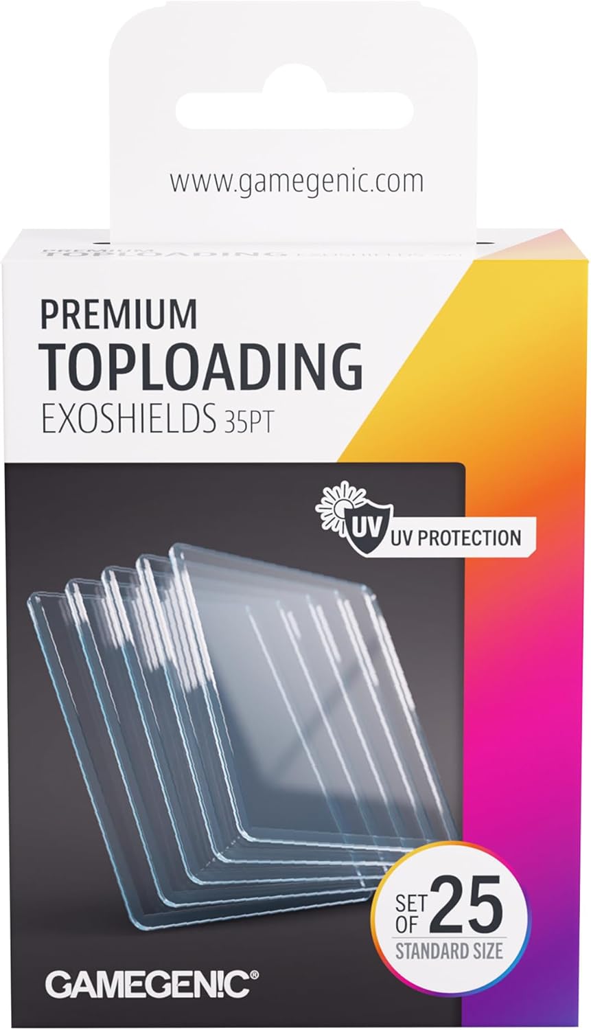 25 Exoshields con protezione UV in ogni confezione, per carte fino a 35 pt, dimensioni standard Protegge, trasporta e conserva preziose carte da collezione o trading Ogni scheda Exoshield Toploading viene fornita con una pellicola protettiva rimovibile Dimensioni del prodotto: 76 x 101 mm (3" x 4") In materiale di alta qualità super trasparente