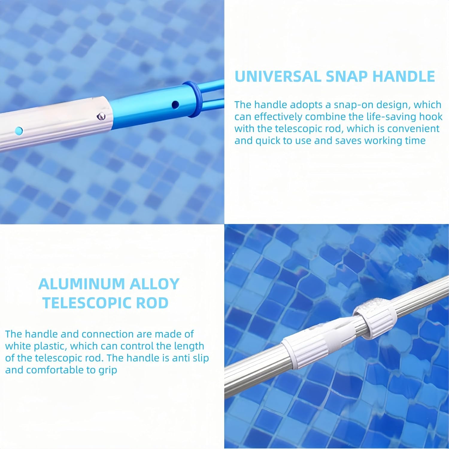 RETRATTABILE: il design retrattile rende il bastone più compatto e poco ingombrante quando non in uso. La lunghezza del bastone può essere estesa se necessario, a seconda della situazione, il che è conveniente per i soccorritori. Sono disponibili tre lunghezze retrattili a seconda delle esigenze. SALVATORE PER LA PISCINA: Poiché l'estate è la stagione delle frequenti attività acquatiche, la sicurezza in piscina e in acqua è una priorità assoluta. Il gancio di sicurezza per piscina non solo si estende facilmente alla lunghezza desiderata, ma può anche aiutarti in qualsiasi situazione. Ovunque ti trovi in acqua, tutto ciò che devi fare è chiedere aiuto ai tuoi soccorritori e possono facilmente tirarti fuori dall"acqua con questo gancio di salvataggio. MULTIFUNZIONALE: i pali di sicurezza per piscine sono una parte importante dell'attrezzatura di sicurezza, un dispositivo di salvataggio di emergenza utilizzato per aiutare i nuotatori in difficoltà o che annegano e dovrebbero essere presenti in qualsiasi piscina o ambiente idrico potenzialmente pericoloso. Ideale per piscine, parchi acquatici, spiagge, yacht, laghi, barche e molto altro ancora. Gancio di sicurezza in alluminio per PISCINA: il gancio di sicurezza per piscine è realizzato con materiali in alluminio che resistono alle difficili condizioni della piscina. È resistente, robusto e durerà per anni. I ganci di sicurezza per piscina di Hydrotools sono strumenti multiuso che possono essere utilizzati per una varietà di scopi. Oltre alla sicurezza, sono anche molto adatti per recuperare giocattoli, foglie e altri rifiuti che sono caduti in piscina.