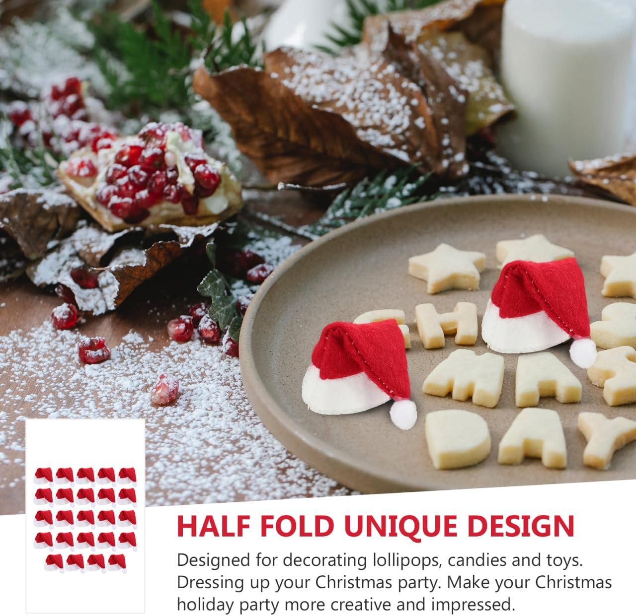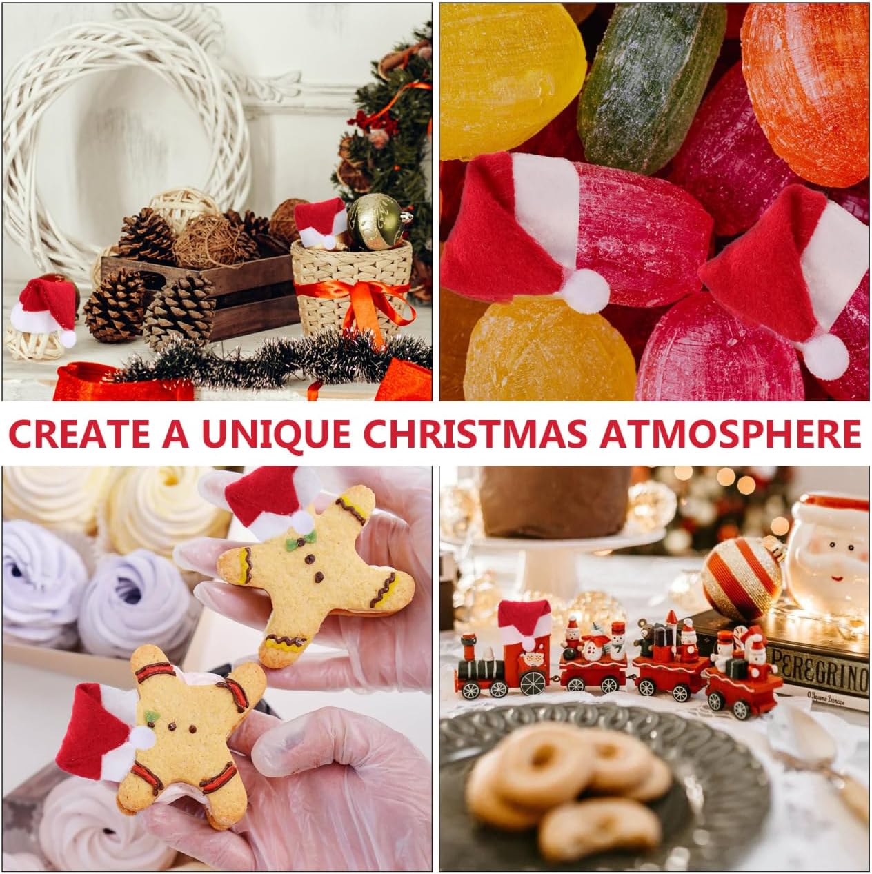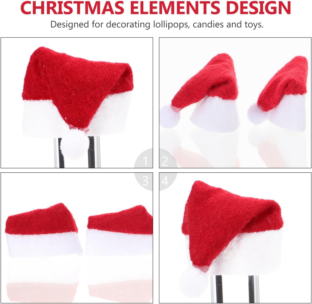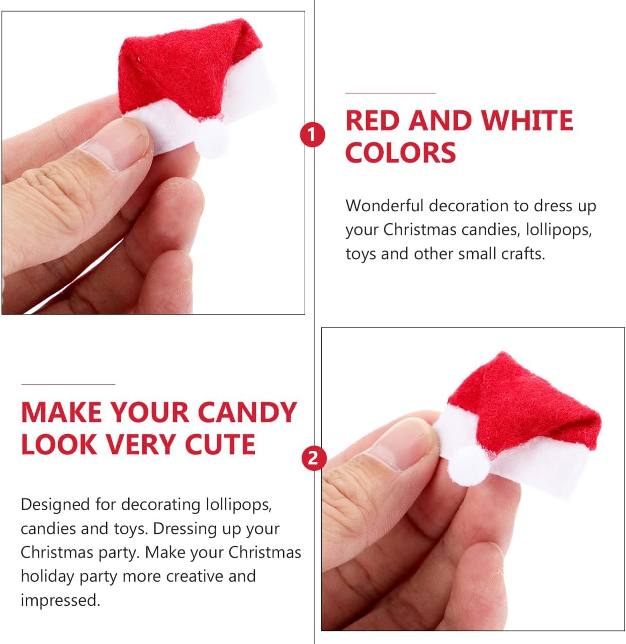 Contenuto della confezione: 1 sacchetto di 24 cappelli di Babbo Natale lecca-lecca. Caratteristiche: -Colore: Babbo Natale rosso - Dimensioni: 7,50 x 3,00 x 0,50 cm/2,95 x 1,18 x 0,20 pollici cappello di Natale - Materiale: piccoli cappelli di Babbo Natale tessuto non tessuto per fai da te. - Informazioni sul prodotto: mini decorazione per cappelli di Natale. - Materiale di alta qualità, riutilizzabile, accessorio perfetto per creare un'atmosfera natalizia in formato mini. - Materiale resistente per una lunga durata -Cappello di Natale. - Una fantastica idea regalo per gli amici che vogliono organizzare un'incantevole festa con cappelli di Babbo Natale. - Meravigliosa decorazione per decorare caramelle natalizie, lecca-lecca, giocattoli e altri piccoli lavori di artigianato, piccoli cappelli di Babbo Natale. - Le caratteristiche con elementi natalizi garantiscono popolarità. Mini cappelli di Babbo Natale Descrizione del prodotto: Cappello di Natale. Abbellisci la tua festa di Natale. Il materiale dei cappelli di Natale, progettato con elementi natalizi, garantisce popolarità e praticità. Piccoli cappelli di Babbo Natale per . Rendi la tua festa di Natale più creativa e suggestiva. Mini cappelli di Babbo Natale per decorare lecca-lecca, caramelle e giocattoli.