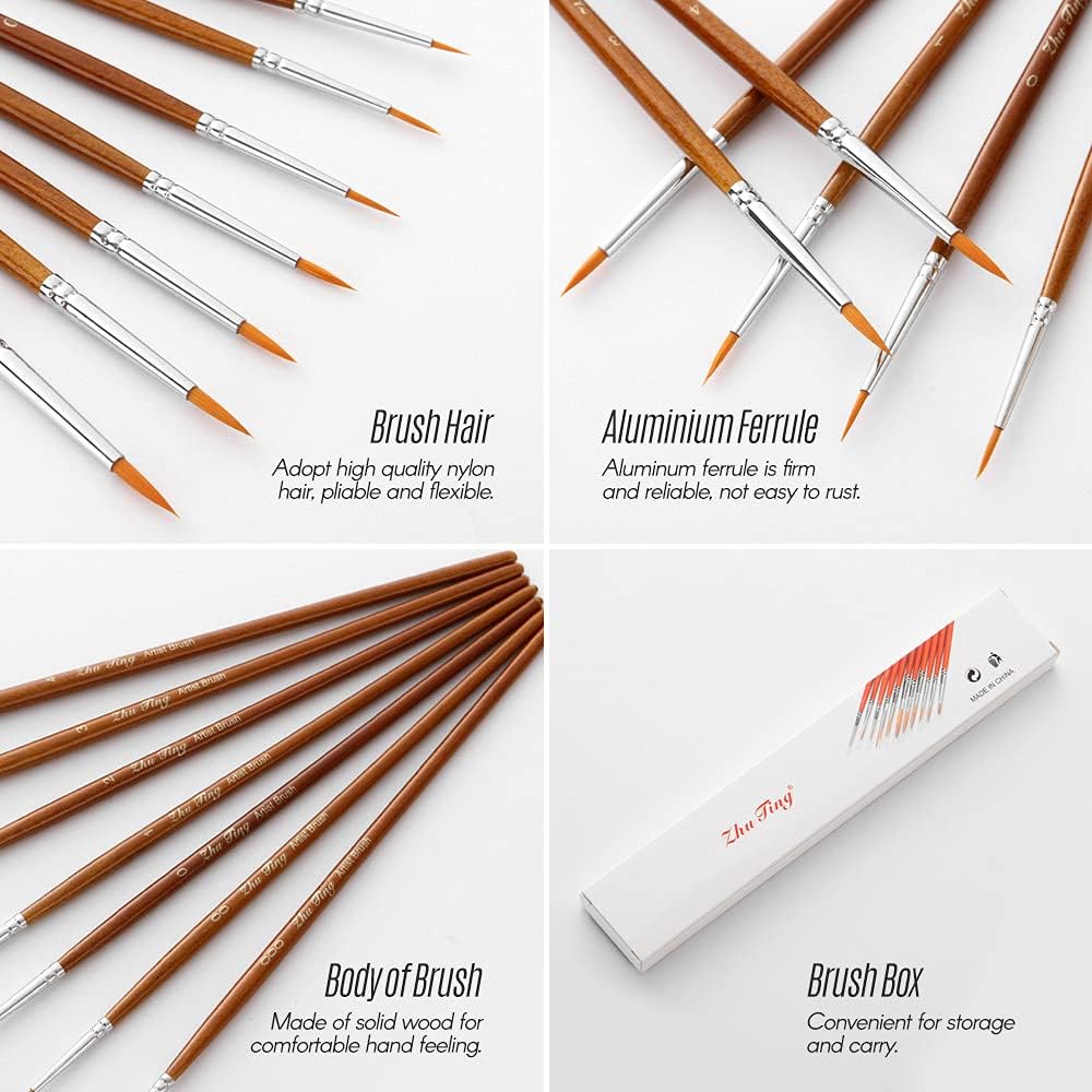 [PREMIUM NYLON HAIR] spazzole per capelli in nylon, flessibili e flessibili, garantiscono un facile assorbimento del colorante e spargimento minimo. [DESIGN ERGONOMICO] Comodi manici in legno massello per un'esperienza di pittura , penna marrone per un tocco elegante ed elegante. [DUREVOLE E AFFIDABILE] I tubi in alluminio verniciato forniscono resistenza e prevengono la ruggine, mantenendo efficacemente la testina in posizione. [MISURE MULTIPLE] Il set di 7 pezzi include la penna rotonda dal n. 000 al n. 4, adatta a diverse tecniche e preferenze di pittura. [AMPIA APPLICAZIONE] Adatto per dipinti ad acquerello, acrilico, olio e tempera, rendendolo una scelta versatile per artisti di tutti i livelli.