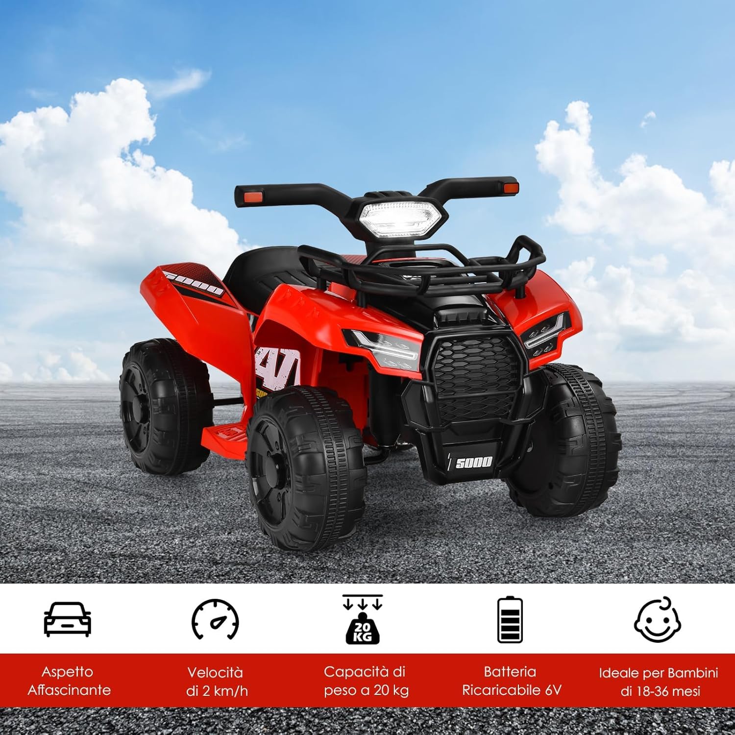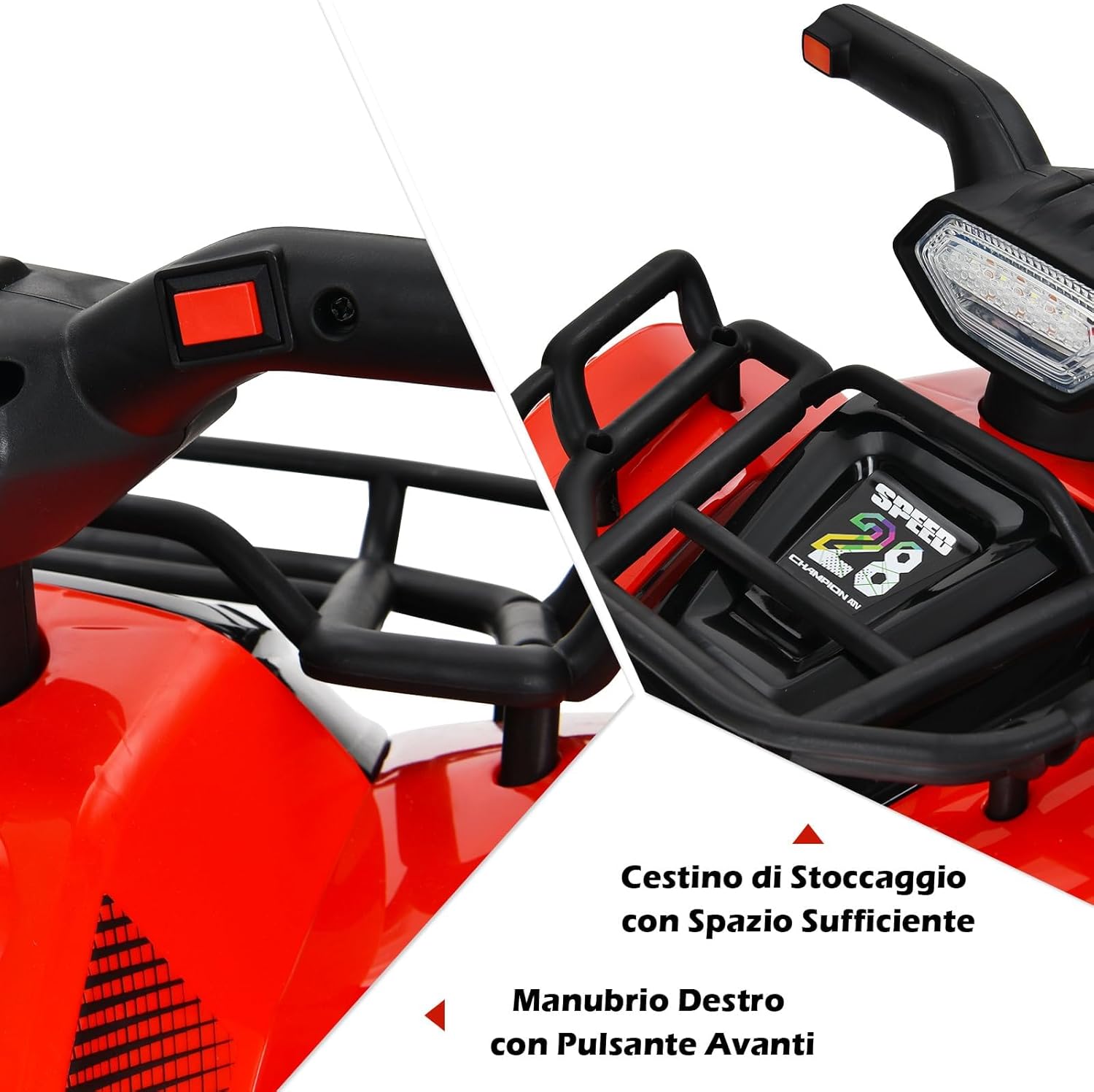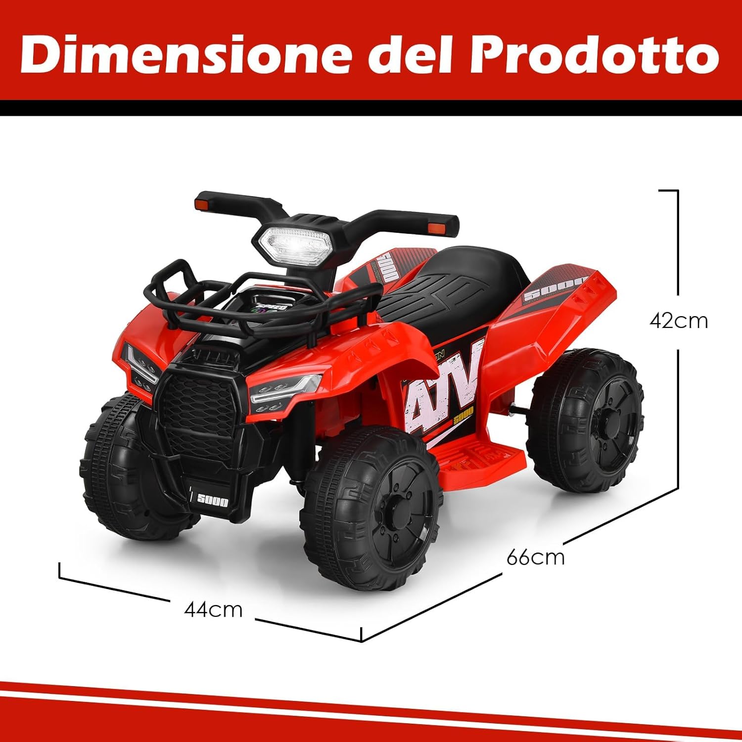 Piacere di guida realistico: la nostra auto elettrica ATV per bambini offre non solo il piacere di guidare, ma anche sicurezza, un design resistente agli urti e un controllo della velocità adatto ai bambini. Perfetta per bambini da 2 a 5 anni. Musica e luci LED per più divertimento: con funzioni musicali integrate e luci LED lampeggianti, questo quad elettrico per bambini offre una guida entusiasmante che delizierà i più piccoli. Facile da usare: i bambini possono apprezzare la sensazione di un vero controllo della guida. Design robusto: il quad elettrico per bambini è progettato per l'uso all'aperto, con pneumatici solidi e un telaio resistente che permette di affrontare facilmente terreni accidentati. Il sistema a doppia trazione rende questo quad per bambini ideale per una guida fluida su cemento, asfalto, pavimentazioni e ghiaia, perfetto per avventure fuoristrada e al chiuso. Può essere utilizzato anche all'interno. Lunga durata della batteria e ricarica facile: con una potente batteria da 12V, questa auto elettrica offre ai bambini lunghe ore di gioco e può essere facilmente ricaricata grazie al caricabatterie fornito. Età consigliata: 2-5 anni. Montaggio necessario.