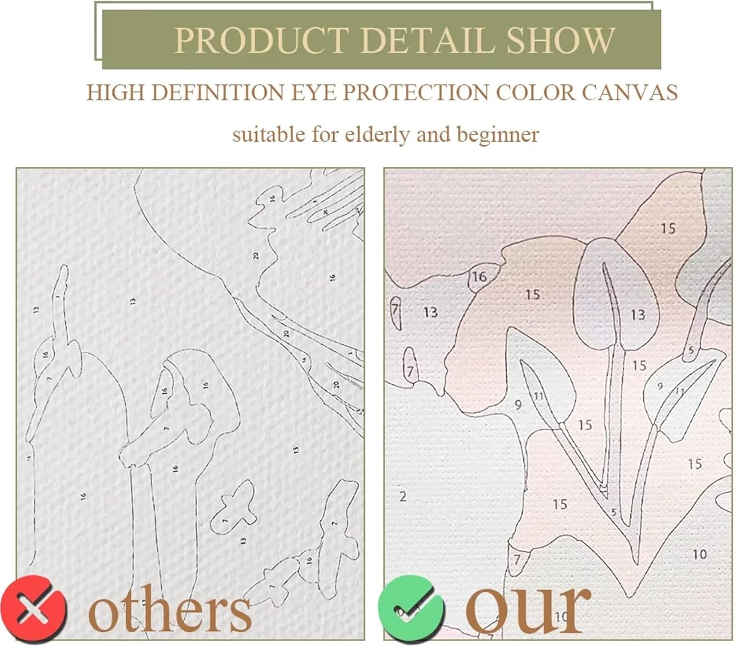 【Il pacchetto include】Dipingere per numeri per adulti. Includere con 1 pz pre-stampato tela d'arte strutturata (con cornice), 1 set di vernici acriliche, grandi dimensioni con set multipli di vernici acriliche di pennelli, 1 set di pennelli (include 3 pz). Non c'è bisogno di acquistare cornici extra. 【Dipingere per numeri con cornice】Pittura per numero per bambini adulti. Pittura fai da te da numeri kit per adulti è un primo passo perfetto per godere di pittura di opere d'arte, non richiede alcuna abilità di pittura. 【Facile e divertente】È necessario abbinare i numeri per colore, finire uno per uno della vernice e le figure sulla tela per riempire la vernice. Il telaio in legno può essere smontato e messo insieme in qualsiasi momento, facile da trasportare. È facile appenderlo al muro dopo aver finito il dipinto. 【HD Color Canvas】A differenza di tela normale, usiamo tela speciale di colore hd. Le tele colorate rendono più facile distinguere le aree digitali e dipingere per lunghi periodi di tempo non affatica gli occhi. 【Pittura per numeri】Dipingere da numeri con cornice lo rende facile da esporre, appeso al muro o appoggiato al tavolo come un dipinto decorativo in soggiorno, camera da letto, sala da pranzo, sala studio e altri luoghi. Regalo perfetto per compleanno, matrimonio, festa, Natale, ecc.