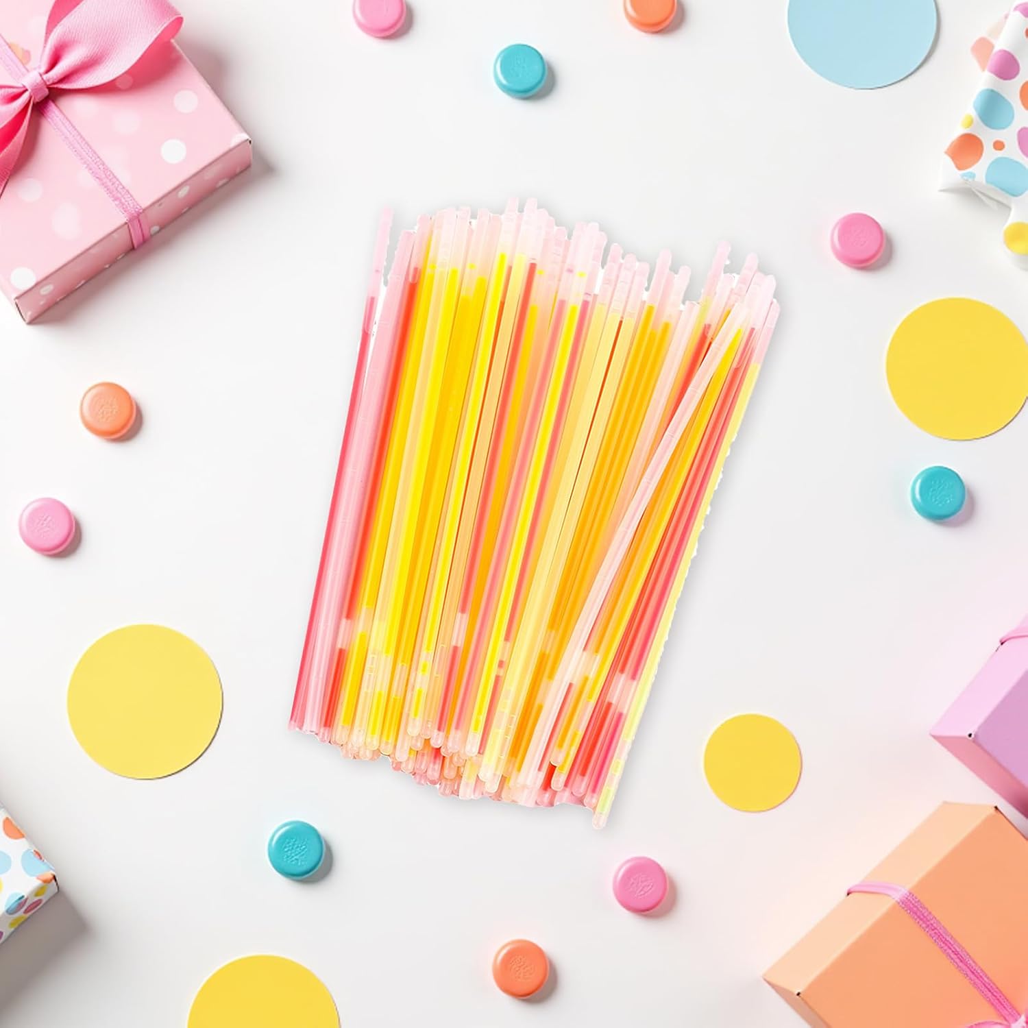 Scelte di colori vivaci: con bastoncini luminosi colorati in varie tonalità, questi bastoncini luminosi per bomboniere migliorano istantaneamente l'atmosfera della festa e diventano il punto culminante decorativo di qualsiasi riunione Durata affidabile della luminosità: la nostra confezione sfusa di bastoncini luminosi garantisce un'illuminazione a lungo termine, offrendo un divertimento senza fine come giocattolo luminoso per feste o gioielli con bastoncini luminosi anche per eventi notturni Portatile e leggero: queste bacchette luminose in grandi confezioni per feste sono facili da trasportare, rendendo le forniture luminose per feste perfette per attività all'aperto come campeggio o festival Facile da usare: attiva i tuoi braccialetti luminosi al buio piegando e bloccando i connettori, non sono necessari strumenti speciali, ideali per illuminare i regalini delle feste per i bambini Opzioni di forme creative: crea facilmente braccialetti, collane o cinture con bastoncini luminosi, consentendoti di creare braccialetti luminosi unici all'ingrosso o gioielli luminosi per le feste