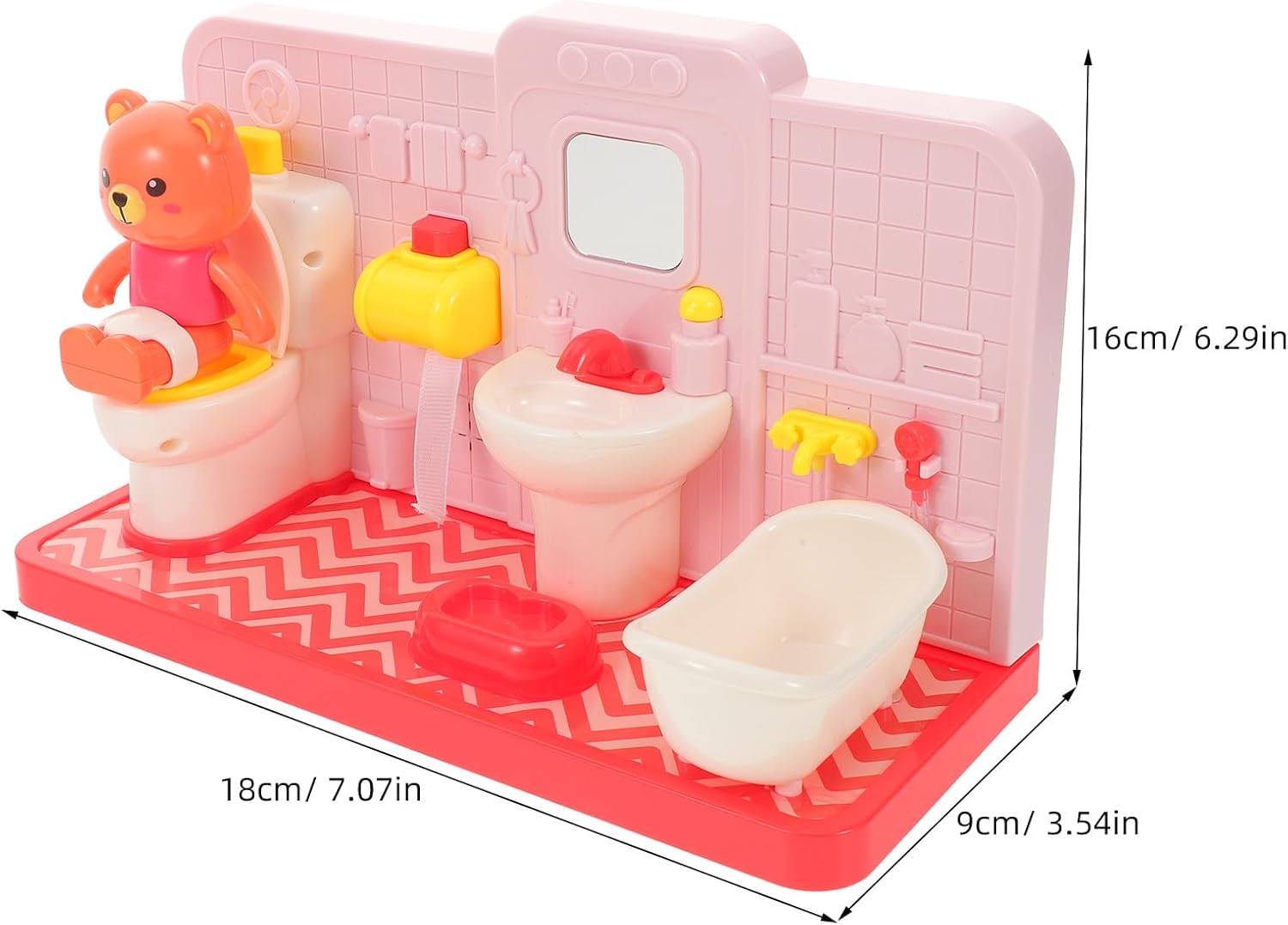 Design realistico: questo giocattolo per il bagno della casa delle bambole presenta un set da gioco per WC in miniatura realistico, che aiuta i bambini ad adattarsi facilmente alle vere esperienze di addestramento al vasino e a sviluppare buone abitudini in bagno Set da gioco per l'addestramento al vasino: il set da gioco per il bagno finto combina un simpatico orsetto giocattolo, un divertente giocattolo per il water e mini mobili da bagno, stimolando l'entusiasmo del tuo bambino per i giochi di ruolo in bagno e i giochi di Dimensioni perfette: mini set di giocattoli da bagno / accessori per bambole, la struttura compatta assicura che i bambini possano praticare autonomamente le routine del bagno ovunque in casa Gioco educativo: i giocattoli per l'addestramento al vasino / set da gioco educativo per il water incoraggiano l'apprendimento precoce, coltivando le capacità sociali e linguistiche dei bambini attraverso divertenti giocattoli per finta toilette Facile manutenzione: progettato per genitori impegnati, il giocattolo da bagno per l'addestramento al vasino / set da gioco per il water con simpatico orsetto è facile da pulire, garantendo sessioni di gioco di ruolo sicure per bambini e piacevoli momenti in famiglia
