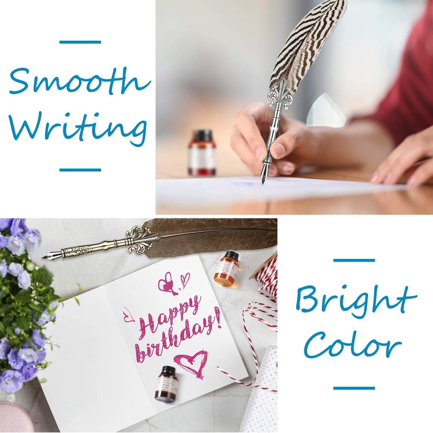 Inchiostro privo di carbonio: l’inchiostro senza carbonio ha un’elevata permeabilità e una buona fluidità. Offre un’eccellente qualità di riproduzione su superfici assorbenti con un’ottima resistenza allo scolorimento. Pertanto, scorre liberamente senza intasamenti. L’inchiostro può essere utilizzato per penne stilografiche e penne a immersione con vari metodi di ricarica dell’inchiostro, come convertitori a pistoni, convertitori a compressione e altro ancora. Ingredienti di alta qualità: il nostro inchiostro formulato in laboratorio non contiene disperdenti. L’inchiostro è realizzato con coloranti solubili sicuri, dai colori vivaci e atossici. Inoltre, l’inchiostro ha un’ottima fluidità per conferire ai colori vivacità e resistenza allo scolorimento duratura senza che si deteriori o sbiadisca. Inchiostro di colori assortiti: il set di inchiostri per calligrafia include 10 colori assortiti (nero, blu, rosso, verde, viola, arancione, marrone, rosa, bordeaux, turchese) e ogni colore è contenuto all’interno di un flacone da 20 ml. Pertanto, avrai la libertà di scegliere tra vari colori per vari stili di scrittura, disegno e diario. Fantastico design della confezione: i 10 flaconi di inchiostro sono ben posizionati all’interno della scatola con stampi in schiuma. Ogni flacone di inchiostro è stabilizzato tramite uno stampo progettato in maniera perfetta. Pertanto, ti libera dalla preoccupazione di rotture o perdite durante il processo successivo. Impeccabile idea regalo: questo set di inchiostri dai colori assortiti è perfetto per principianti e professionisti, per esercitarsi nella calligrafia. Un regalo perfetto per Natale, vacanze e altre occasioni speciali.