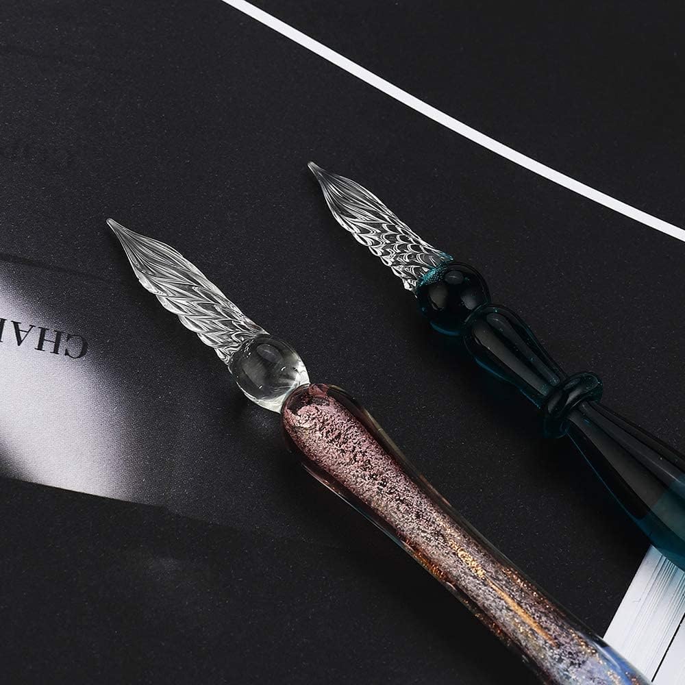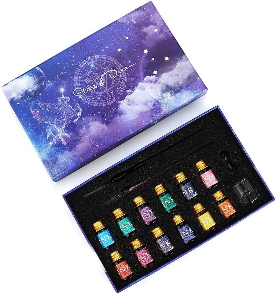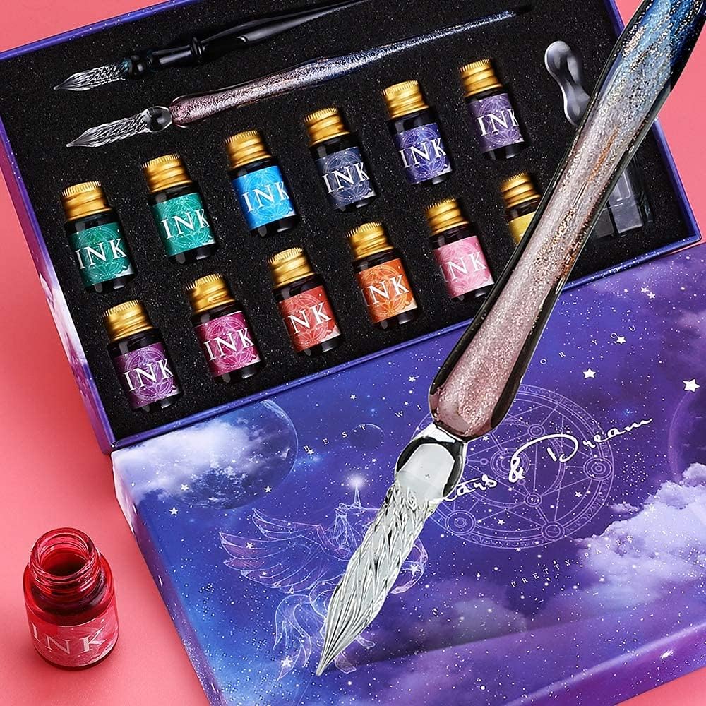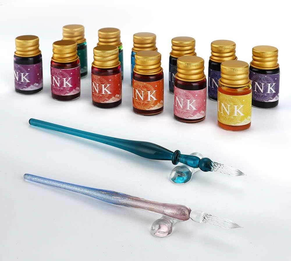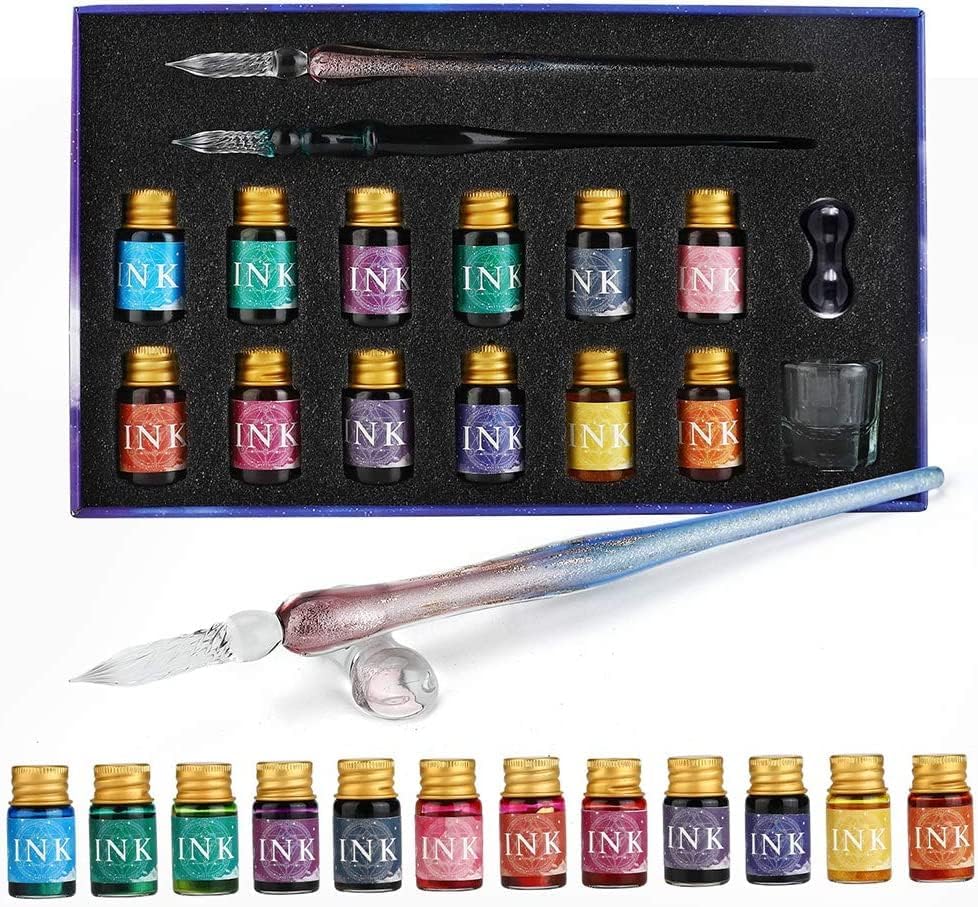 Sofisticato set calligrafico: il sofisticato set di calligrafia include 2 penne a immersione in vetro cristallo, 12 x 7 ml colori assortiti di inchiostro, 1 portapenne in vetro e 1 tazza di pulizia. Perfetto per biglietti di auguri, cartoline, firme, calligrafia, disegno, decorazione e regalo. Esperienza di scrittura liscia: le penne a immersione in vetro cristallo sono l'artigianato del vetro borosilicato di alta qualità. Lo squisito design a spirale aumenta l'assorbimento dell'inchiostro e consente all'inchiostro di scorrere lungo la scanalatura per un'esperienza di scrittura più lunga e fluida. Con un solo tuffo, scrivi senza sforzo 40-50 parole. Pulire facilmente con acqua e asciugare con i tovaglioli in 10 secondi. Inoltre, le penne in vetro consentono di passare da un colore all'altro senza ricaricare. I 12 colori assortiti di inchiostro offrono più scelte, strati e profondità. Questi inchiostri contengono anche polvere dorata per una dimostrazione di colore scintillante e altamente riflettente. L'inchiostro è resistente alla luce, archivio e permanente. Opere per illustrazione e scrittura. Agitare bene il flacone prima dell'uso. Scelta regalo impeccabile: il design premuroso e l'eccellente confezione si combinano in un regalo elegante e di buon gusto. Ideale per scrittori, artisti, cari amici e persone care in occasioni speciali come lauree e compleanni. Sarai sorpreso dal materiale di alta qualità e dall'esperienza di scrittura fluida. Goditi i complimenti per le tue bellissime penne calligrafiche! Se, per qualsiasi motivo, non ami assolutamente il tuo set di penne calligrafiche. Restituiscilo, senza fare domande. O sostituirlo, se c'è un problema.