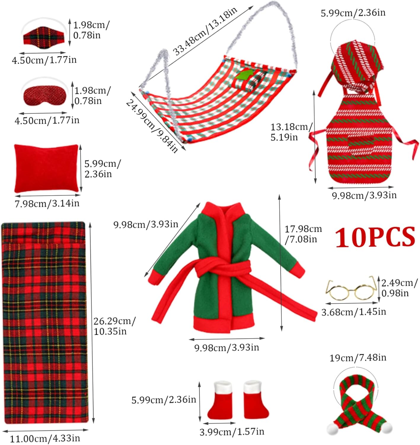 Un fantastico per Natale: i vestiti degli elfi sono fantastici per i bambini durante le festività natalizie..Possono essere utilizzati per giochi di finzione, giochi di ruolo e per soddisfare i desideri di cura delle ragazze..Forniscono divertimento e gioia senza fine, portando in vita lo spirito del Natale. Materiali di qualità: gli accessori Elf sono realizzati con tessuti di qualità e materiali non tessuti, che sono e..Sono resistenti allo strappo e allo sbiadimento, garantendo che possano essere riutilizzati senza perdere i loro colori vivaci. Tema natalizio: questi set di elfi natalizi sono progettati con vari elementi natalizi, come rosso e verde, plaid, calzini natalizi, ecc. Sono molto adatti per aggiungere un'atmosfera festosa e creare una gioiosa atmosfera natalizia. Decorazione multifunzionale: il kit degli elfi di Natale è perfetto per la decorazione delle bambole, l'artigianato natalizio e la creazione di esposizioni fantasiose a casa..Posizionali sul tuo albero, mantello o tavolo per creare una magica atmosfera vacanziera. Un set completo per gli elfi: Il kit degli elfi natalizi contiene tutto il necessario per creare scene accattivanti..All'interno troverai un mini sacco a pelo, un accappatoio, occhiali, sciarpa, calzini, amaca, ecc., tutti pensati per rendere realistica la tua bambola da elfo.