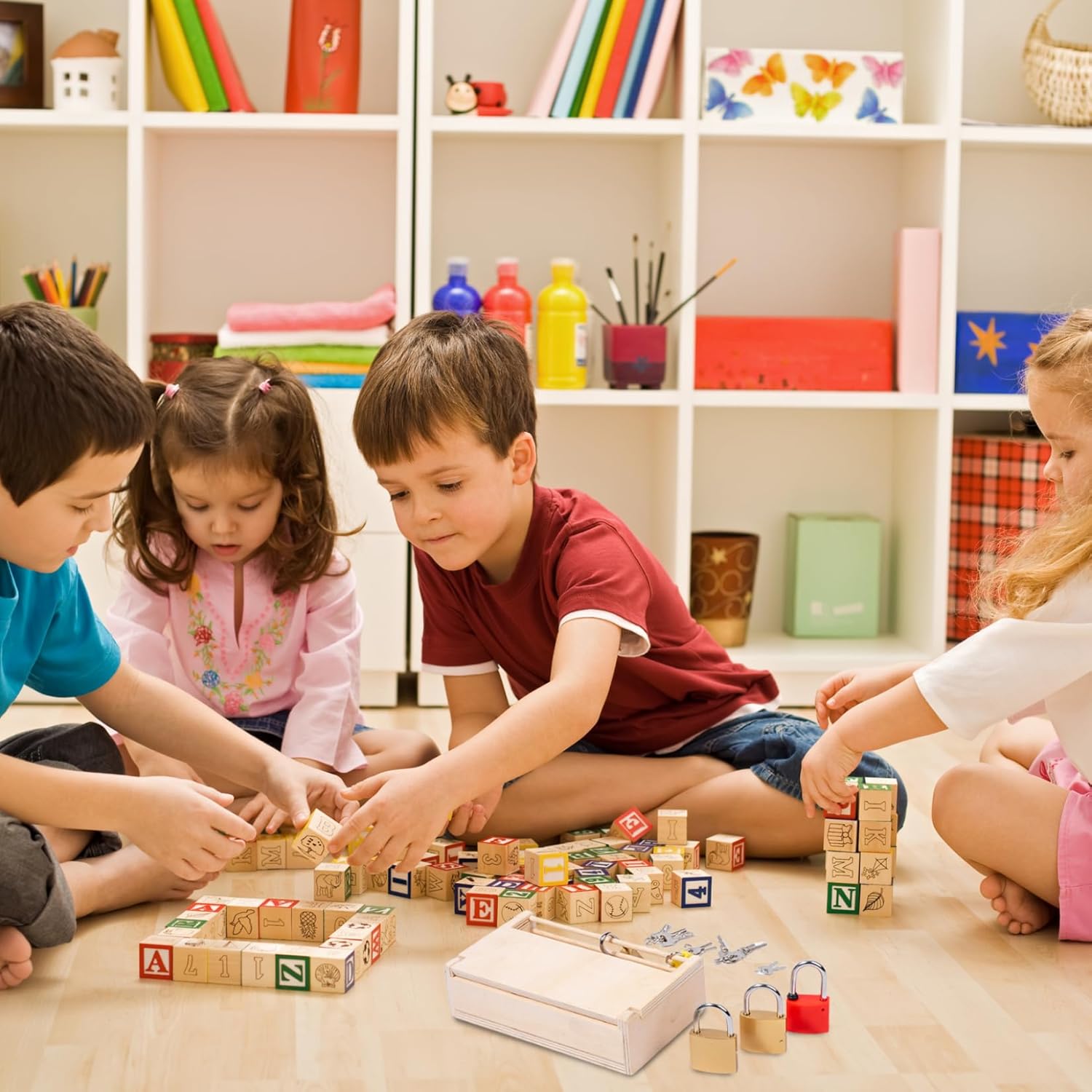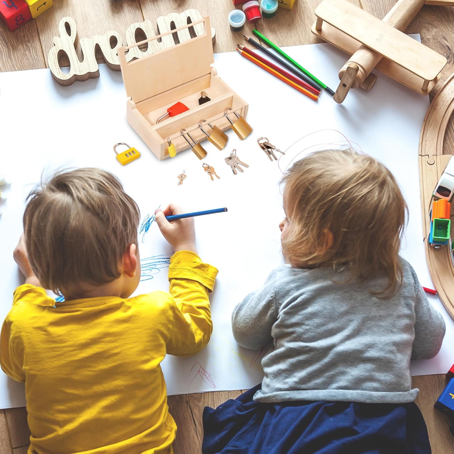 Sviluppo delle capacità motorie fini: girare le chiavi, aprire le serrature e scoprire la gioia richiede precisione e destrezza, che migliorano le capacità motorie, la forza delle mani e la coordinazione. Gioco educativo: questi giocattoli con serratura e chiave non sono solo divertenti ma anche educativi..Introducono i bambini ai concetti di causa ed effetto, risoluzione dei problemi e riconoscimento della forma. Perfetto per i bambini: questo giocattolo educativo è ideale per compleanni, vacanze o occasioni speciali..Offre infinite ore di intrattenimento e allo stesso tempo coltiva competenze preziose. Costruzione in legno di qualità: realizzati in legno di qualità, i set di giocattoli con lucchetti sono robusti e garantiscono che possano resistere all'esplorazione entusiasta delle mani dei più piccoli. Nessuna sbavatura e gioco sicuro: questo giocattolo con serratura e chiave è accuratamente lucidato per garantire sicurezza e prevenire eventuali sbavature o lesioni alle mani..I nostri giocattoli con serratura e chiave per i più piccoli hanno una lavorazione smussata arrotondata, non danneggeranno le tenere manine del bambino, stai certo che il bambino giocherà.
