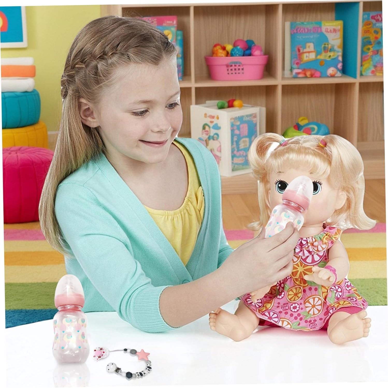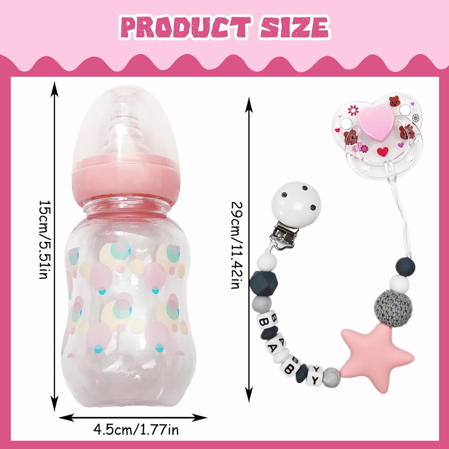 Incoraggia il gioco fantasioso: stimola la creatività e l'immaginazione di tuo figlio con questo delizioso set di accessori..Fingere di prendersi cura di una bambola aiuta i bambini a sviluppare capacità di narrazione e incoraggia il gioco di ruolo, consentendo loro di esplorare le interazioni sociali in modo divertente e educativo. Perfetto per i giovani caregiver: questo set di accessori per bambole è eccellente per compleanni, vacanze o qualsiasi occasione speciale!.Ideale per i bambini piccoli che amano prendersi cura delle proprie bambole, incoraggia la comprensione e la responsabilità offrendo allo stesso tempo innumerevoli ore di divertimento. Design funzionale e realistico: i nostri ciucci per bambole sono dotati di un design pratico che migliora il realismo del gioco..La funzione magnetica attacca saldamente alla bambola, rendendo il momento della pappa più coinvolgente..Inoltre, sono facili da pulire e mantenere, garantendo durata e usabilità a lungo termine. Set completo per l'alimentazione: il nostro set di accessori per bambole include tutto ciò di cui il tuo bambino ha bisogno per un gioco coinvolgente con le bambole, con biberon, un ciuccio magnetico e una catenella per ciuccio..Questo set completo consente scenari di alimentazione realistici, arricchendo l'esperienza di gioco del tuo bambino. Migliora le capacità motorie: progettati per promuovere lo sviluppo motorio, questi accessori aiutano i bambini a praticare la coordinazione e la destrezza..Mentre manipolano biberon e ciucci, i bambini affinano i movimenti delle mani mentre impegnano in un gioco che imita le situazioni della vita reale.