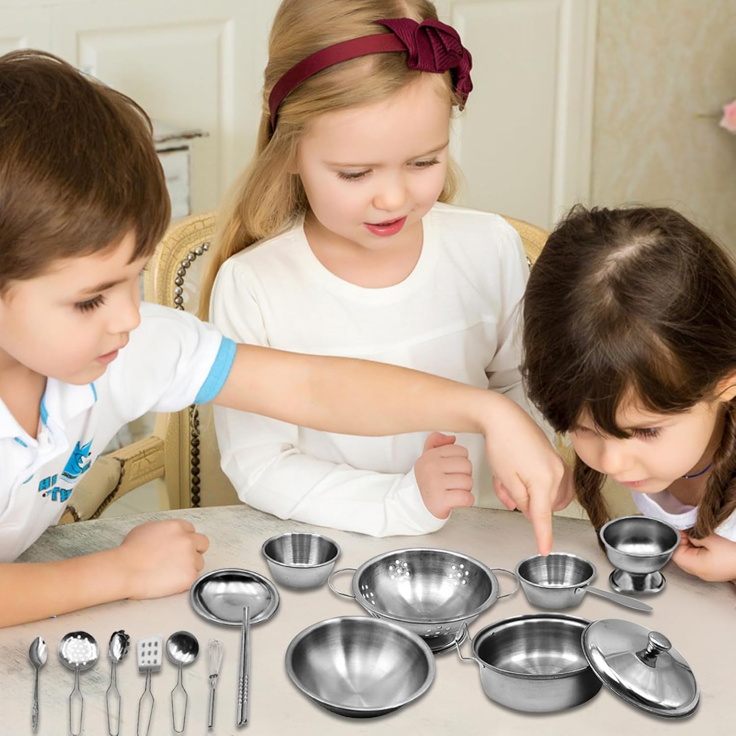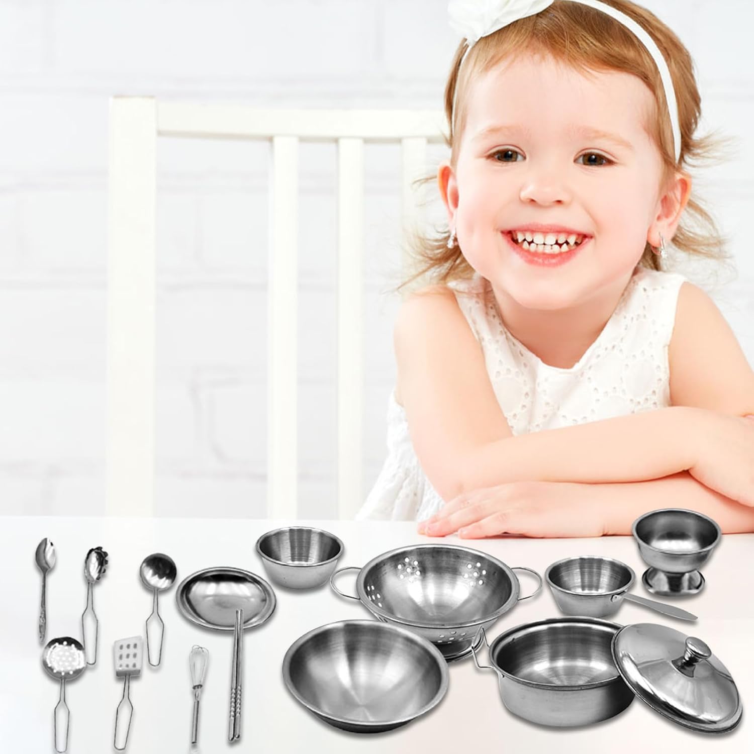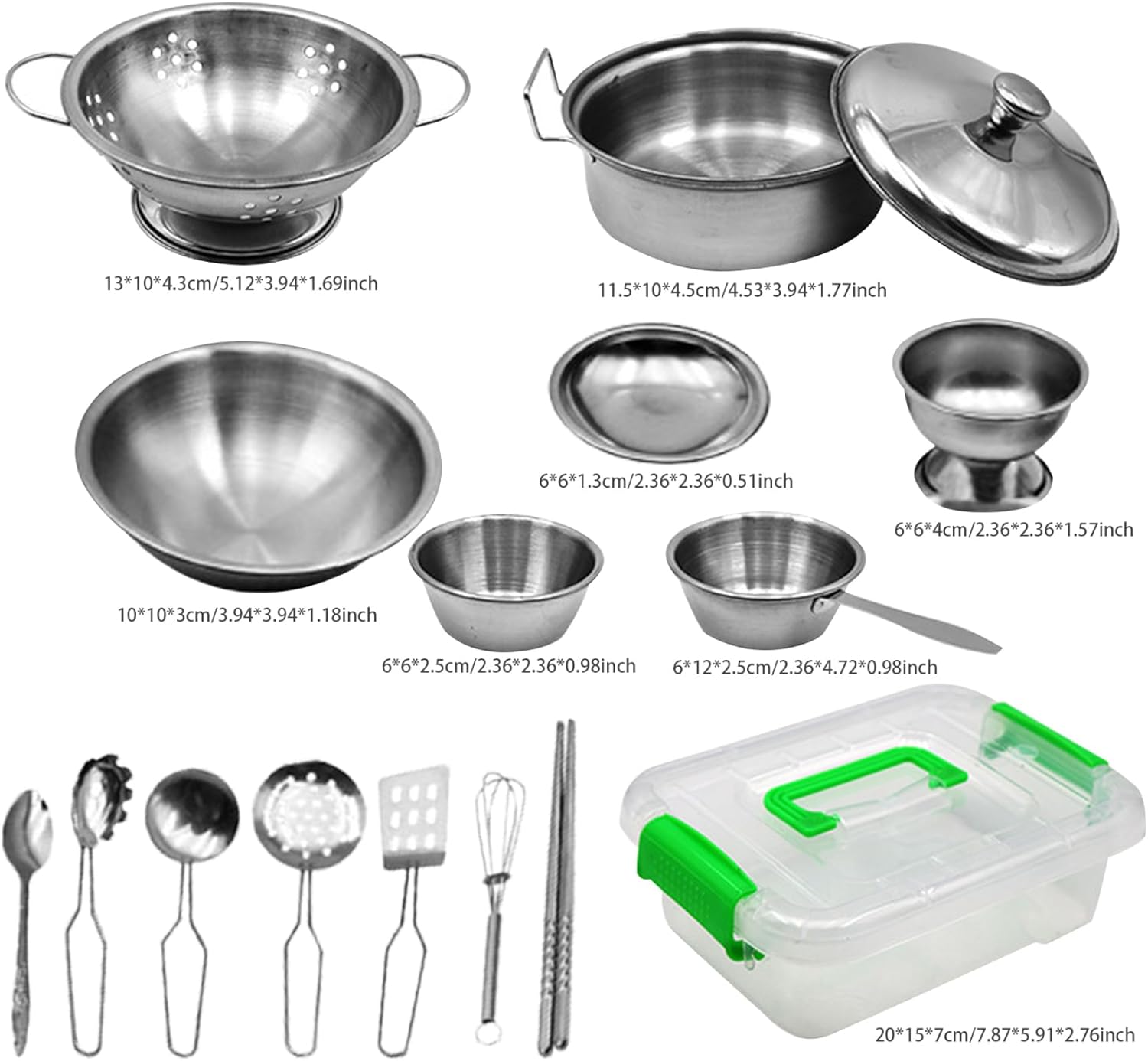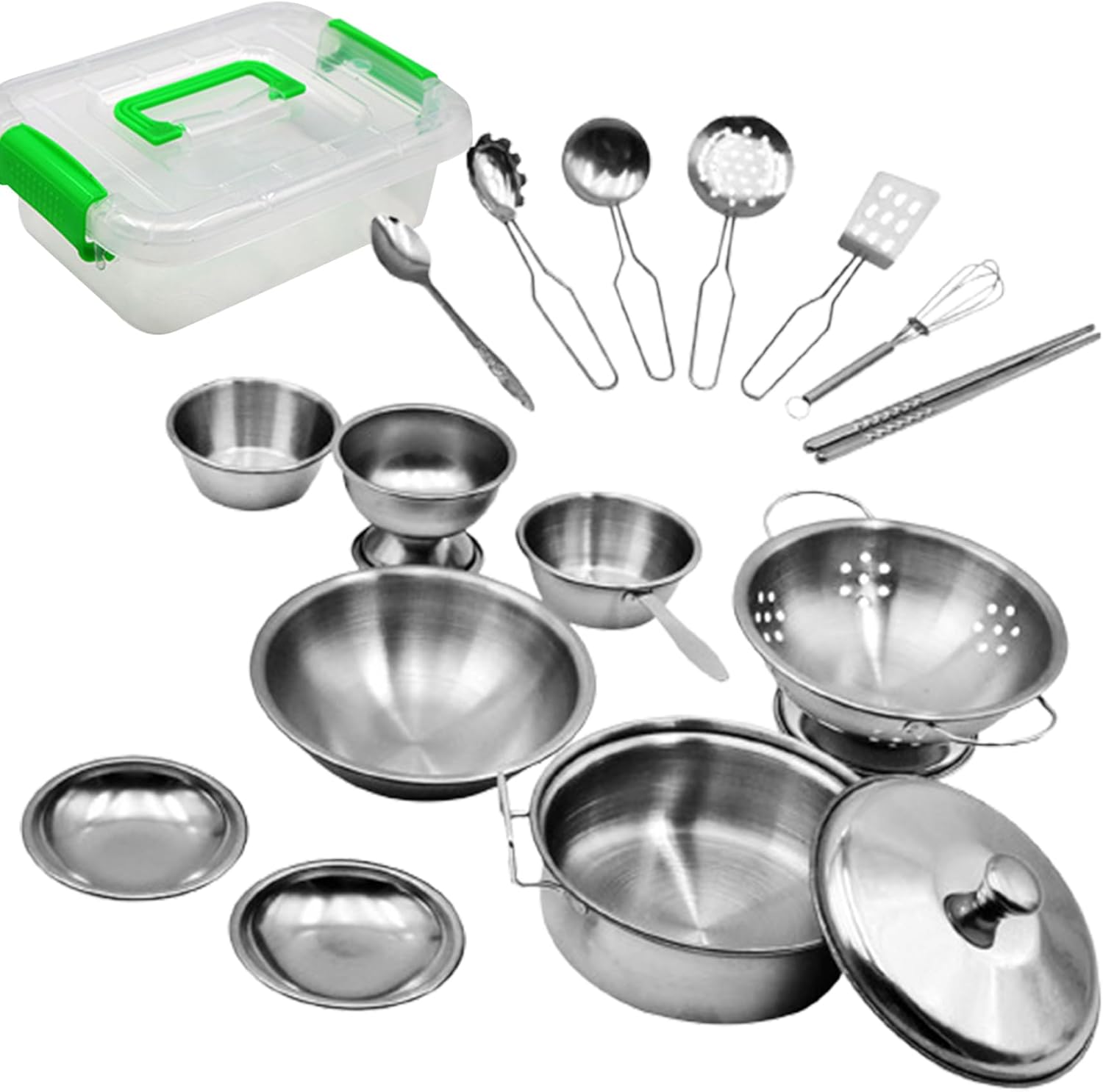 Scelta ideale: il set di pentole e padelle giocattolo è eccellente per i bambini che amano giocare in casa o cucinare..È un modo divertente e coinvolgente per intrattenere i bambini e allontanarli dalla noia. Ampie applicazioni: questo set da cucina per bambini è perfetto per una varietà di scenari di gioco, come la casa da gioco o la casa delle bambole..Incoraggia i bambini a usare la loro immaginazione e creatività mentre imparano anche gli strumenti e le tecniche della cucina. Contenuto della confezione: il set di pentole e padelle per bambini viene fornito con una varietà di articoli tra cui un cesto di frutta, una pentola, un copripentola, una bacinella, una tazza, un filtro per l'acqua, un piatto, un bicchiere alto, un paio di bacchette, un mestolo, uno scolapasta, una spatola, un cucchiaio, uno sbattitore per le uova e altro ancora..Con una gamma così diversificata di articoli, i bambini possono godersi ore di gioco fantasioso ed esplorazione. Conservazione comoda e facile: il set di pentole e padelle da gioco viene fornito con una scatola di plastica dotata di una maniglia per un facile trasporto e stoccaggio..Ciò rende comodo portare il set in movimento o riporlo quando non viene utilizzato. e materiale sicuro: realizzato con robusti materiali metallici, il set da gioco con pentole e padelle per bambini è costruito per durare..È anche sicuro e sano, senza odori sgradevoli..La pregevole fattura e il design realistico lo rendono un'aggiunta interessante a qualsiasi cucina da gioco.