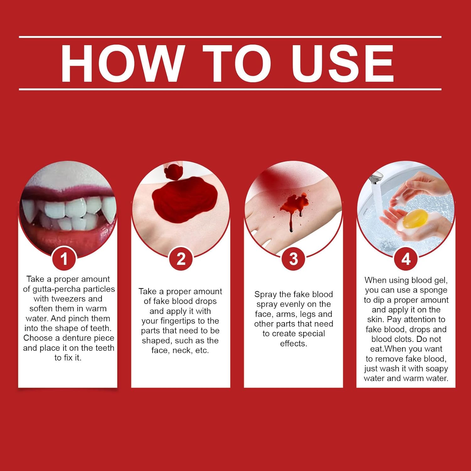 Sollevare photoshoot, concorsi di costume o scherzi con formule lavabili e sicure per la pelle che si rimuovono facilmente con acqua calda e sapone Questo set horror multiuso include applicatori di gel per sangue, strumenti e diverse misure di cattura per creare gli effetti sanguinosi per la classe professionale per il trucco di Halloween, per eventi cosplay o Haunted Houses Performances Il set Faux Blood di Halloween offre sangue artificiale sicuro e a base di pittura e realistiche zanne spaventose per un trucco drammatico ma delicato sui denti Ideale per gli appassionati di cosplay, halloween party e artisti teatrali che cercano un'estetica autentica spaventosa con una comoda e riutilizzabile in tre punti (1,3-1,7 cm) Caratteristiche adesive sicure per un posizionamento sicuro senza danni, abbinato a 30 gel per sangue e ponos antigraffio per applicazioni di trucco horror strutturate e durevoli