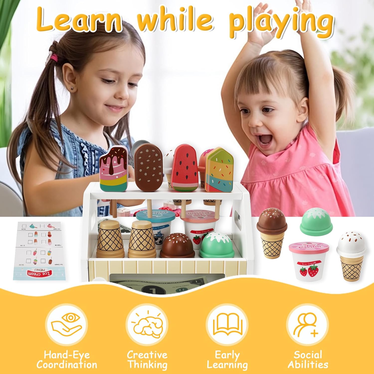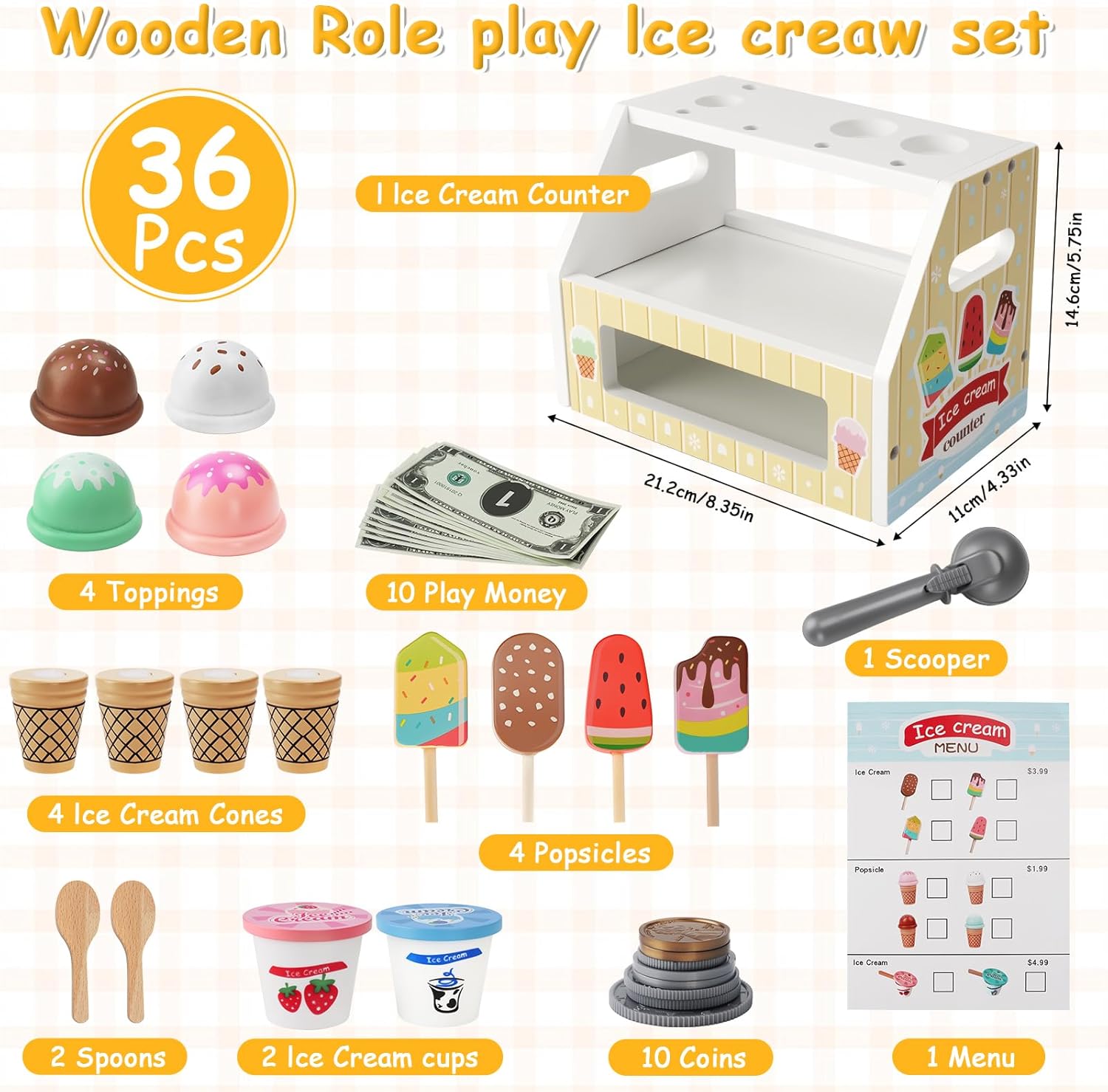 🍰SET BARRE PER GELATO - I nostri giocattoli in legno per gelateria includono un bancone del gelato, coni gelato, bastoncini di gelato colorati, coppe per gelato, palette per gelato, palette in legno, menu, soldi giocattolo e monete. Lascia che i tuoi bambini scatenino la loro immaginazione con questo gioco di ruolo del gestore di una gelateria 🧁MATERIALI DI ALTA QUALITÀ - Questa gelateria per bambini ha una lunga durata di vita dei giocattoli. Realizzato con materiali in legno selezionati, materiali naturali, non tossici, innocui e inodore, robusti e durevoli, così i bambini possono giocare in tutta tranquillità ✅DESIGN DI SIMULAZIONE DI SICUREZZA - Forme simulate di gelato, ghiaccioli e menu, colori brillanti, nessuna sbavatura sulla superficie del giocattolo, design con blocchi di particelle di grandi dimensioni, bordi e angoli lisci, proteggono le piccole mani dei bambini e non si faranno male quando giocano con i giocattoli in legno 🍧AIUTA A FAR CRESCERE I BAMBINI - Questo giocattolo in legno per gelateria per bambini consente ai bambini di giocare a giochi di ruolo, consentendo loro di agire come gelatai o gestori di negozi, coltivare la creatività, l'immaginazione e l'espressione dei bambini, educativi e divertenti. Aiuta i bambini a crescere felici 🎁GRANDE REGALO - Questa gelateria in legno per bambini è splendidamente realizzata e di alta qualità che piacerà a ogni bambino ed è perfetta per i bambini che vogliono giocare da soli o in gruppo. Il miglior regalo per ragazzi e ragazze a Natale, regali di compleanno, riunioni di feste, vacanze informali