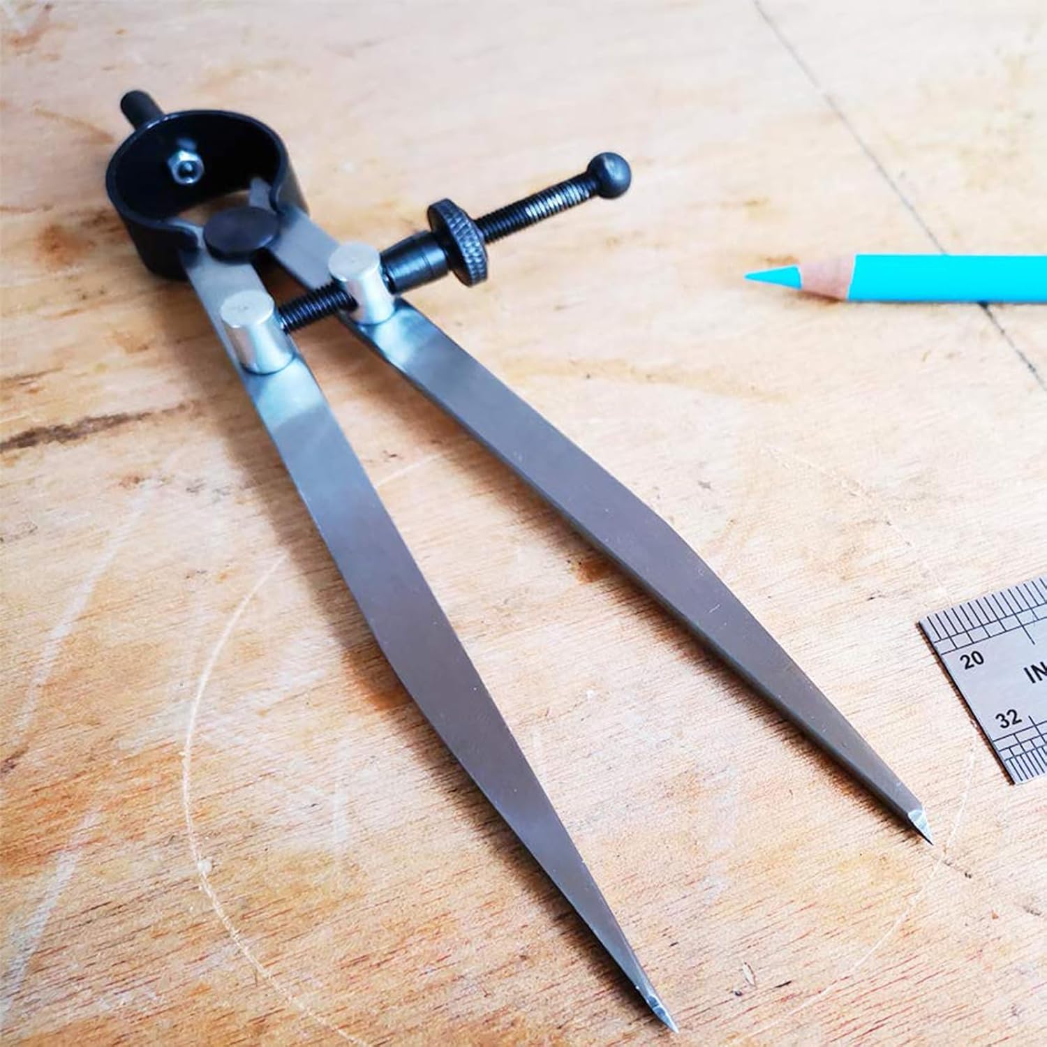 Bussola/divisore in pelle di precisione e resistente, utilizzato anche nella lavorazione del legno, lavorazione del metallo e altri lavori di disegno. Perfetto per disegnare archi, cerchi, calibri di divisione, linea di divisione, segmenti di linea, misurazione delle dimensioni, ecc. La lunghezza della gamba è di 15,2 cm, la portata massima è di 15,2 cm e può disegnare un cerchio fino a 30,5 cm. Realizzato in acciaio al carbonio di alta qualità, buona durezza, elevata durezza, robusto e durevole, resistente all'usura. Punte dure e affilate della bussola possono segnare con precisione il pezzo.