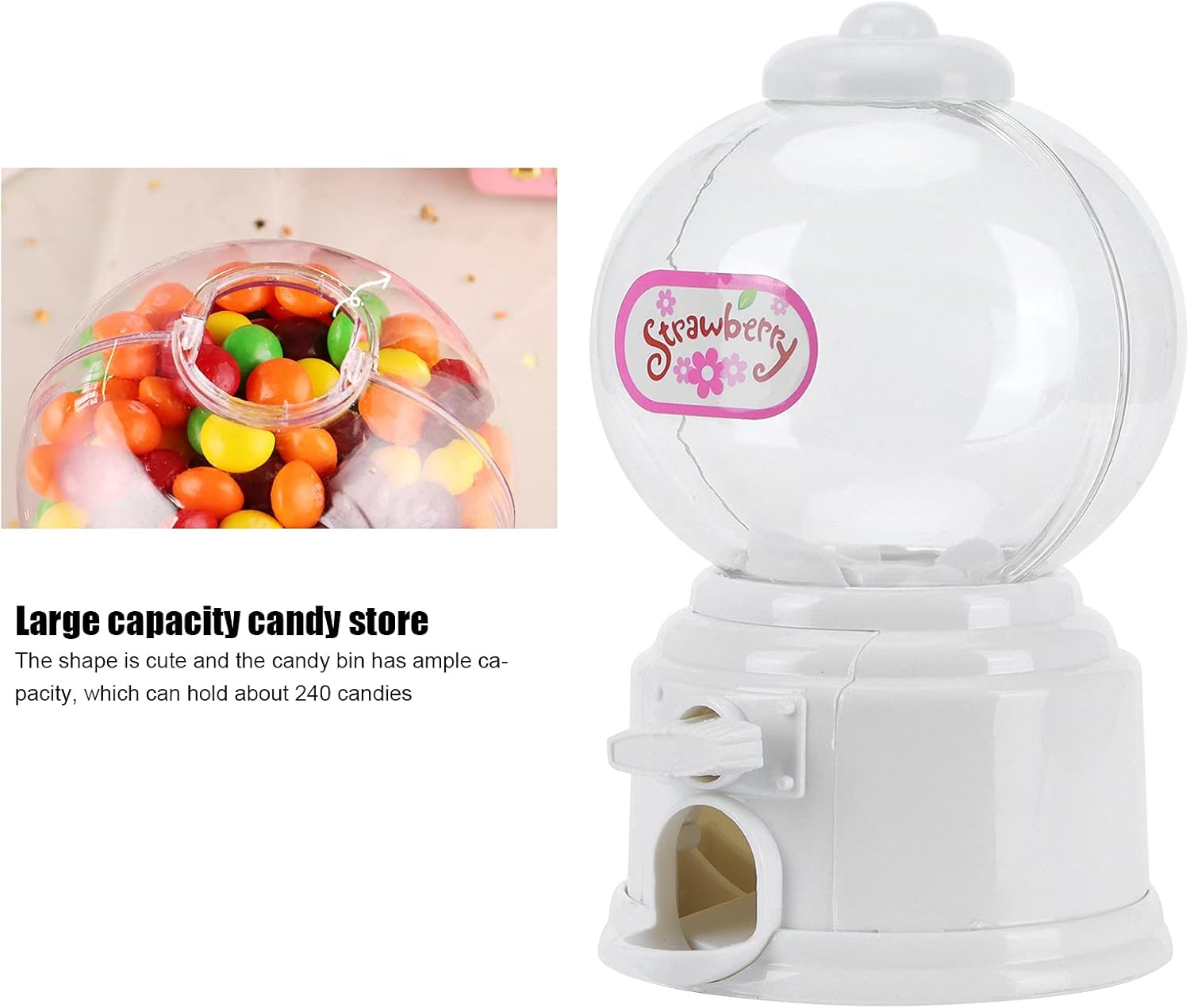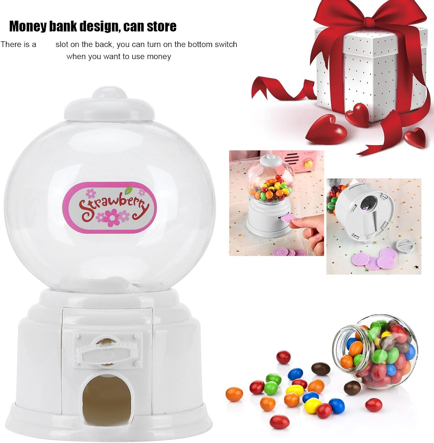 Mini salvadanaio, dall'aspetto squisito e adorabile, robusto, sicuro, non tossico e durevole. È ampiamente utilizzato per addii al celibato, matrimoni, baby shower, feste di compleanno o altre celebrazioni. Macchina per la conservazione delle caramelle, ha una capacità sufficiente per il contenitore delle caramelle, che può contenere circa 240 caramelle. Design dall'aspetto multifunzionale, adatto anche per l'uso come contenitore e distributore di caramelle. Dopo aver caricato gli snack, gira il pulsante in senso orario e appariranno gli snack, il che è molto interessante.