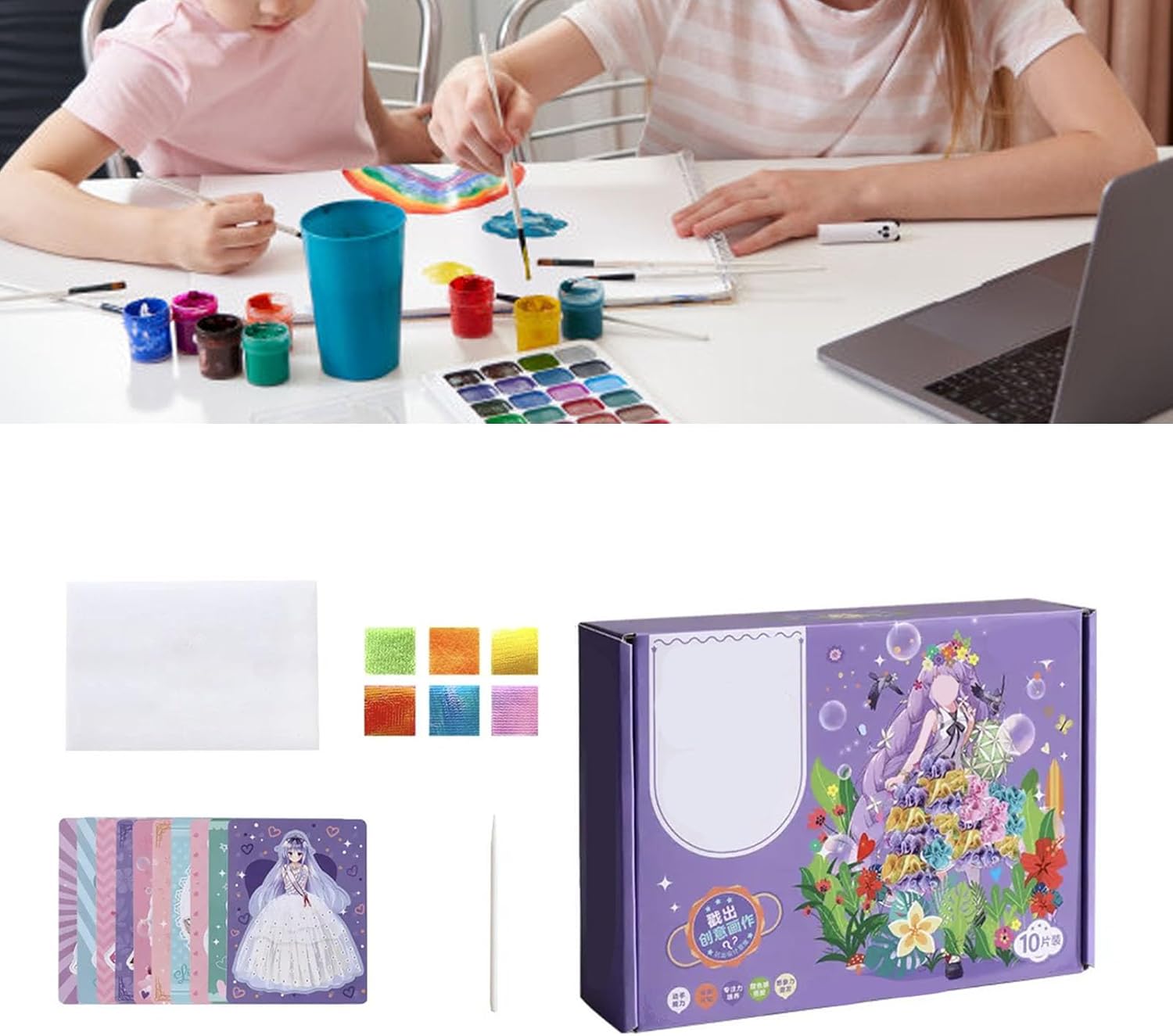 Giocattolo fai-da-te per lo sviluppo delle abilità: incoraggia l'apprendimento pratico e migliora la coordinazione occhio-mano mentre i bambini si divertono nel processo di creazione di oggetti unici con questo giocattolo interattivo fai-da-te. Entra in Princess Fantasy: lascia che i più piccoli si immergano in un mondo di principesse con questo libro di adesivi, caratterizzato da graziosi e incantevoli disegni di cartoni animati che ispirano l'immaginazione e la creatività. Kit portatile: la borsa in tessuto e la penna poke incluse consentono ai bambini di trasportare facilmente il loro kit fai-da-te ovunque vadano, consentendo creatività e divertimento in movimento. Adesivi da vestire: con un'ampia selezione di adesivi, i bambini possono dedicarsi al gioco di travestimento, mescolare e abbinare abiti e creare personaggi unici, il tutto migliorando la loro creatività e capacità motorie. Design senza colla: il giocattolo artigianale fai-da-te utilizza la tecnica del poke a doodle, eliminando la necessità di colla e garantendo un'esperienza di gioco e protetta per i bambini.