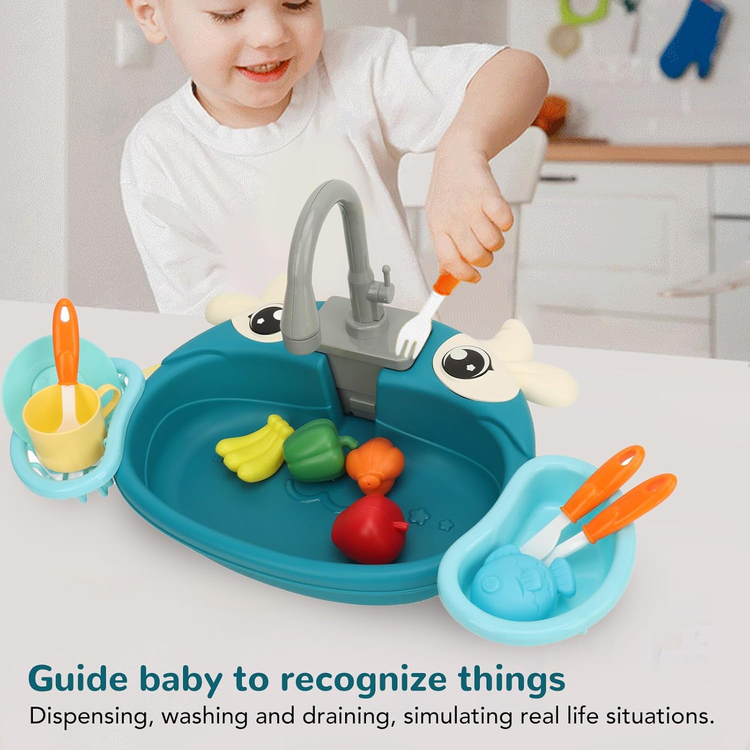 ESPERIENZA DOMESTICA: Simulazione di giocattoli per lavastoviglie elettriche, lascia che tuo figlio si goda la vera esperienza dei lavori domestici. GIOCO INTERATTIVO PER LA FAMIGLIA: i giocattoli elettrici per lavastoviglie da cucina possono essere utilizzati come gioco genitore-figlio per migliorare l'interazione tra i membri della famiglia. CONSERVAZIONE DEI PIATTI: i giocattoli elettrici per lavastoviglie da cucina sono dotati di un cestello scolapiatti, che può conservare i piatti lavati e coltivare l'eccellente abitudine di conservazione del bambino. SICURO ED ECOLOGICO: questo lavandino giocattolo realizzato in materiale plastico di alta qualità, è sicuro ed ecologico, i bambini giocano a proprio agio. ALTA SIMULAZIONE: giocattoli elettrici per lavastoviglie da cucina con batteria ricaricabile, azionamento elettrico, ciclo dell'acqua simulato, aumentano il divertimento e l'interazione del gioco.