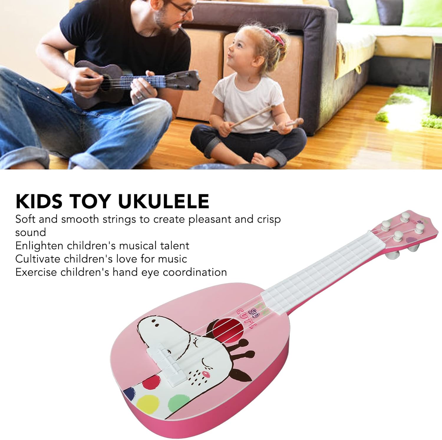 Effetto meraviglioso: illumina i talenti musicali dei bambini, coltiva gradualmente l'amore dei bambini per la musica, che aiuta a coltivare gli interessi e le specialità dei bambini. Prestazioni eccellenti: la chitarra è ben progettata con attenzione ai dettagli. Quando le corde vengono tirate, i fori circolari fanno vibrare l'aria all'interno e producono un tono. Corde morbide: il nostro ukulele è dotato di corde morbide e lisce che non causano disagio durante l'uso e il suo suono è piacevole e nitido. Costruzione affidabile: realizzata in plastica ed ecologica, robusta e resistente all'usura, durevole per prestazioni durature. ideale: design elegante e carino che piacerà ai bambini di tutte le età, il che è un per i tuoi bambini.