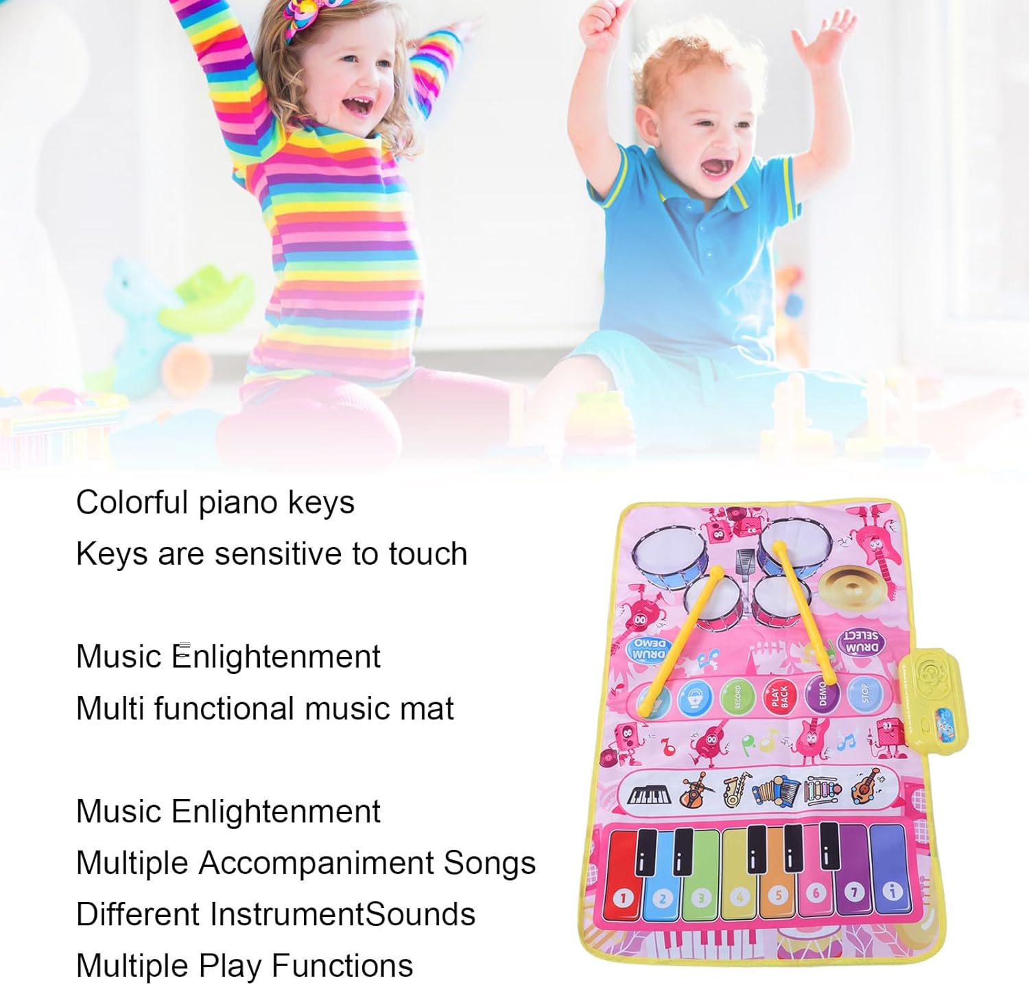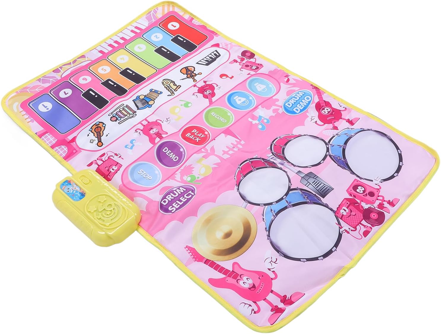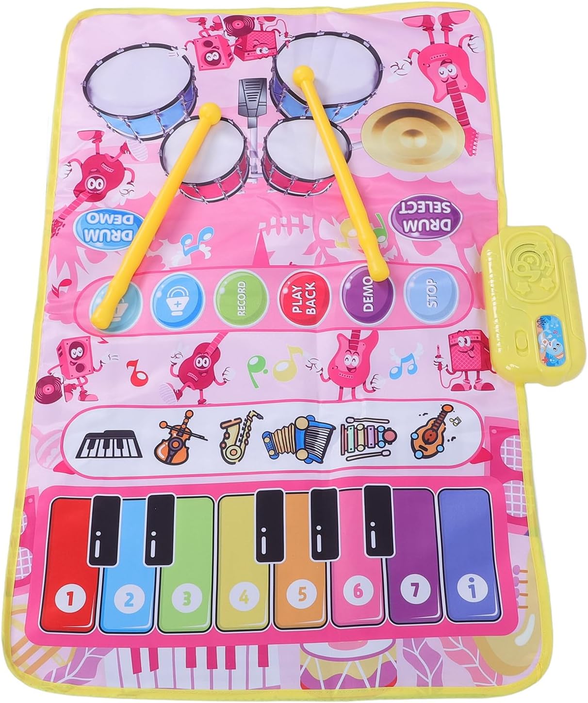 AMPIA AREA DI GIOCO INTERATTIVA: Misurando 80 x 50 cm, questo tappetino per offre ampio spazio per il divertimento di due musicisti. Il suo design promuove il divertimento mentre insegna concetti musicali, rendendolo la scelta ideale per insegnanti e genitori per impegnarsi in giochi intergenerazionali e apprendimento interattivo PRESENTAZIONE DELLE FUNZIONI: Il tappetino dispone di varie modalità, tra cui pausa (STOP), dimostrazione di 13 brani demo (DEMO), riproduzione di performance registrate (PLAYBACK), registrazione fino a 100 note o suoni di batteria (RECORD) e regolazione del volume (± ). I suoni della batteria possono essere modificati tramite il tasto DRUMSELECT CONTROLLO DEL VOLUME E FUNZIONALITÀ: il tappetino musicale include pulsanti per arresto, demo, registrazione, riproduzione e controllo del volume. La modalità demo riproduce 13 canzoni per bambini, consentendo ai bambini di creare ed eseguire la propria musica mentre interagiscono con i genitori, e il controllo del volume assicura una piacevole esperienza uditiva per tutti MATERIALE PLASTICO ROBUSTO: Realizzato in plastica di qualità, questo tappetino musicale è progettato per durare e longevità. Richiede 3 batterie AA (non incluse) per il funzionamento, garantendo che tuo figlio possa godersi ore di creatività ed esplorazione musicale TAPPETO PER PIANO E BATTERIA 2 IN 1: Il nostro tappetino per e batteria 2 in 1 per bambini presenta un'area per con 13 tasti che producono suoni da 5 strumenti diversi (pianoforte, violino, fisarmonica, chitarra), nonché un tappetino per batteria che genera 3 suoni di batteria accompagnati da 2 bacchette leggere per un divertimento senza fine