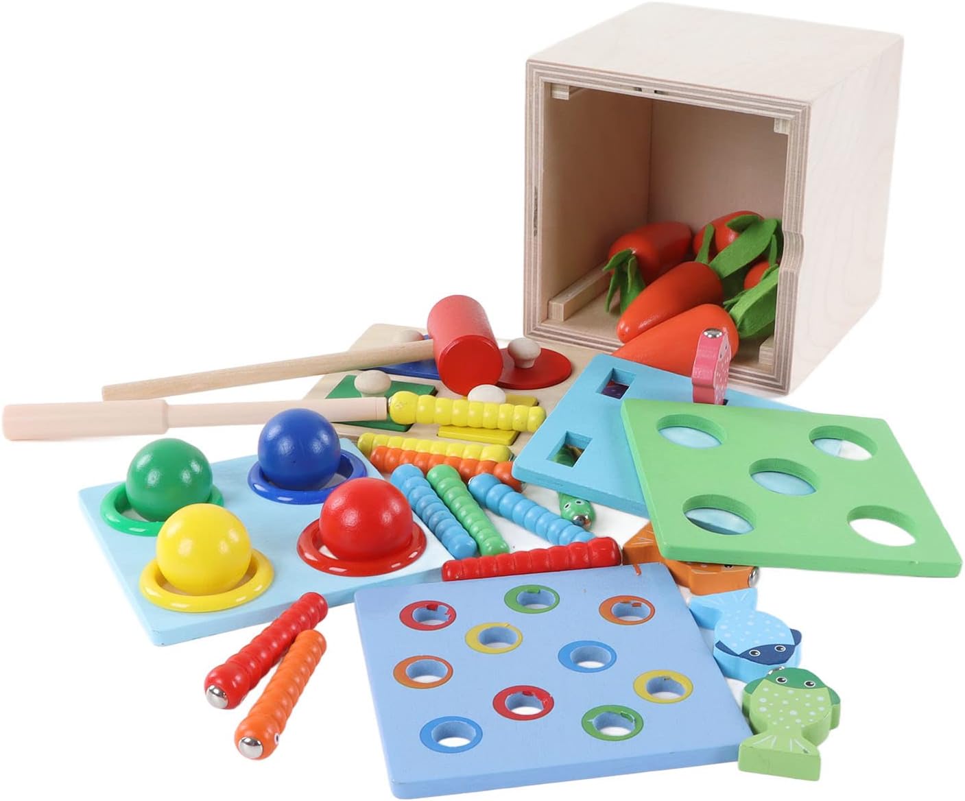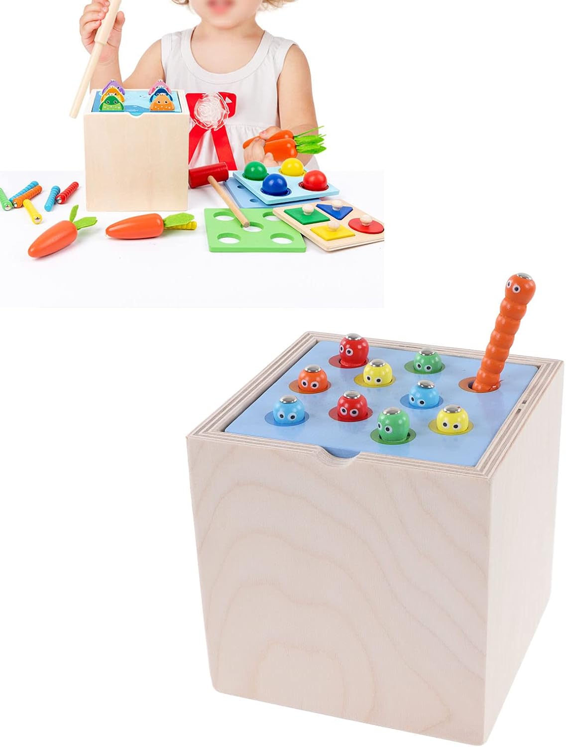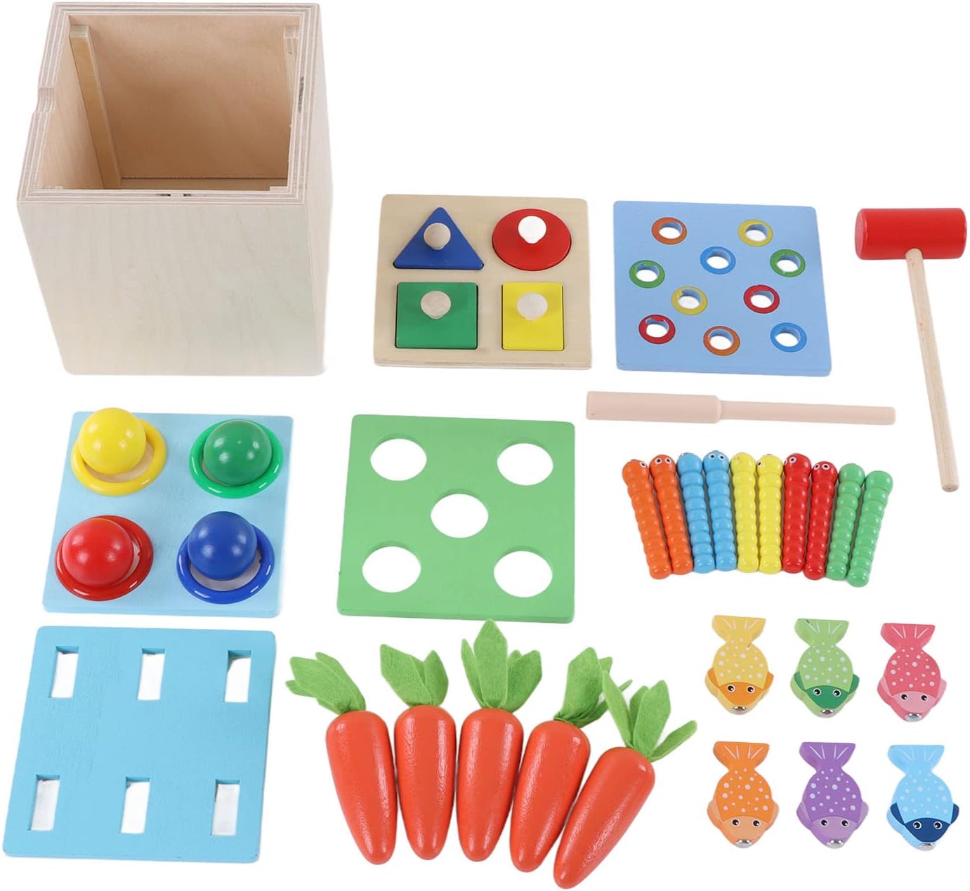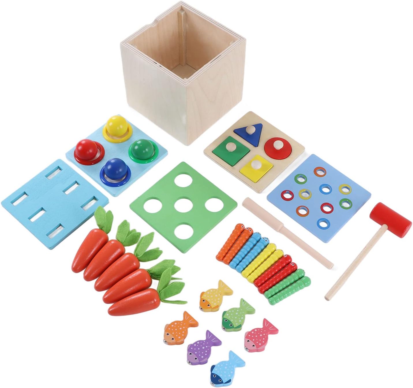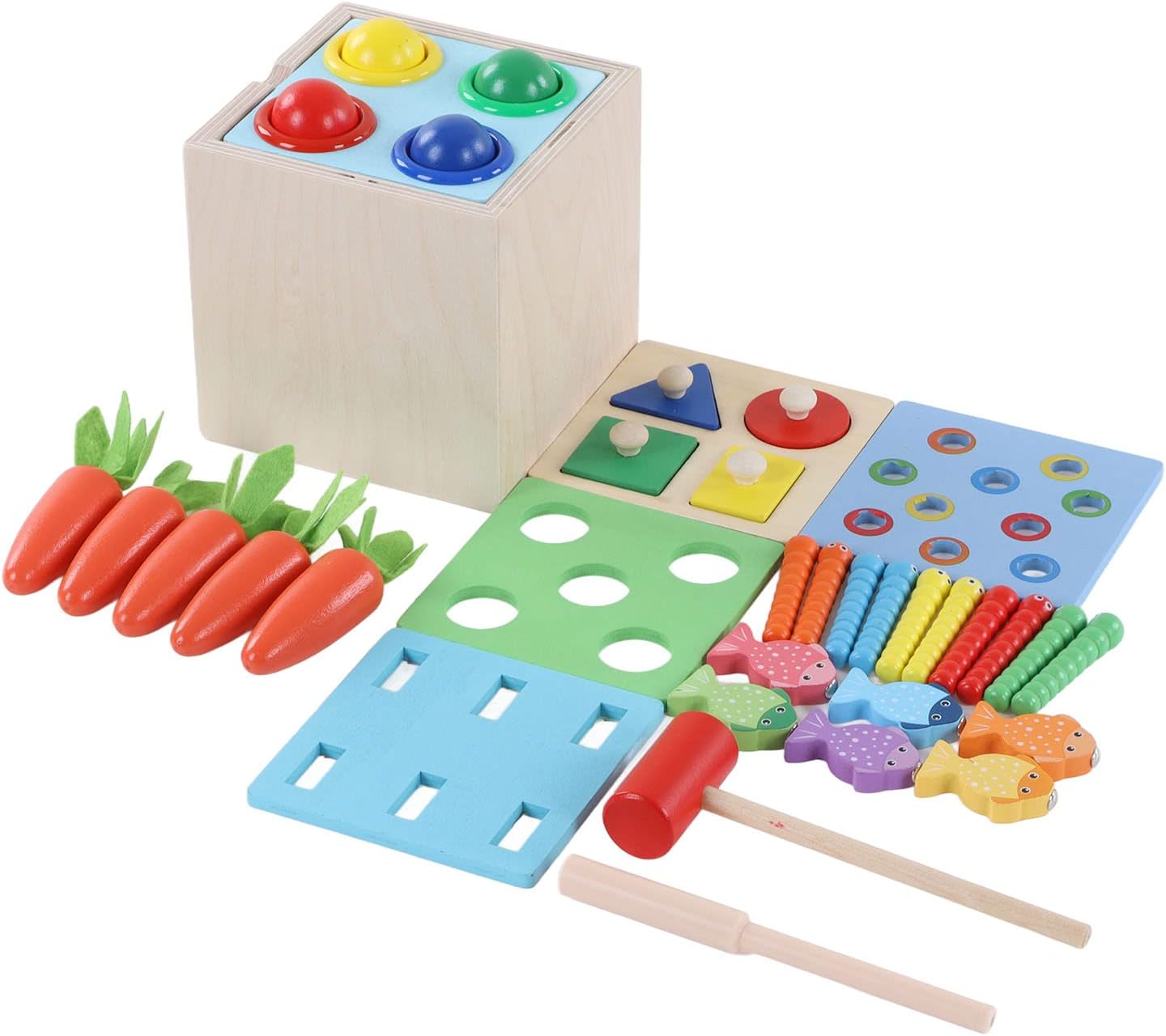 Pregevole fattura: utilizzo di pregevole fattura, levigatura e non fa male alle manine, colori vivaci, bellissimi motivi. Giocattolo in scatola di percussioni in legno: giocattoli in legno 5 in 1 per la prima educazione, esperienza di pesca divertente, gioco a bussare di palline a quattro colori, gioco di estrazione di ravanelli, puzzle di abbinamento di forme, gioco di cattura di insetti. Educativo: esercitare il periodo sensibile sensoriale, esercitare l'abilità pratica, migliorare la coordinazione occhio-mano dei bambini. Materiali di alta qualità: realizzati in tiglio, sono resistenti, durevoli, inodori e hanno una lunga durata. Scatola portaoggetti: dotata di una scatola portaoggetti, è un giocattolo per la prima educazione per coltivare buone abitudini di conservazione.