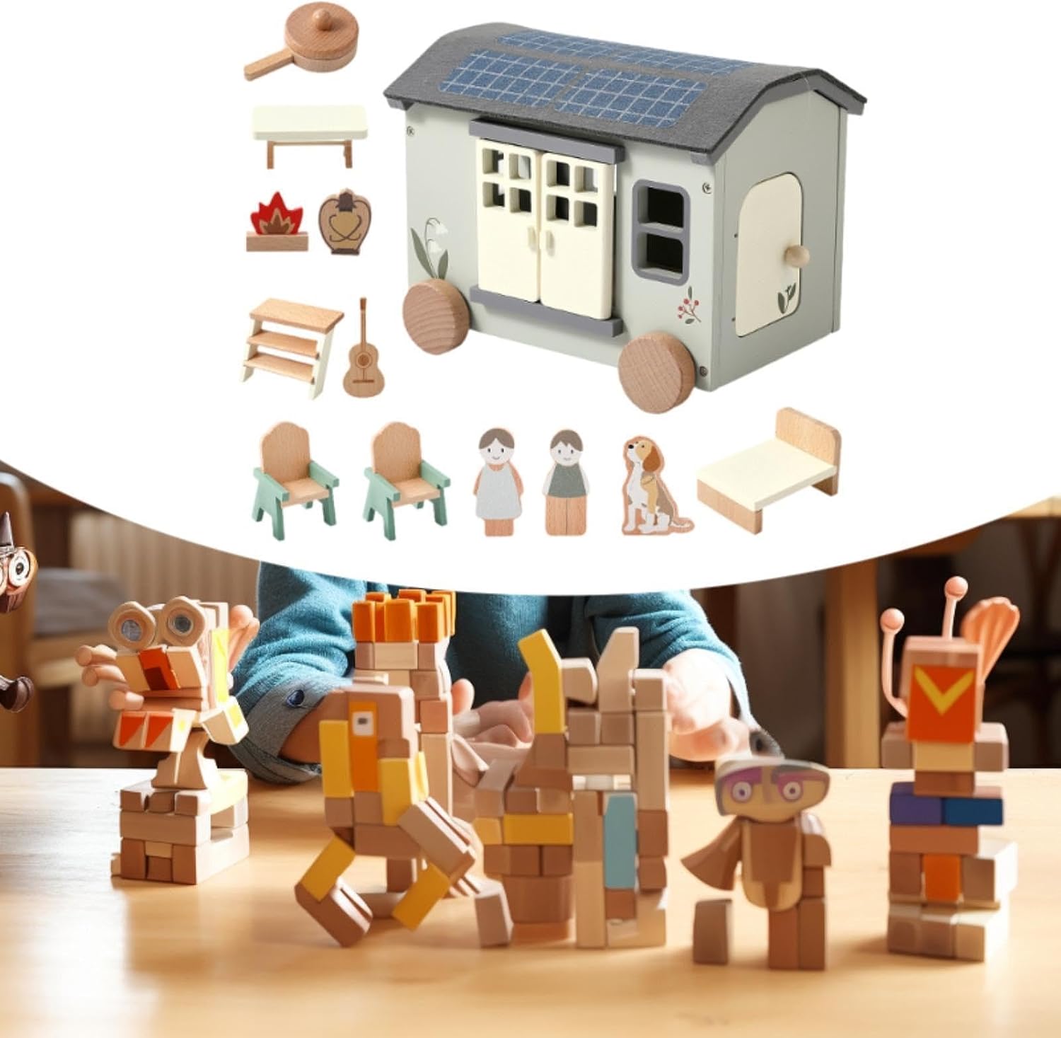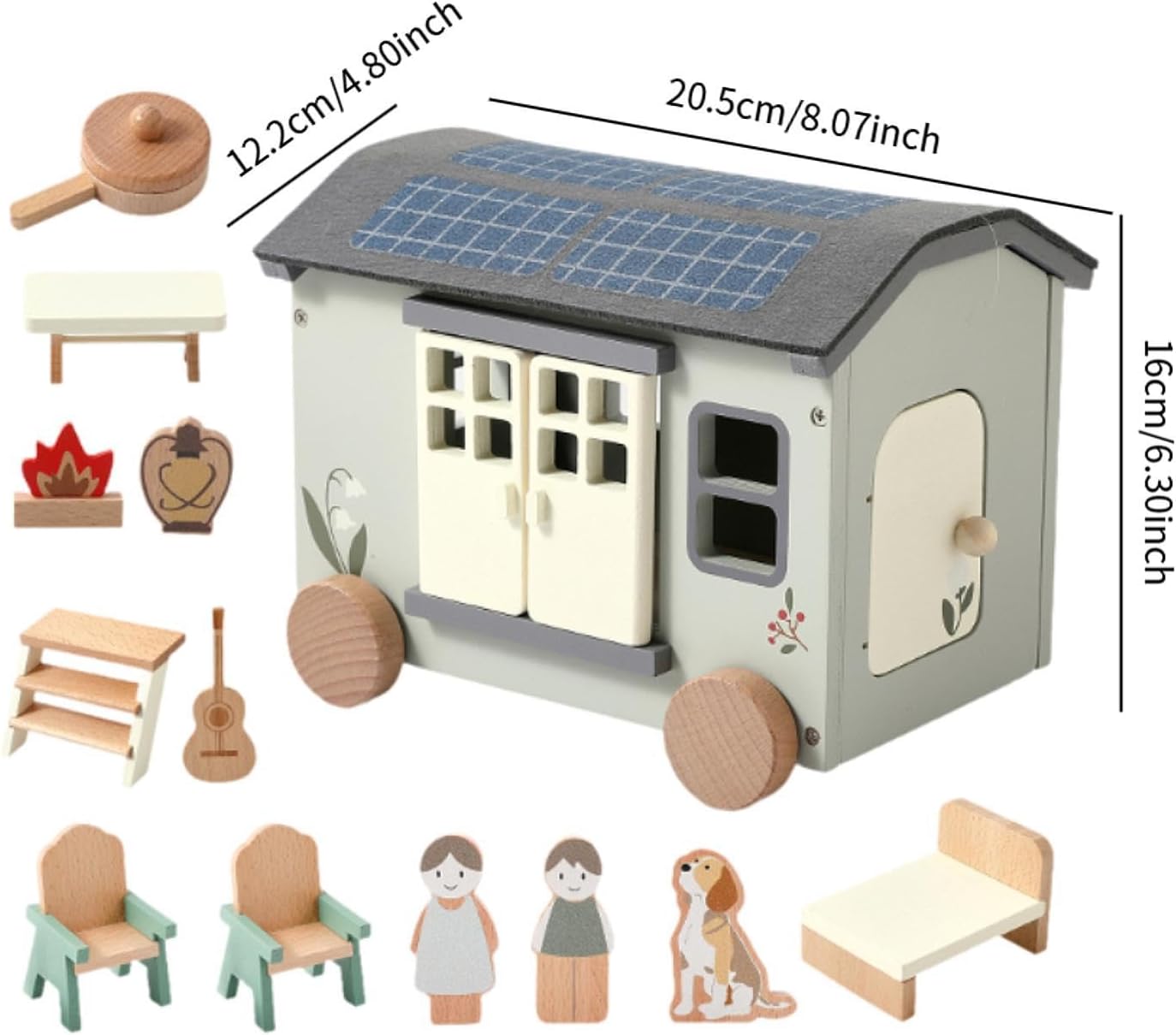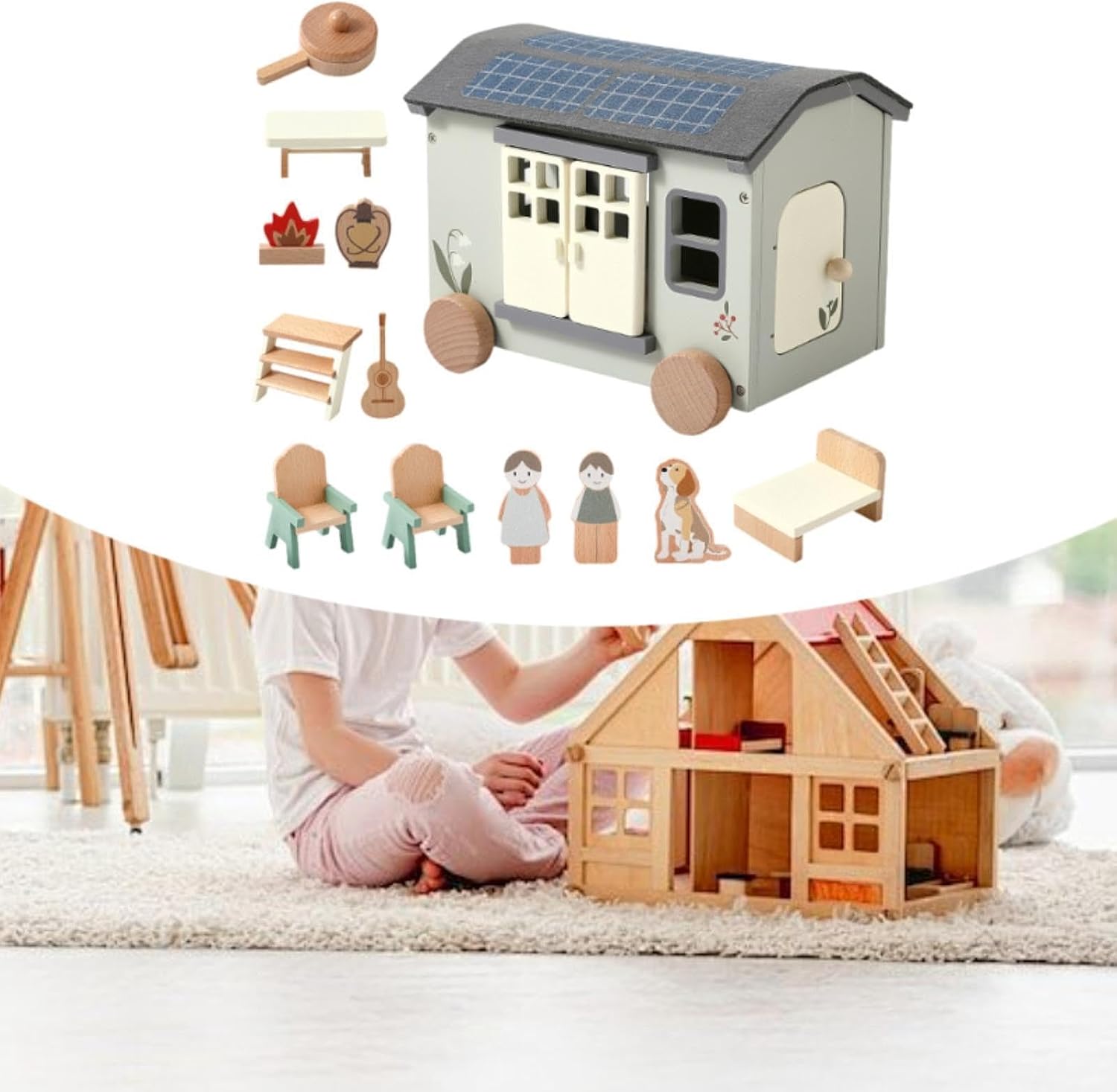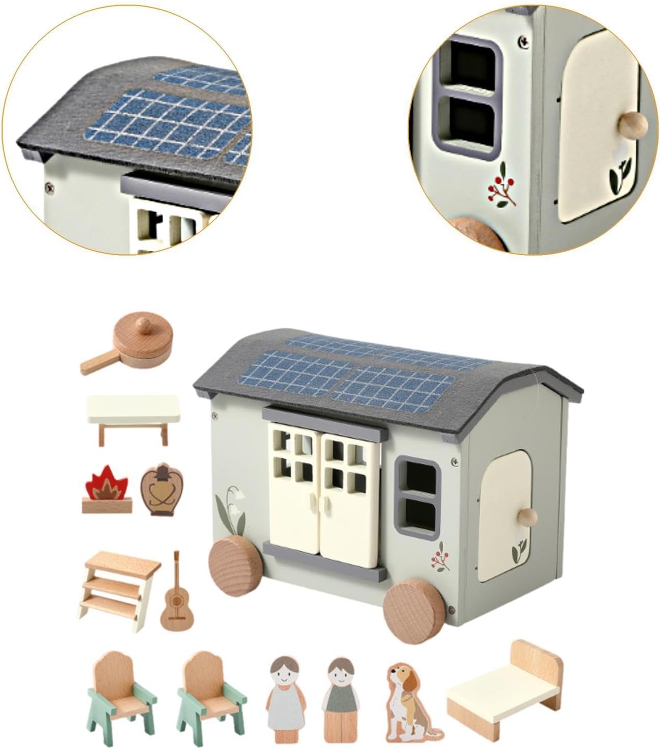 【Gioco di ruolo fantasioso】Questo set da campeggio per giocattolo in legno infinite storie creative e scenari di gioco di ruolo , migliorando le abilità sociali ed emotive 【Sviluppo pratico del cervello】I bambini sistemano i mobili, organizzano i layout e manipolano piccoli accessori, migliorano le capacità motorie fini e la risoluzione dei problemi 【Qualità Premium】Realizzato in legno di qualità con bordo liscio, rispettoso dell'ambiente, garantisce durata per ore di divertimento creativo, gioco sicuro per i bambini piccoli 【Giocattolo di finzione per bambini】Progettato per il gioco fantasioso, questo set di giocattoli in legno incoraggia i bambini a sviluppare abilità pratiche e cognitive mentre si divertono con scenari di finta casa e campeggio in . 【Design realistico】Presenta un campeggio RV realistico come un tavolo, sedie, letti, utensili da cucina, chitarra, falò e bambole, offrendo un'esperienza di gioco di simulazione coinvolgente e